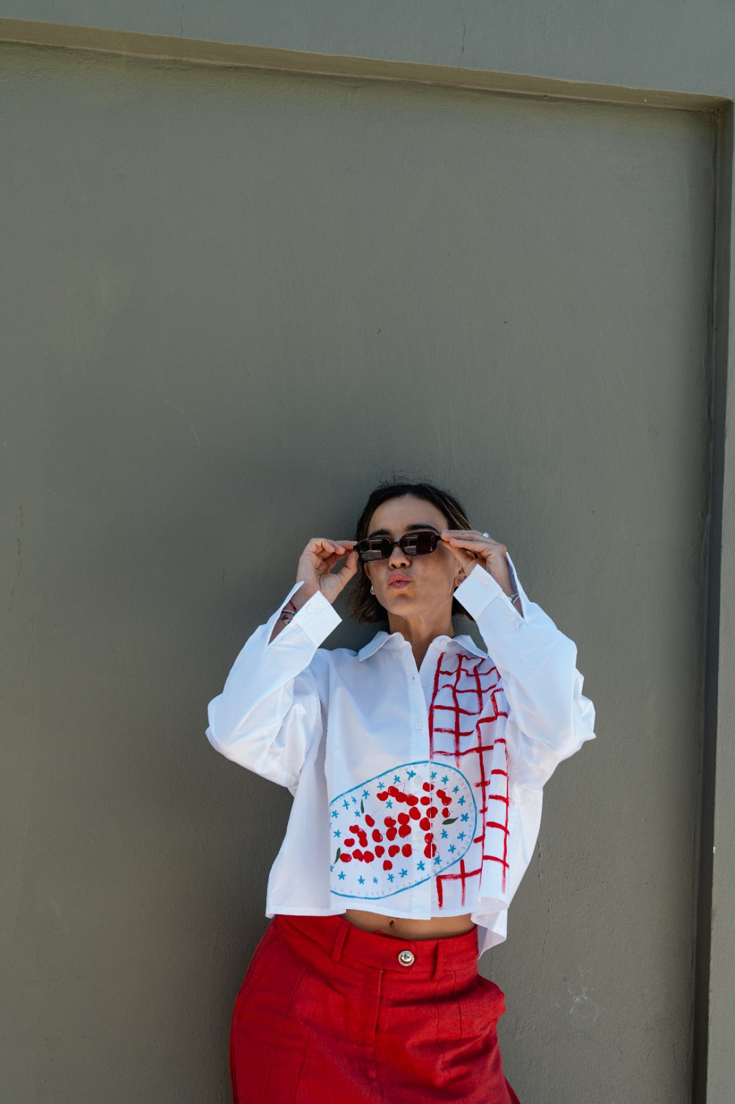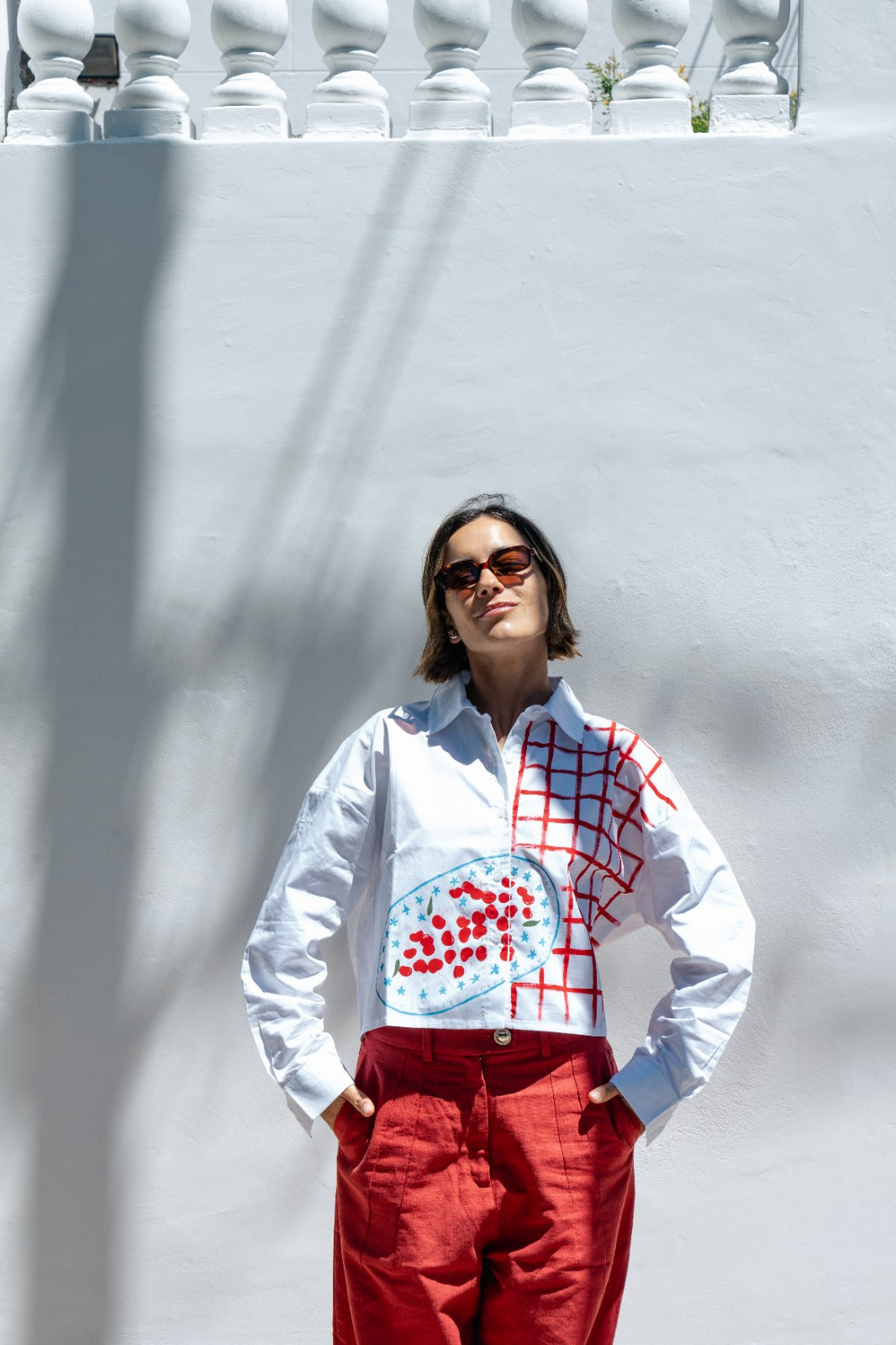 Camisa manga larga, confeccionada en poplín. Posee tabla en canesú espalda y detalle exclusivo de pintado a mano. Fit cuadrado y amplio, largo cropped. Composición: 100% algodón.