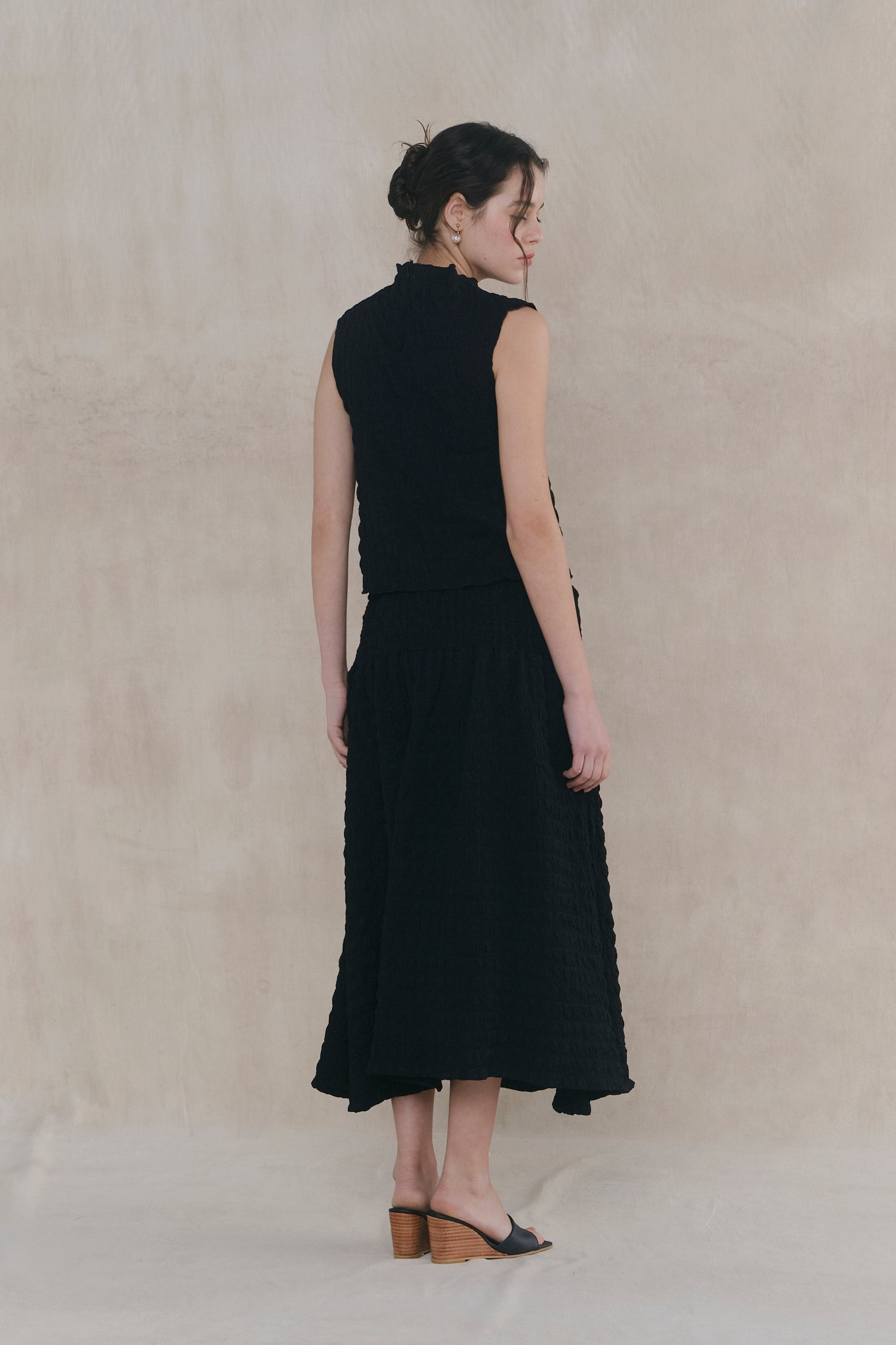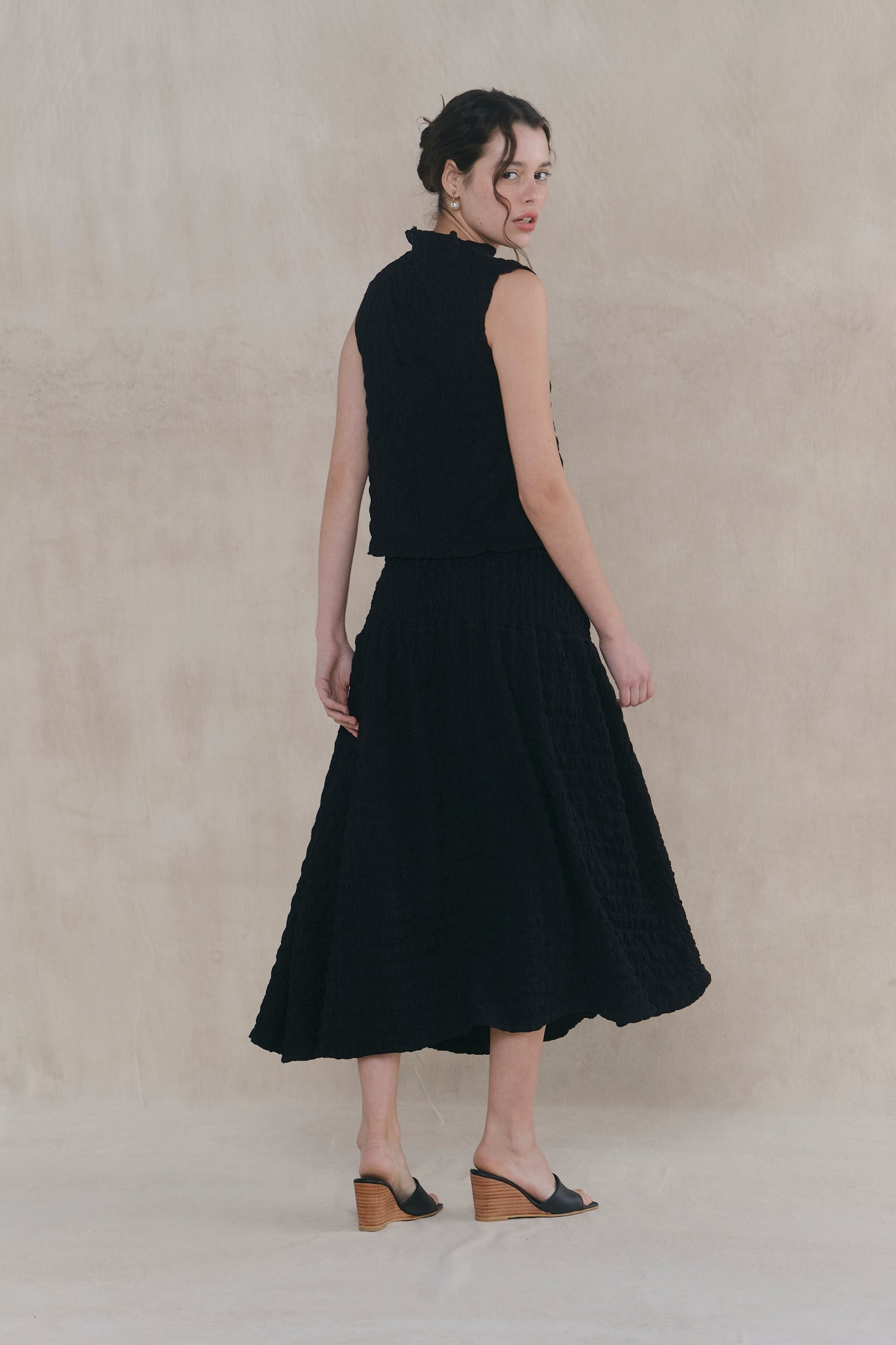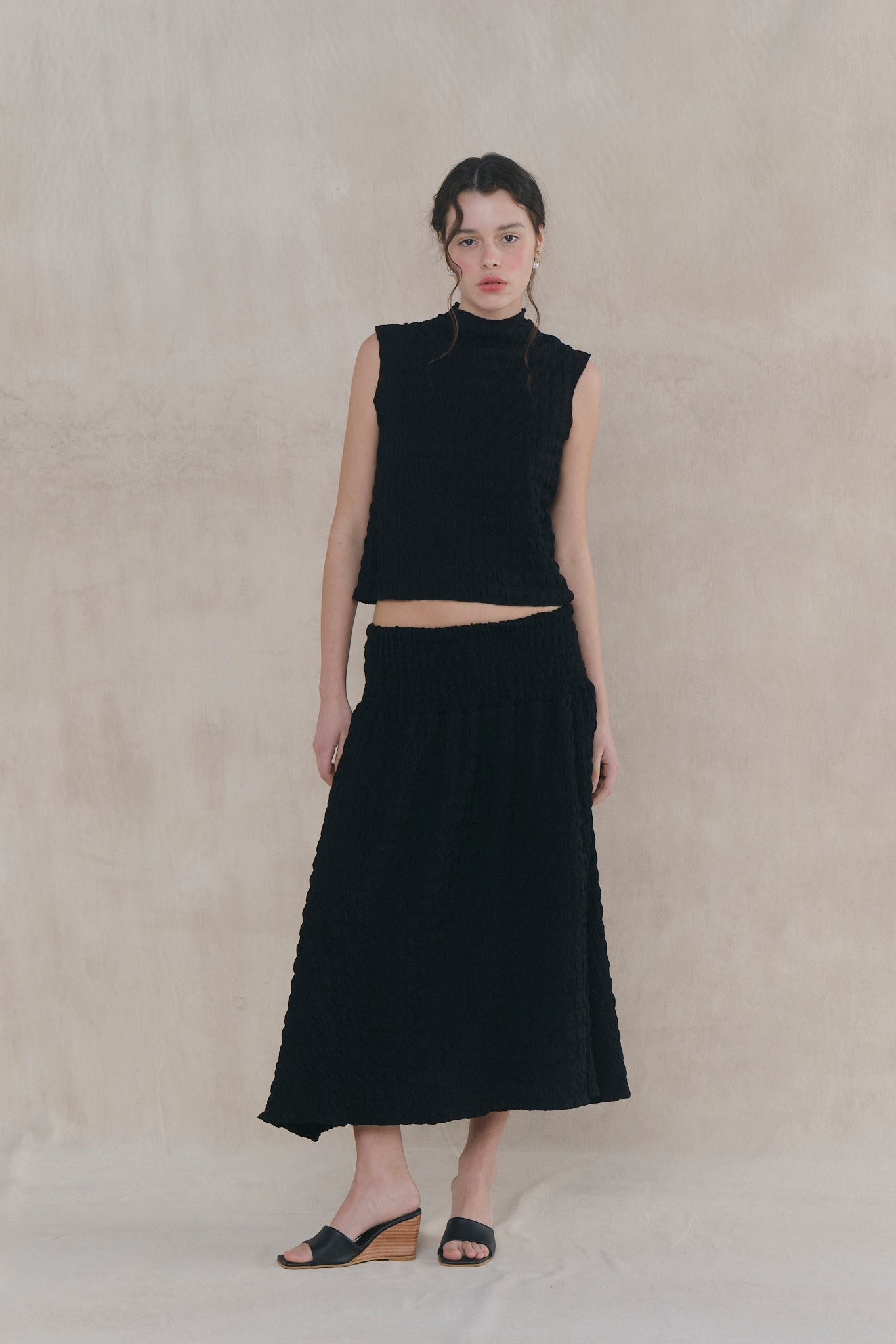 Falda confeccionada en tramado elastizado tipo cloque. Tiro medio y largo midi, cintura elastizada con hilo elástico para mayor comodidad y versatilidad en el calce.