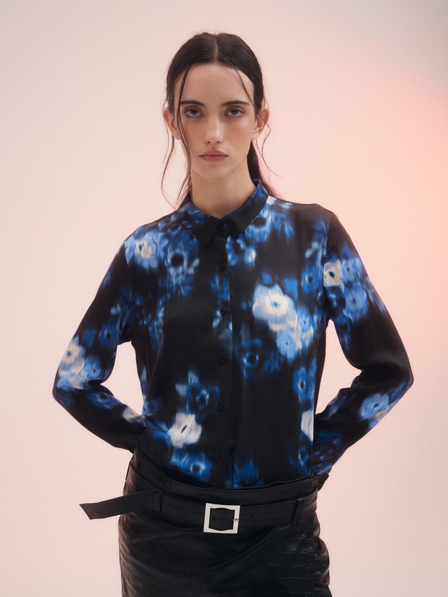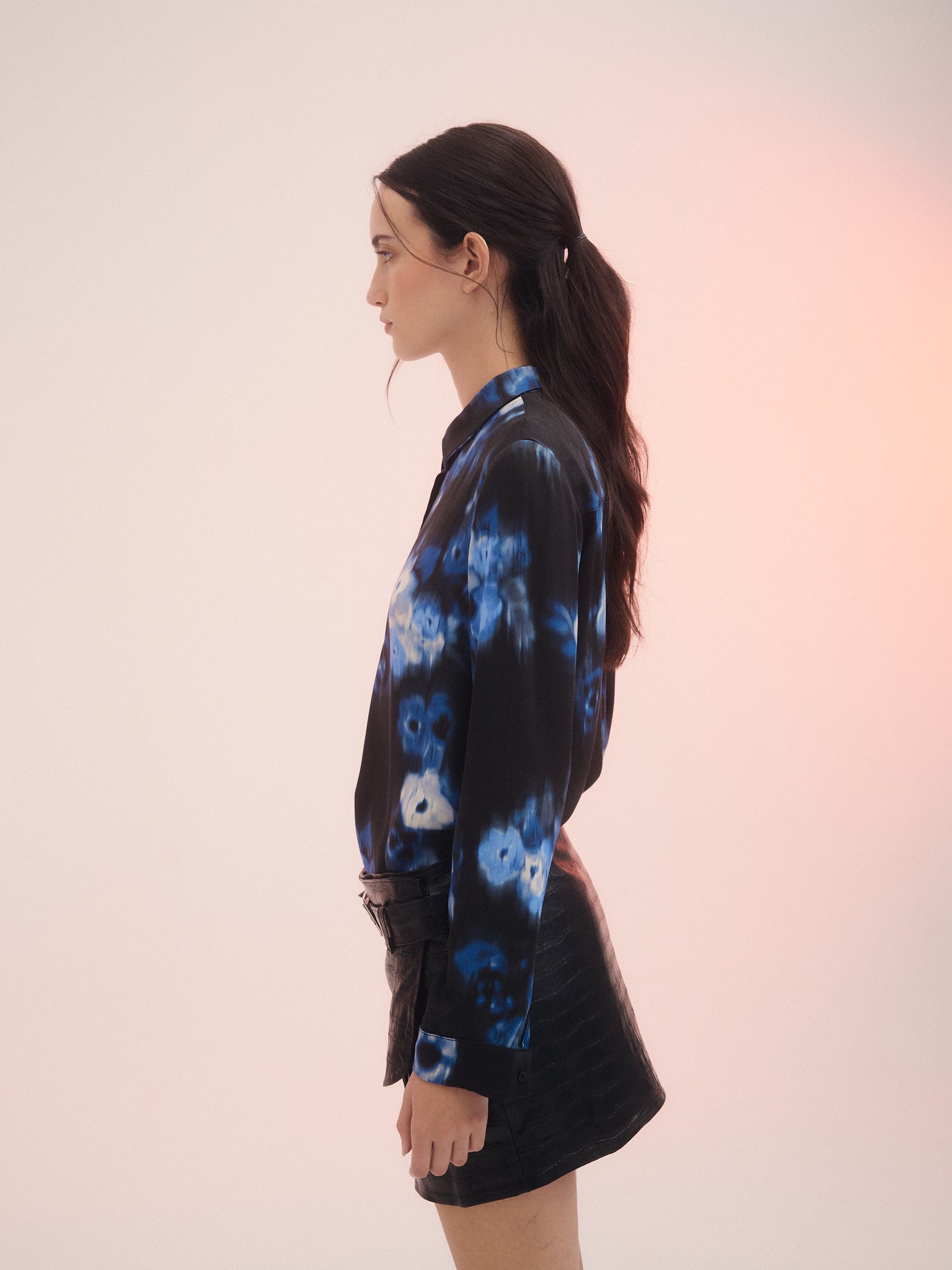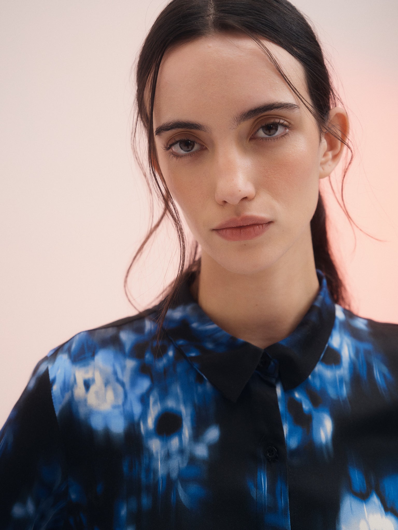 Camisa Abby, Confeccionada en 100% rayón con una estampa digital exclusiva de la colección DIFFUSE. Fit clásico y sofisticado. Posee manga larga y detalle de tajo y largo irregular en lateral. Ideal para agregar un toque de estilo y elevar cualquier look.