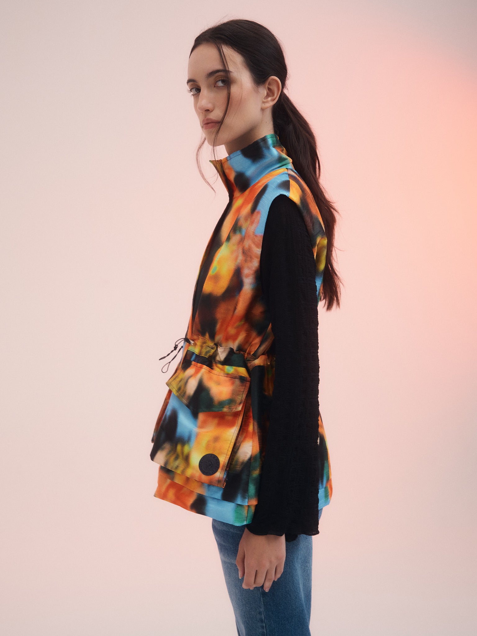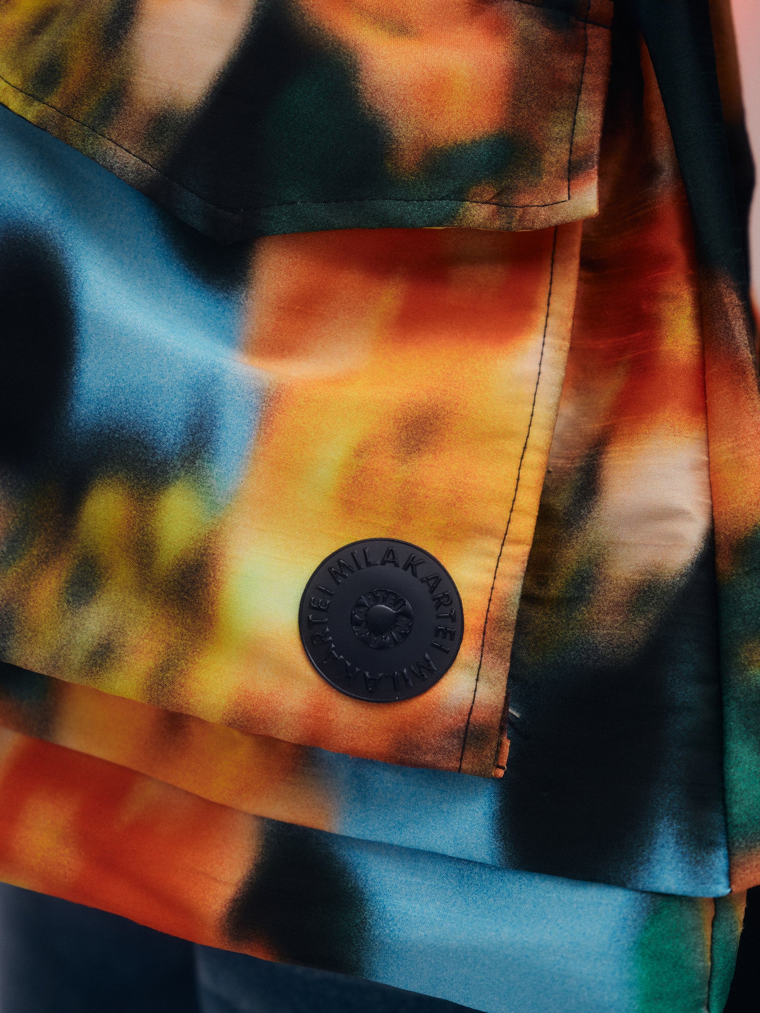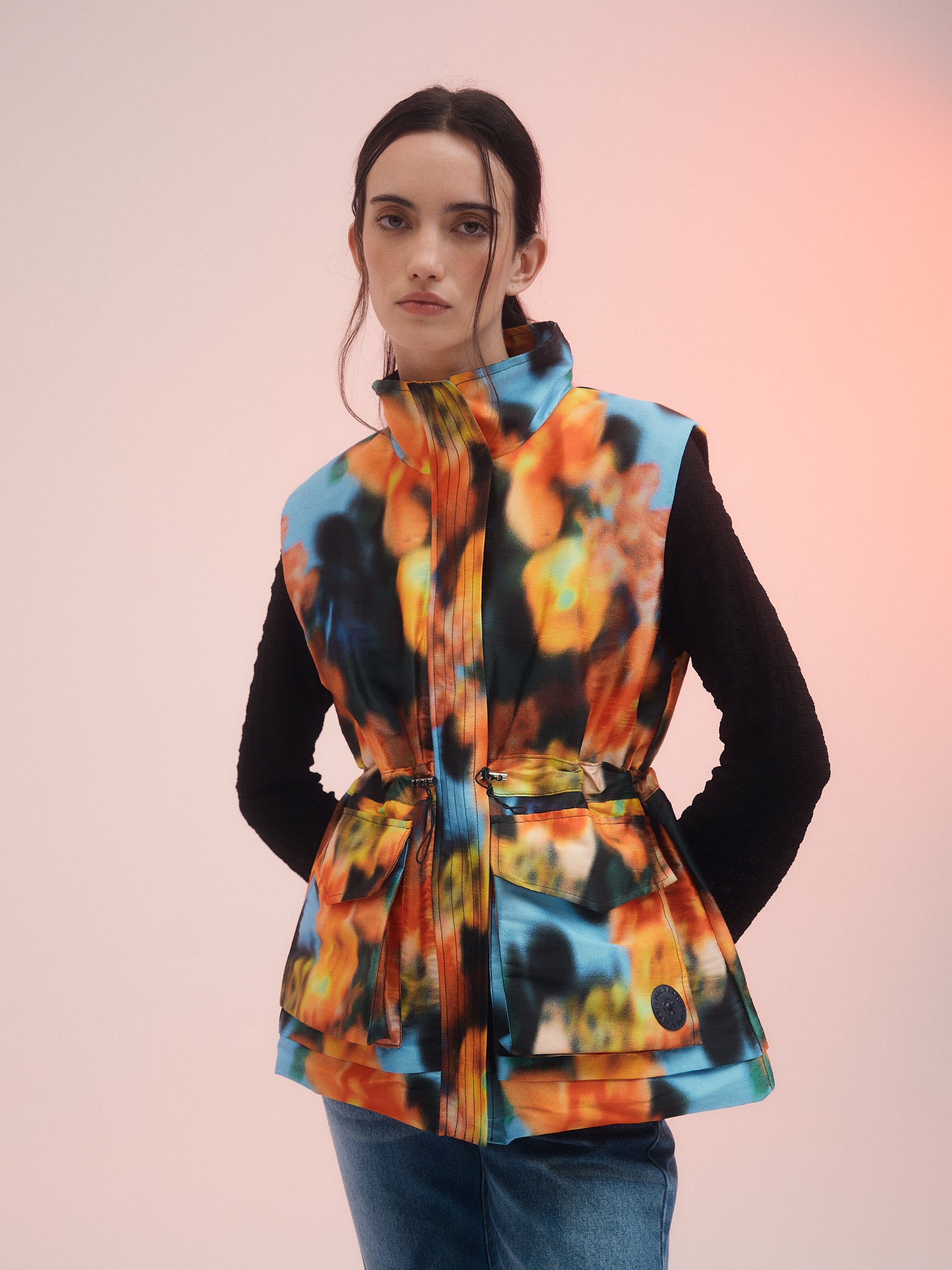 Confeccionado en shantung estampado con ilustración protagonista de la colección Aw25. Detalles deportivos como tancas, etiquetas de goma y avios personalizados. Acceso frontal mediante cierre. Se presenta con variados bolsillos y compartimentos lo que refuerza el caracter deportivo de la prenda.