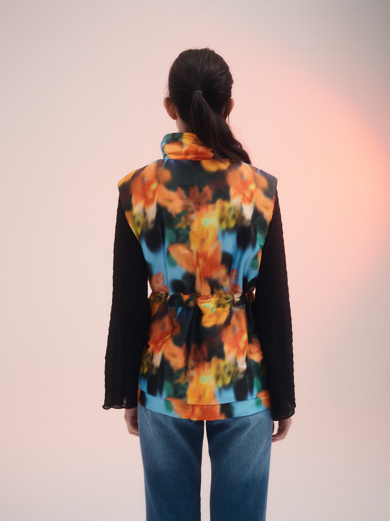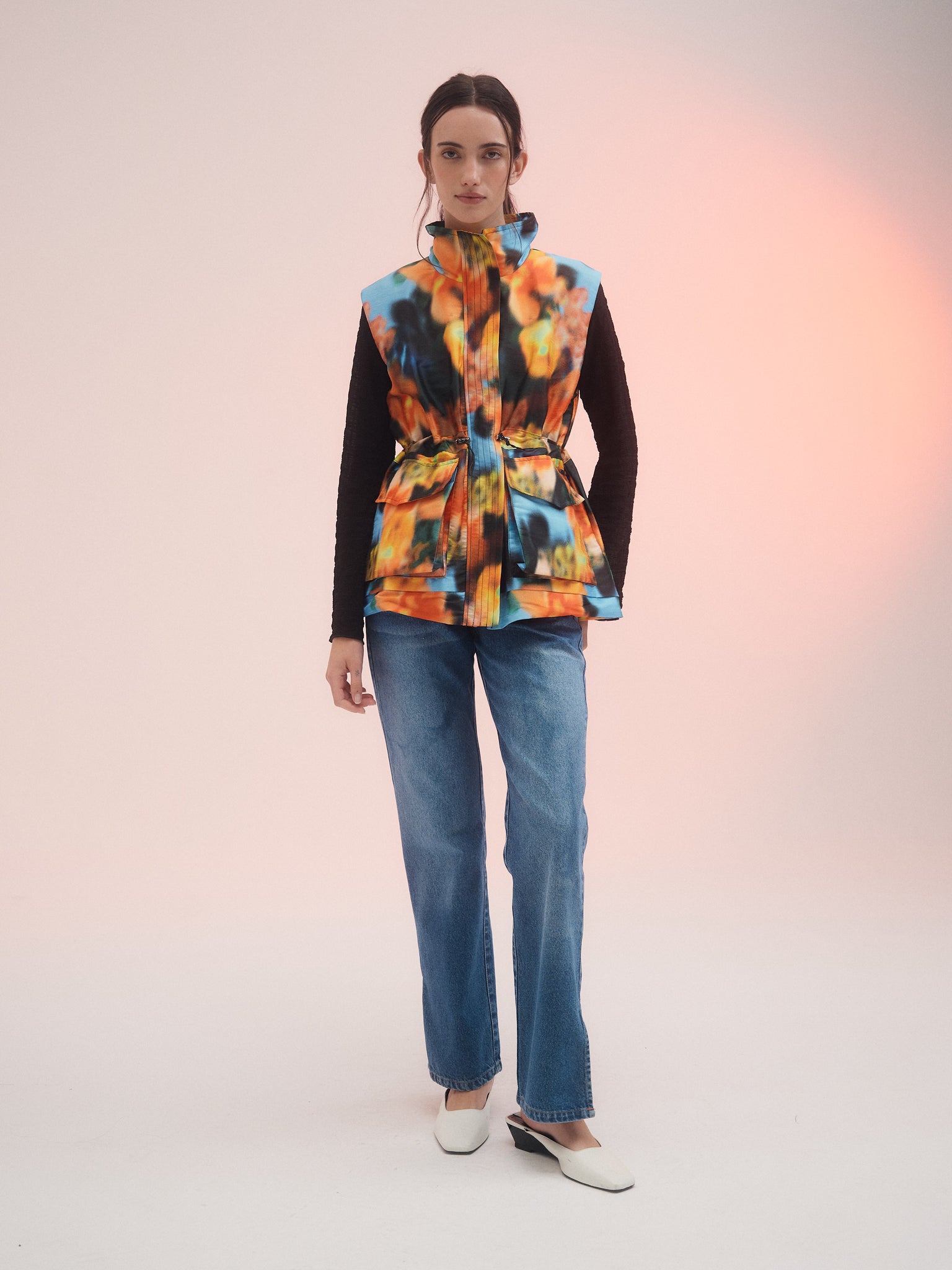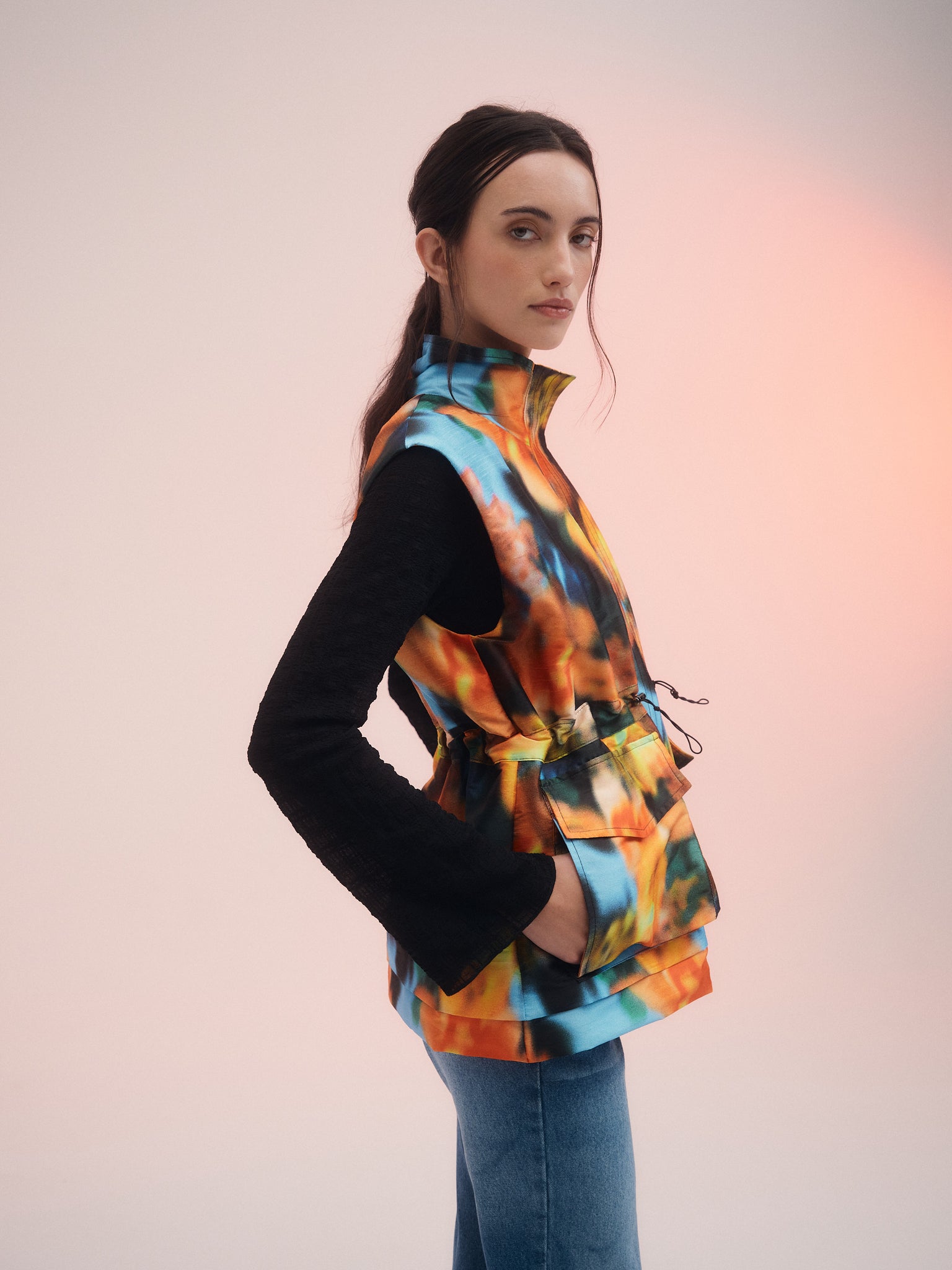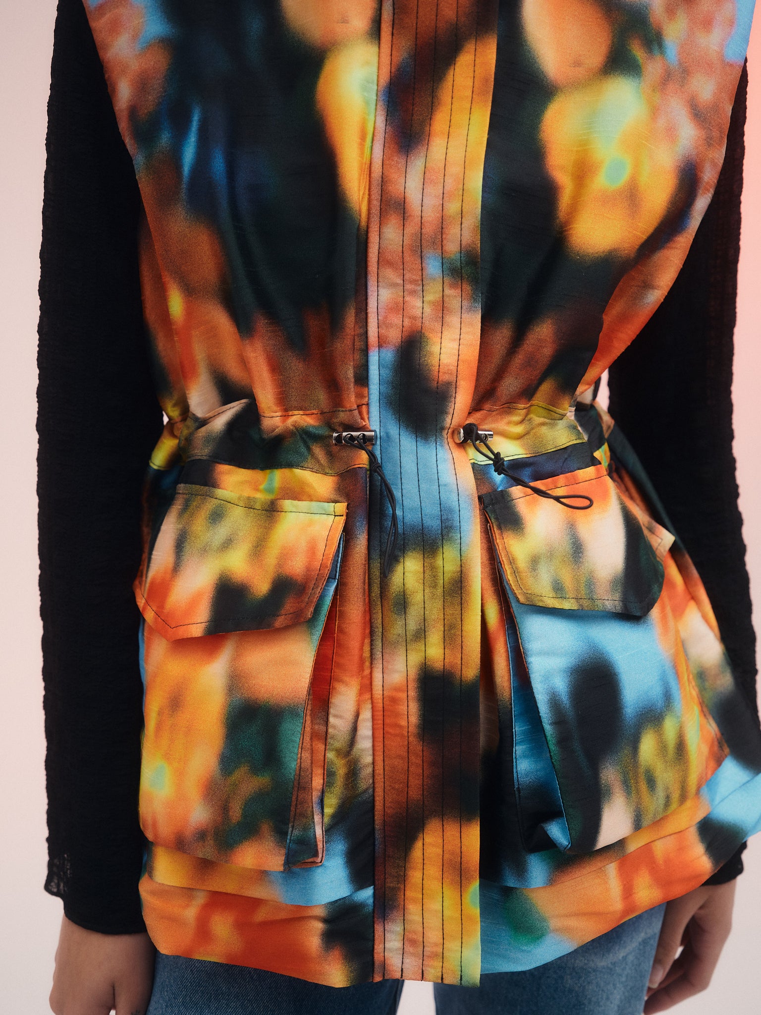 Confeccionado en shantung estampado con ilustración protagonista de la colección Aw25. Detalles deportivos como tancas, etiquetas de goma y avios personalizados. Acceso frontal mediante cierre. Se presenta con variados bolsillos y compartimentos lo que refuerza el caracter deportivo de la prenda.