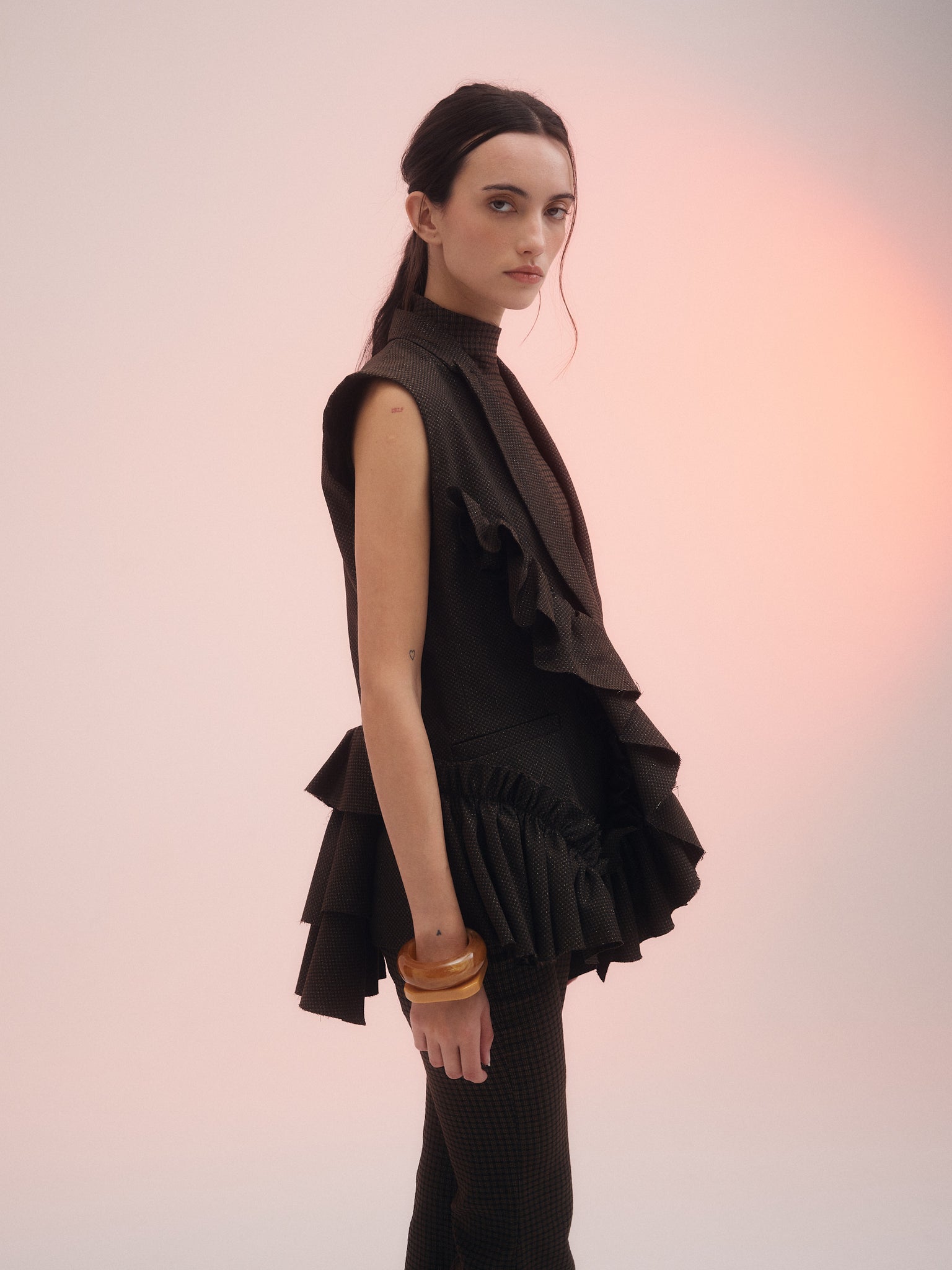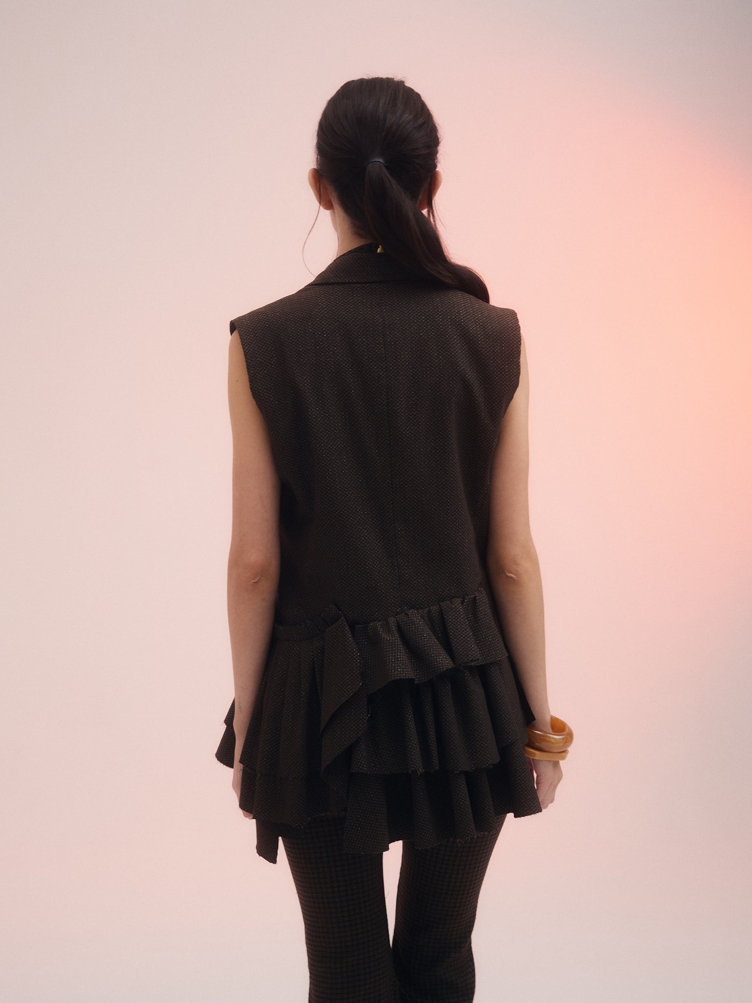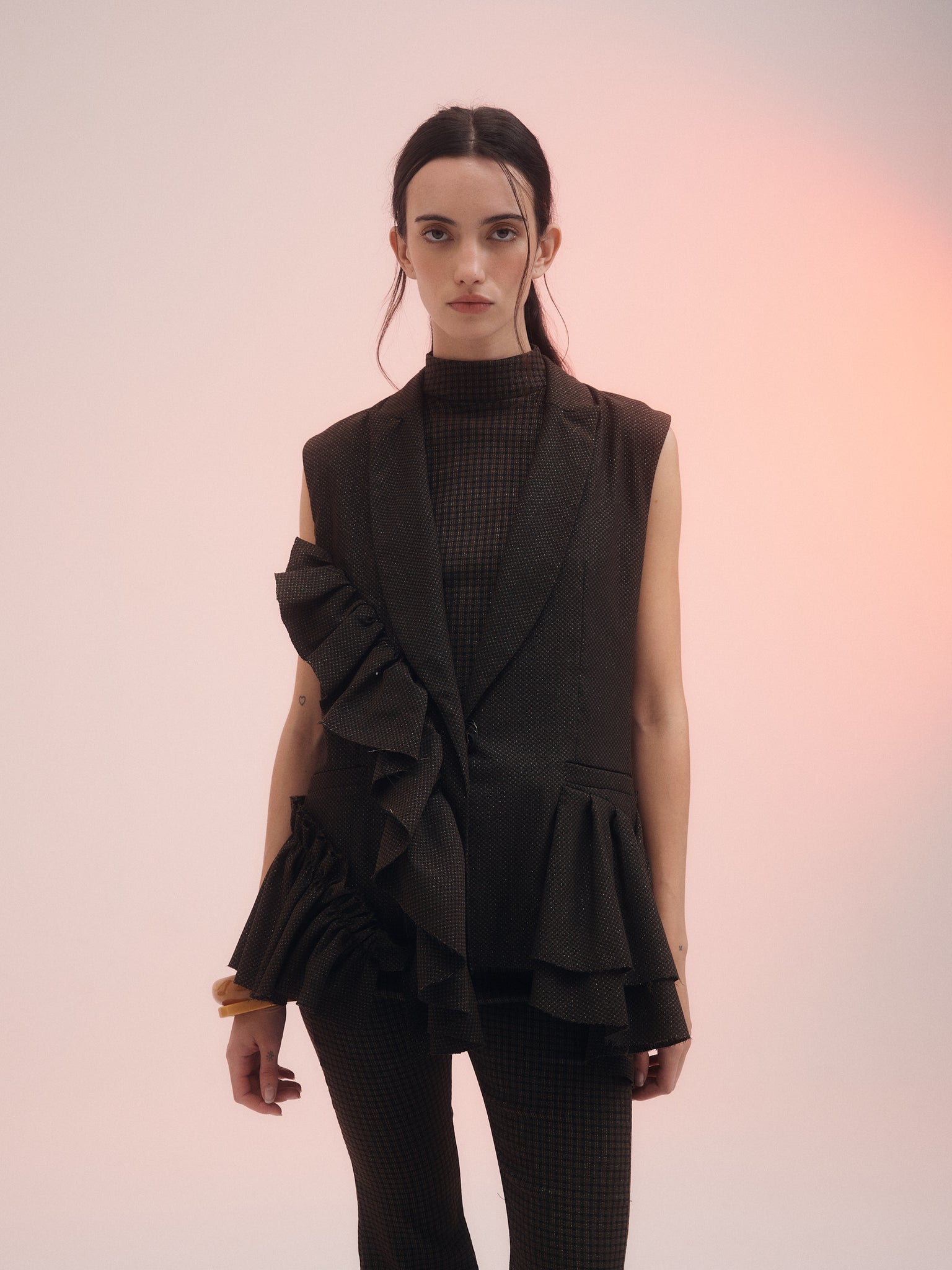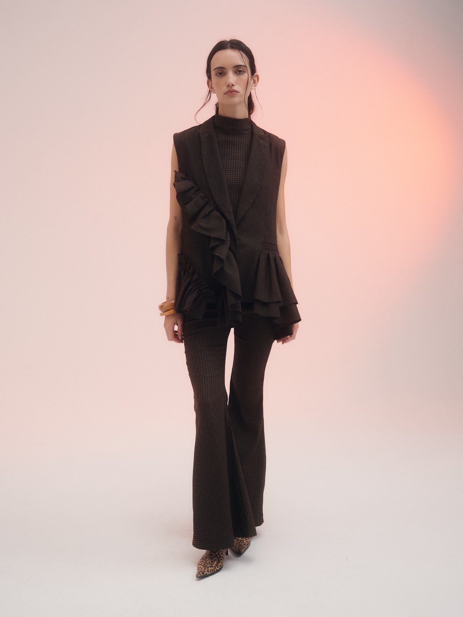 Chaleco Malva, una prenda icónica con corte sastrero y volados irregulares que le dan un toque de sofisticación. Confeccionado en jacard con lurex para un brillo exclusivo. Ideal para crear un look coordinado y elegante con pantalón y top Malva.