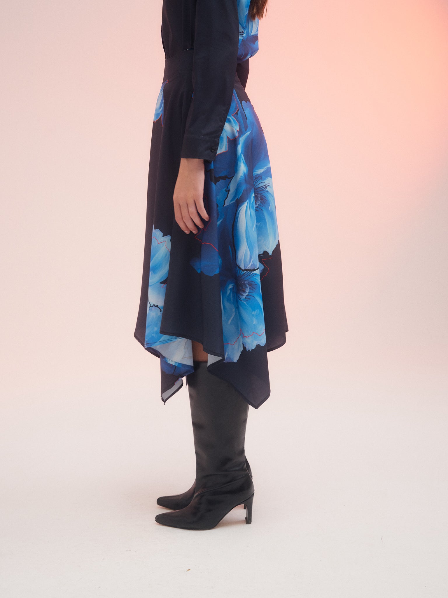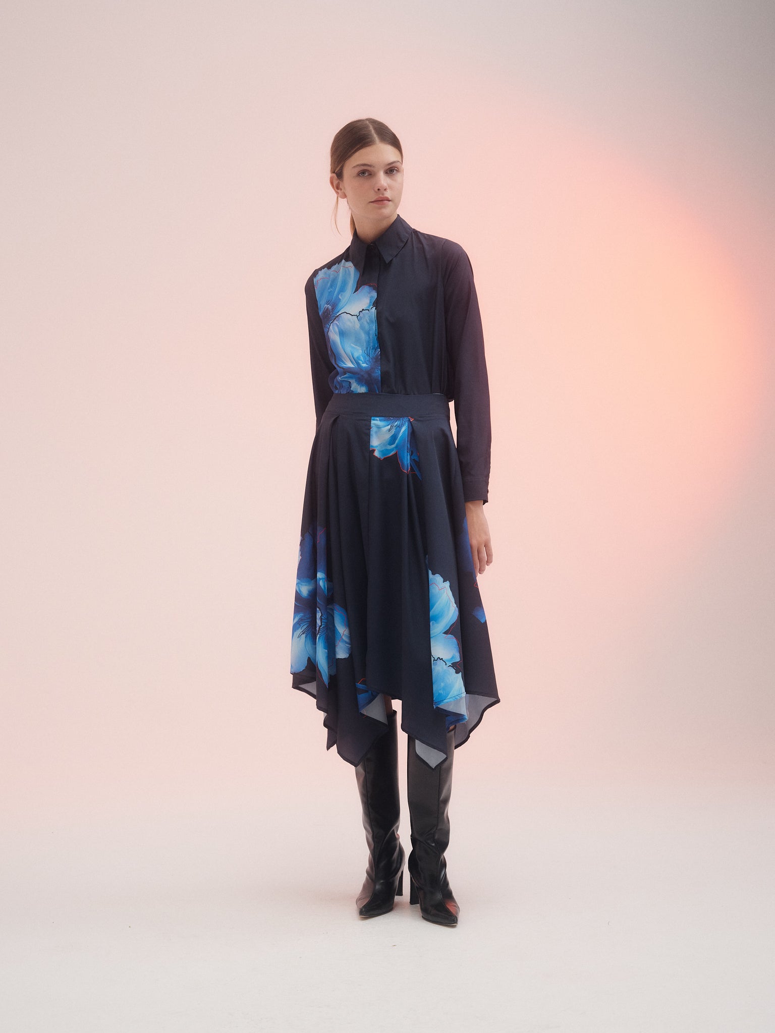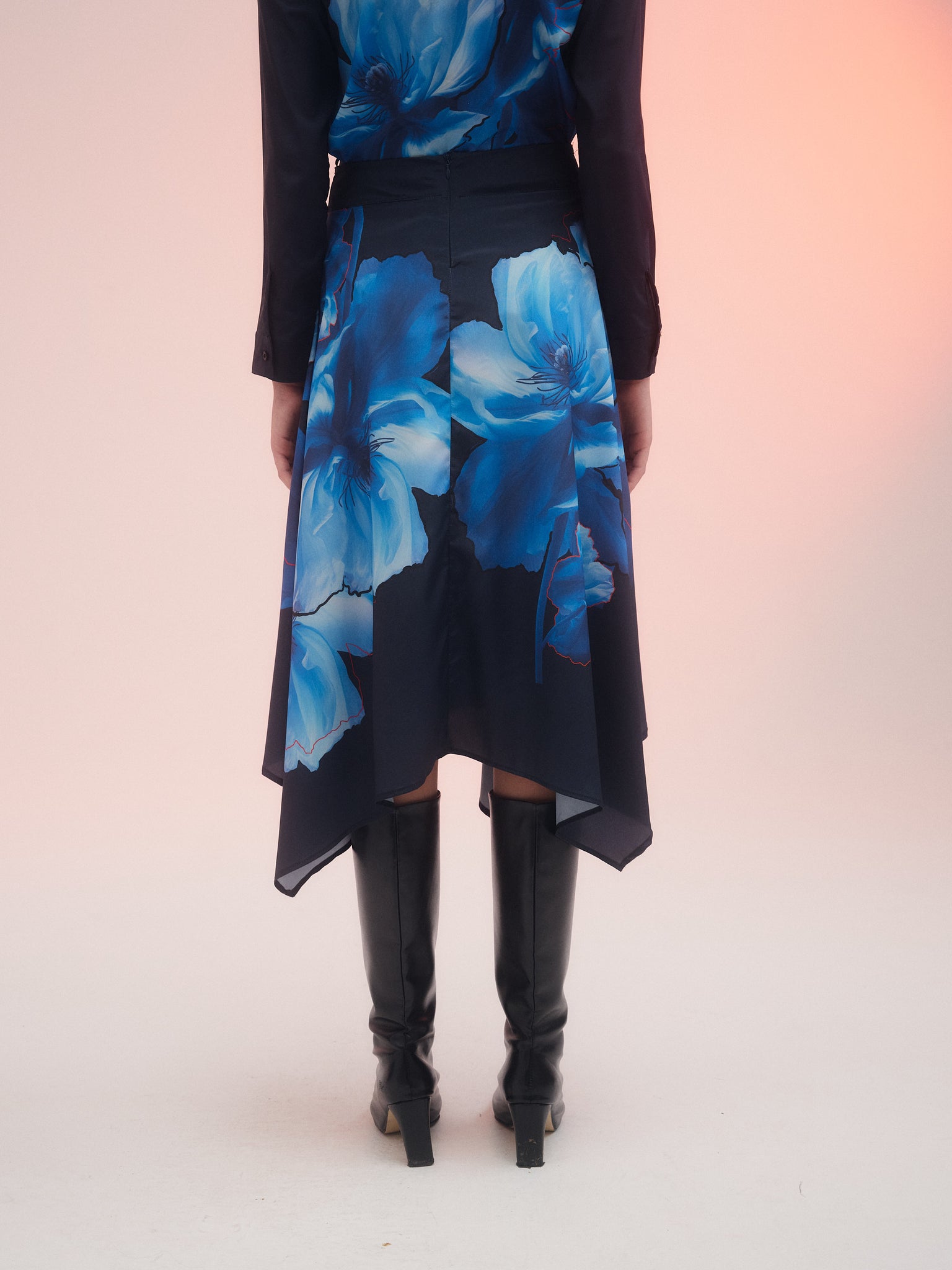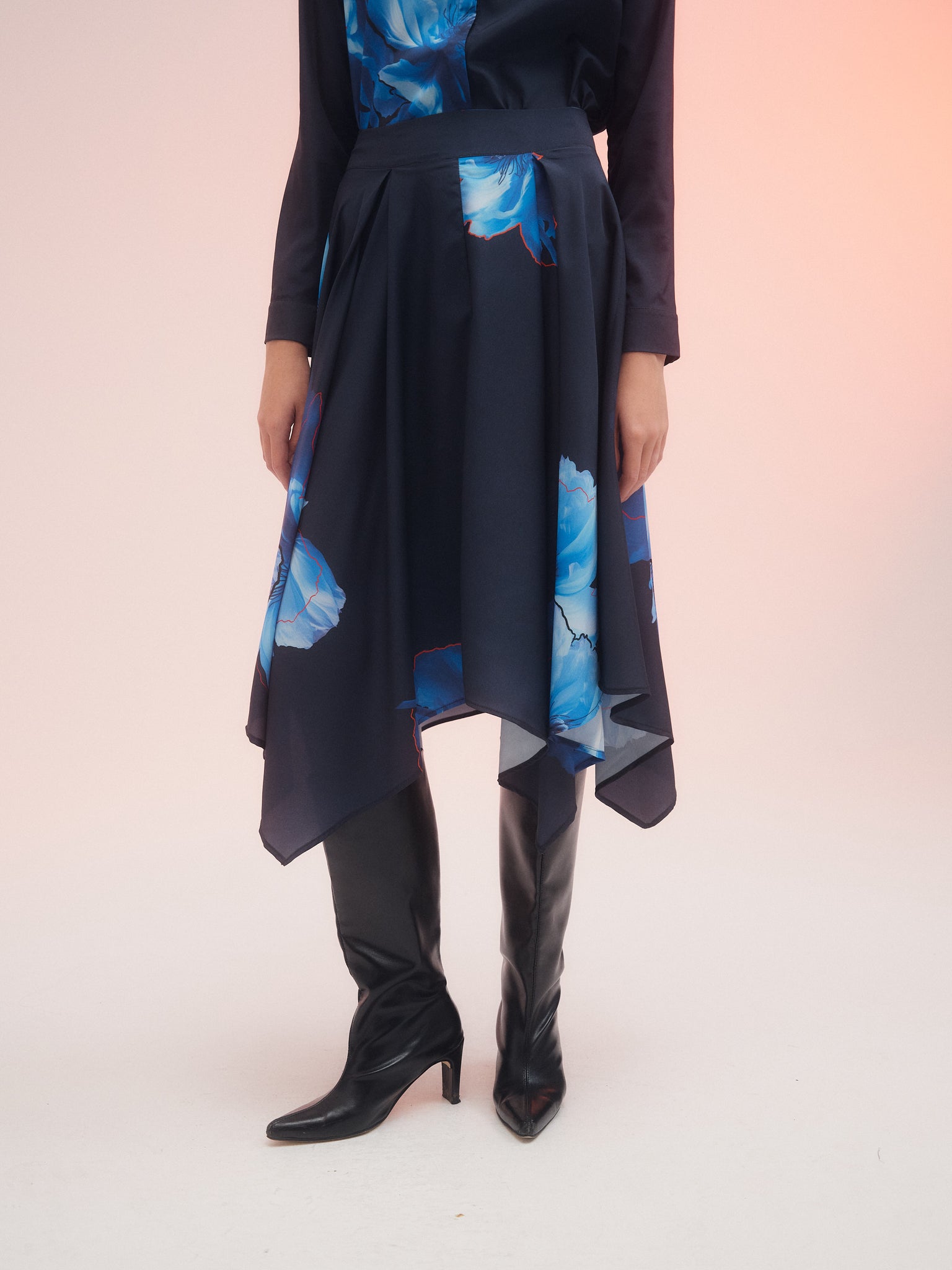 Falda Cosmos, falda midi confeccionada en crepé estampado con ilustracion exclusiva de la temporada aw25. Diseño con picos y tablas en cintura. Ideal para combinar con camisa Cosmos para un total look.
