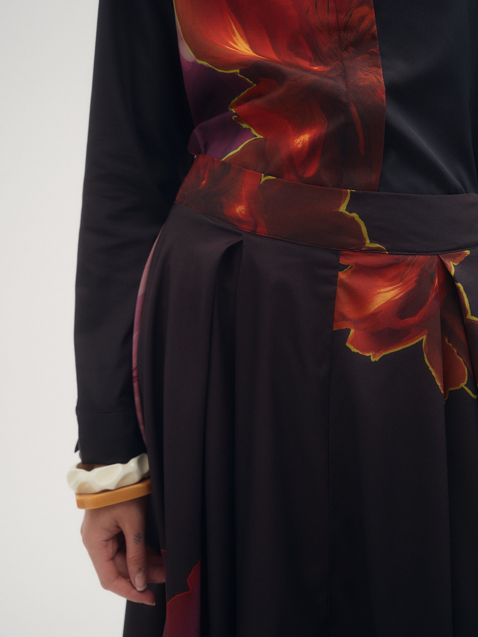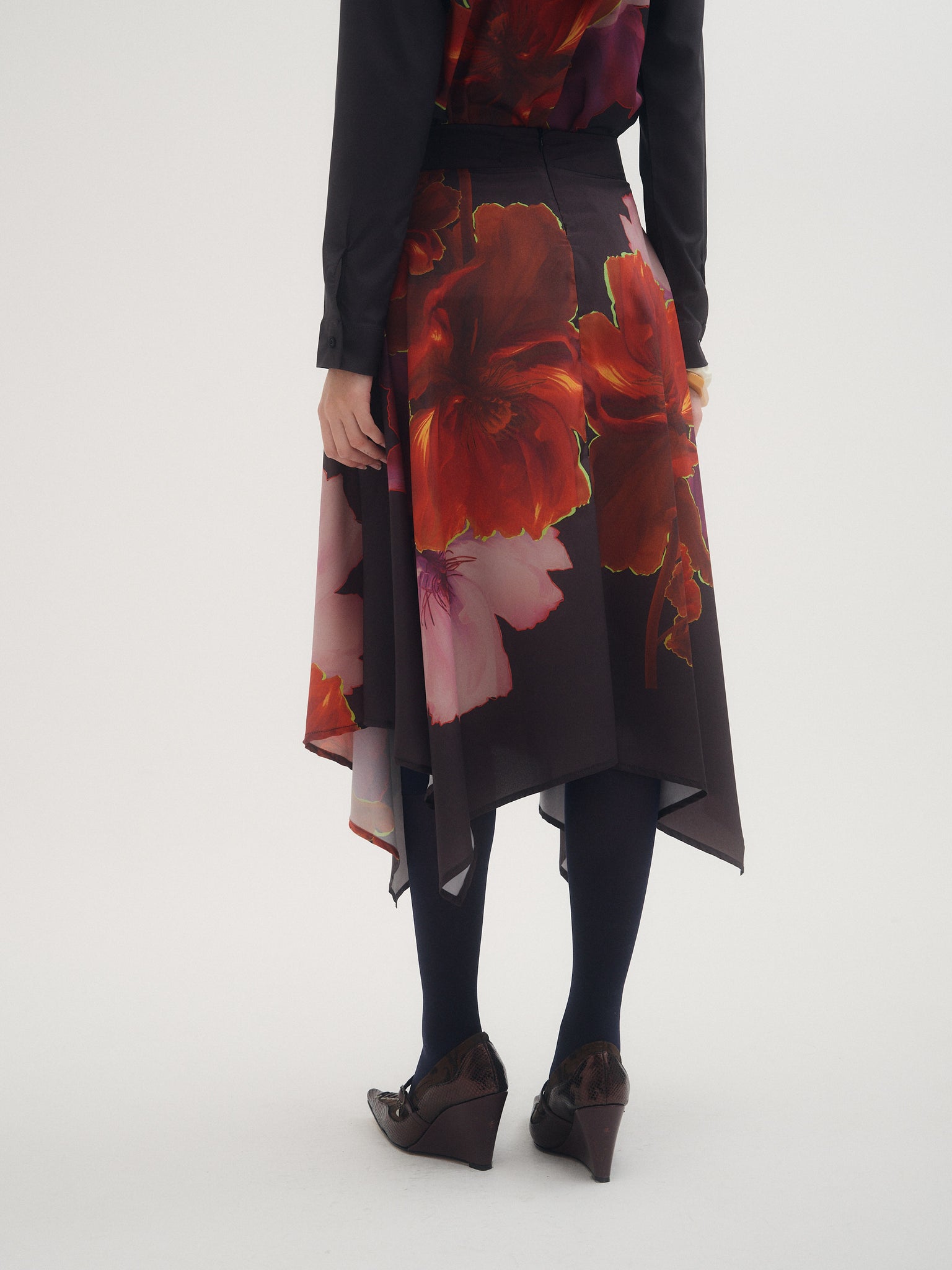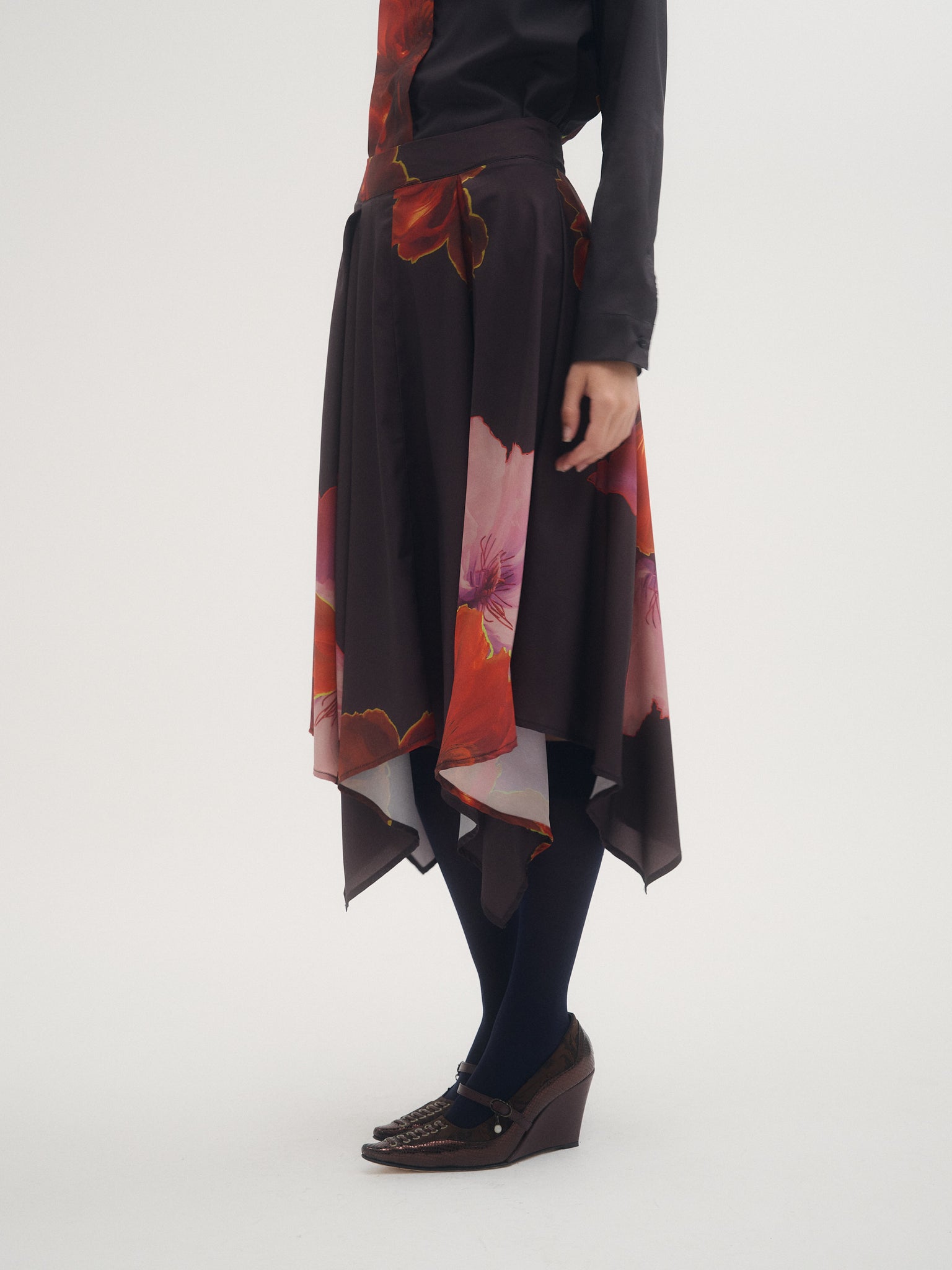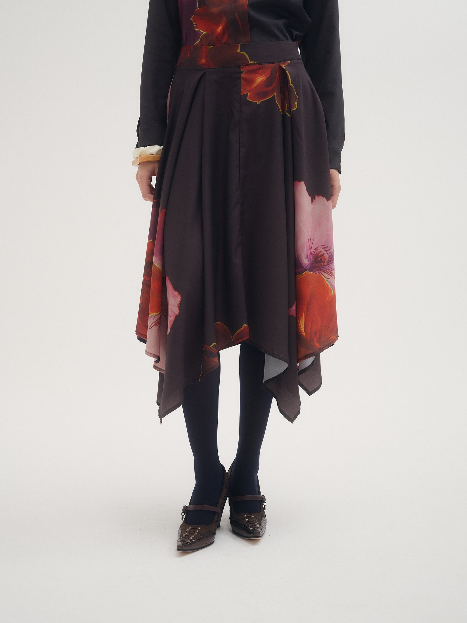 Falda Cosmos, falda midi confeccionada en crepé estampado con ilustracion exclusiva de la temporada aw25. Diseño con picos y tablas en cintura. Ideal para combinar con camisa Cosmos para un total look.