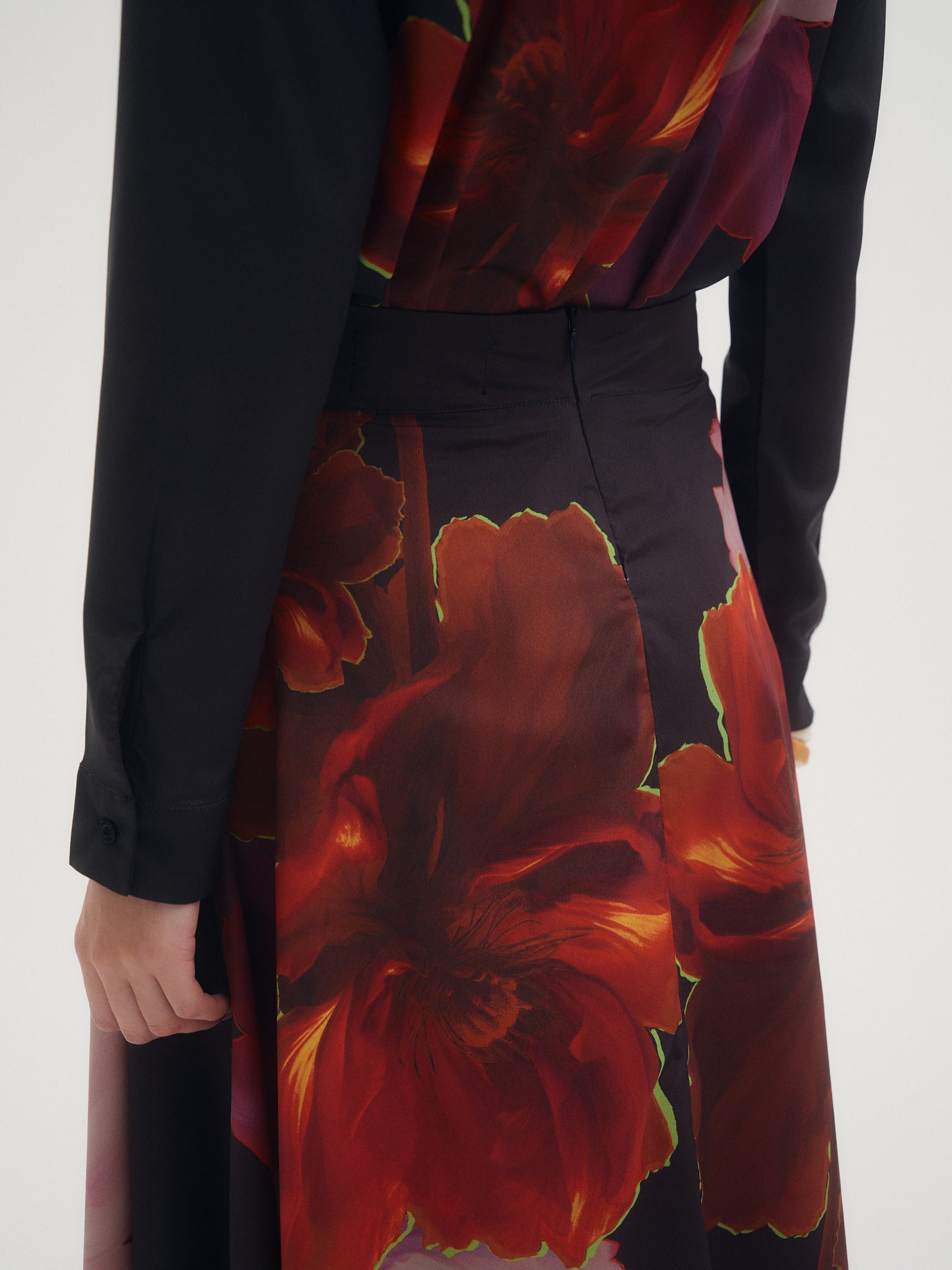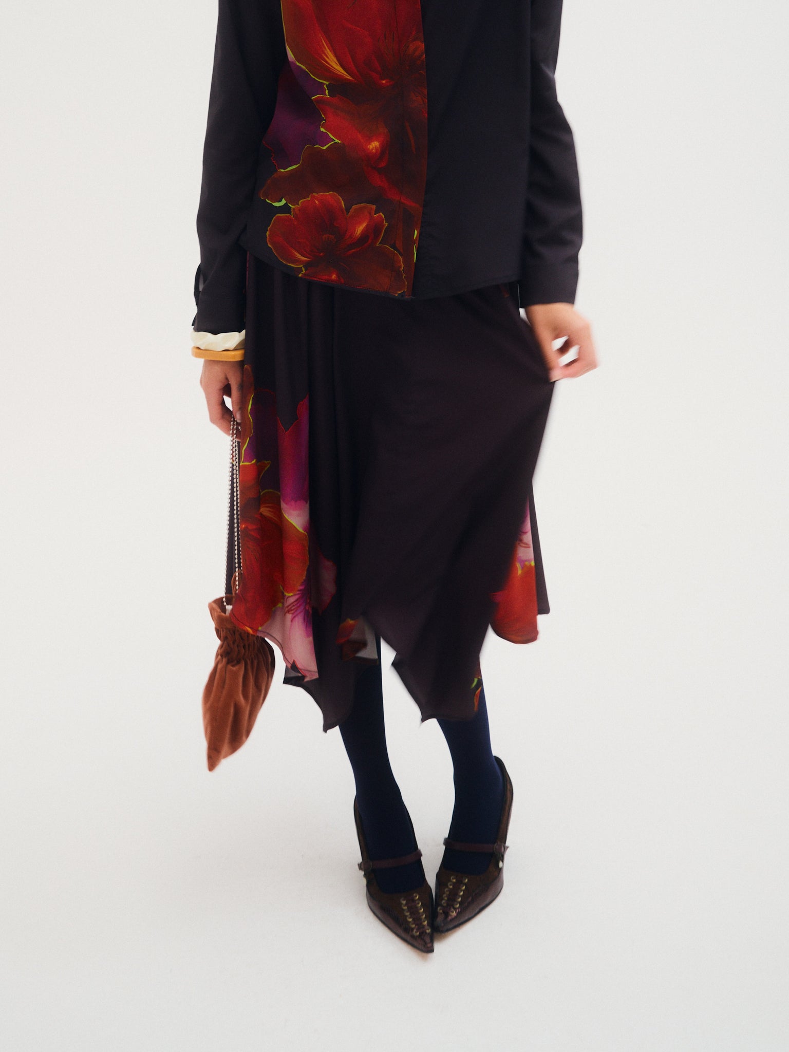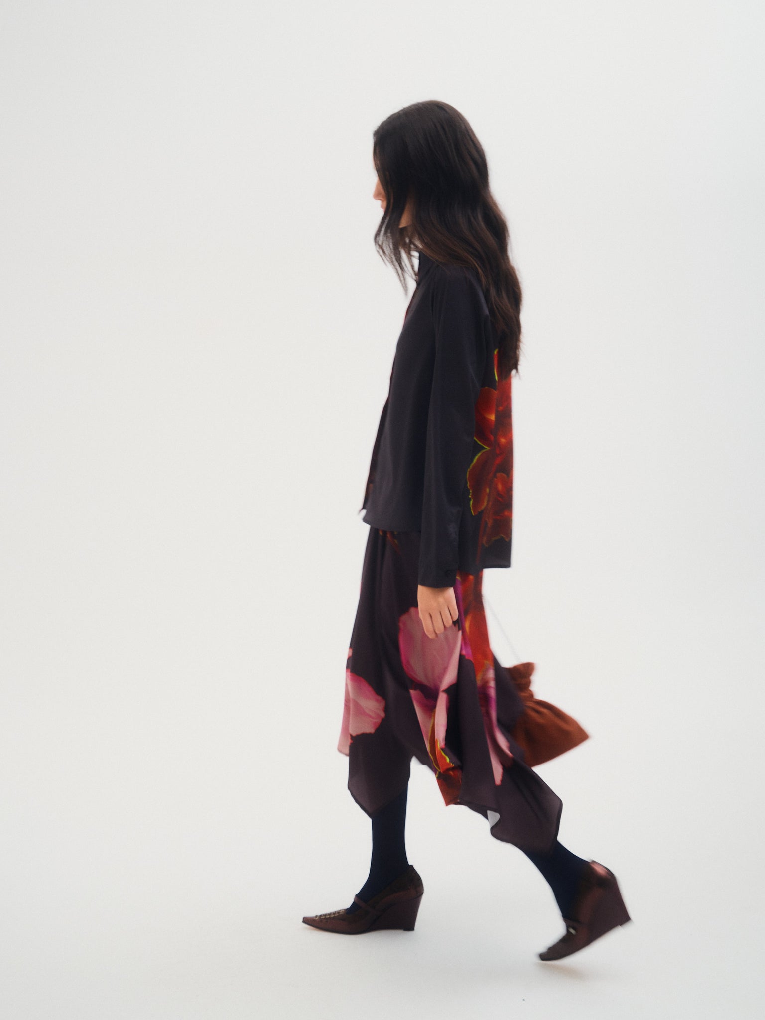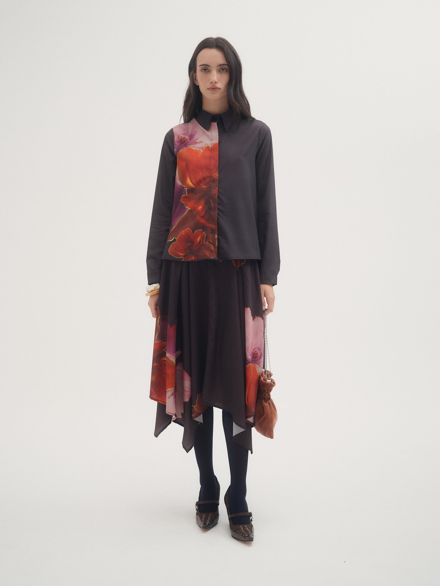 Falda Cosmos, falda midi confeccionada en crepé estampado con ilustracion exclusiva de la temporada aw25. Diseño con picos y tablas en cintura. Ideal para combinar con camisa Cosmos para un total look.