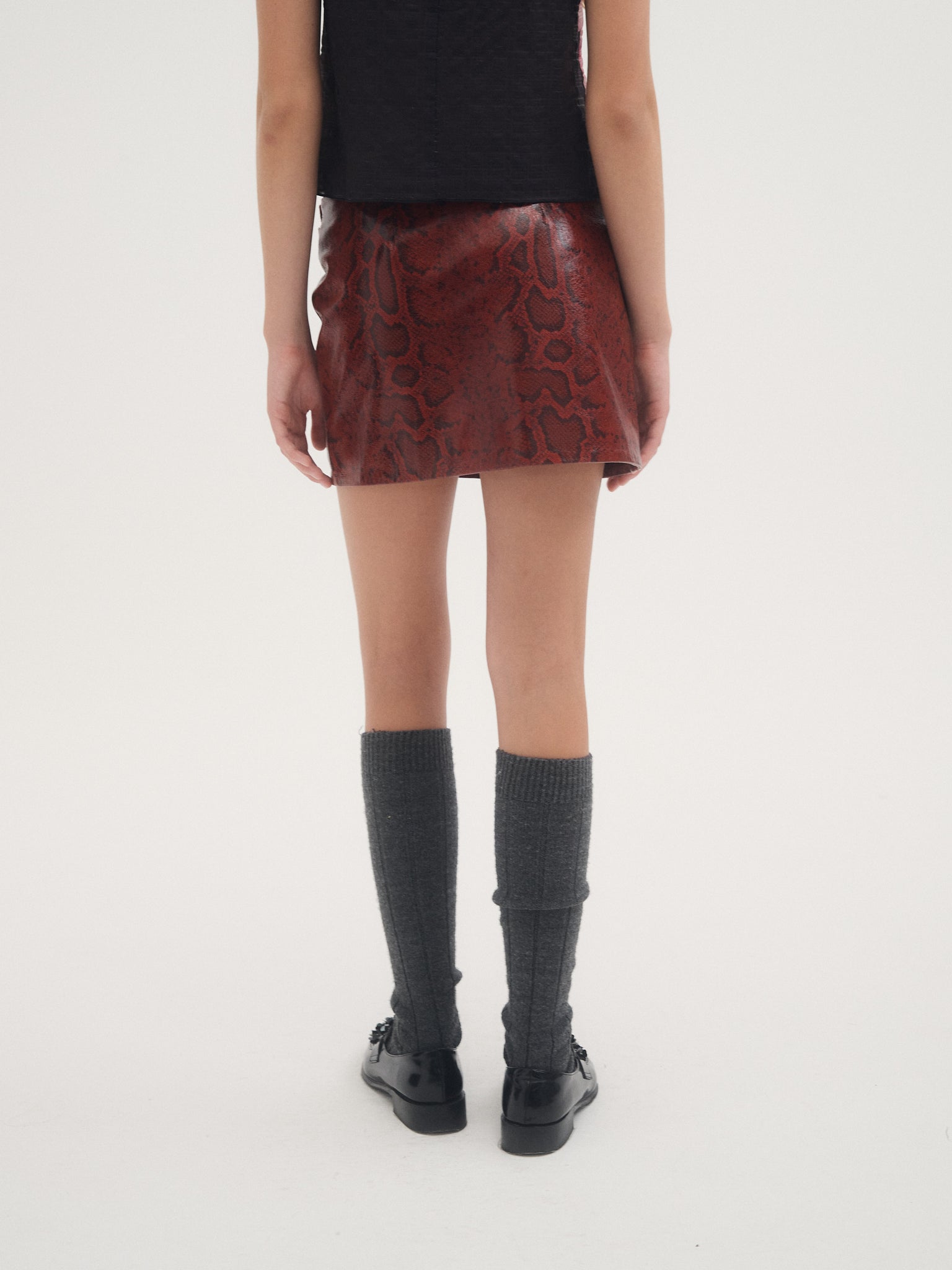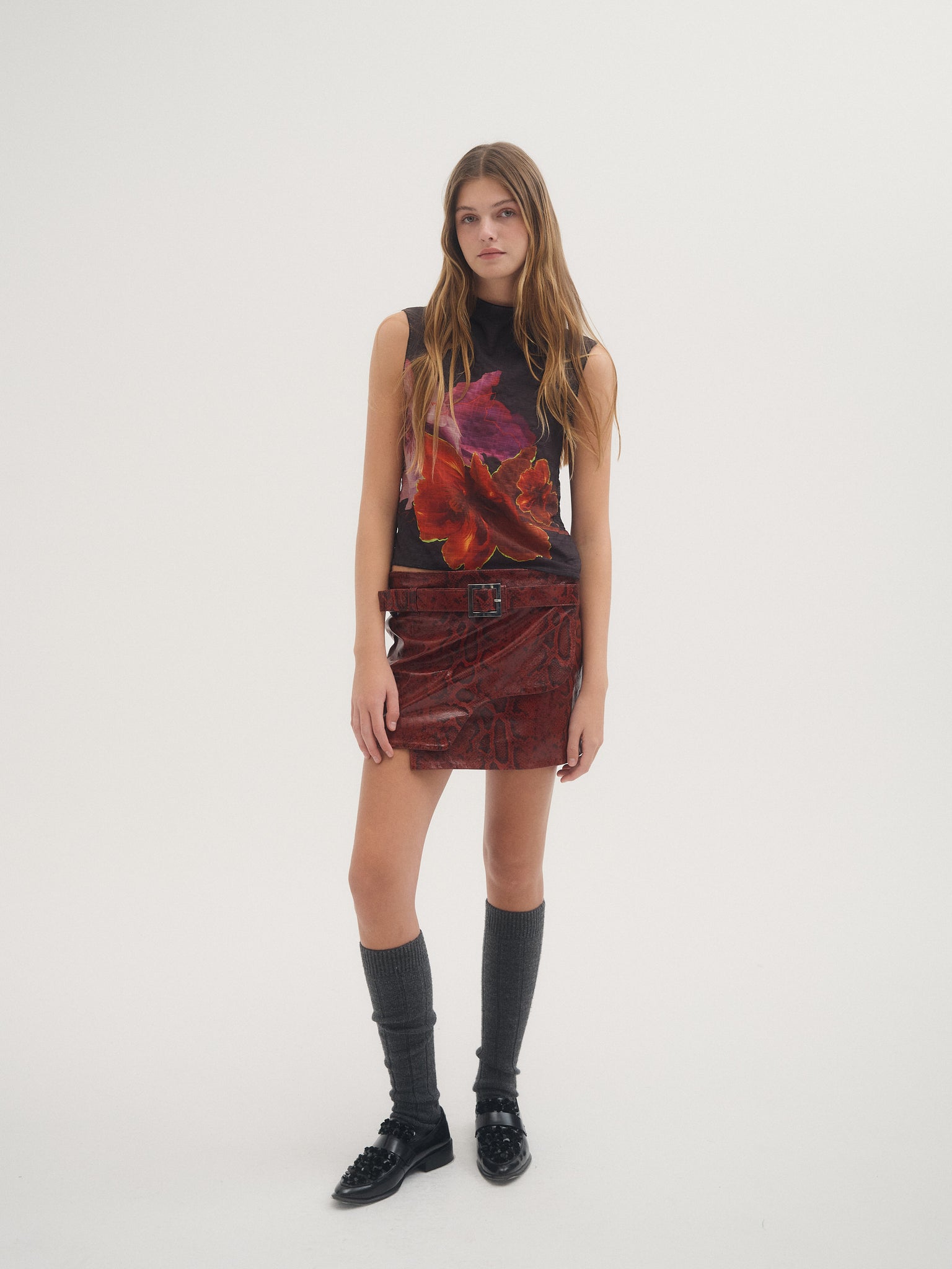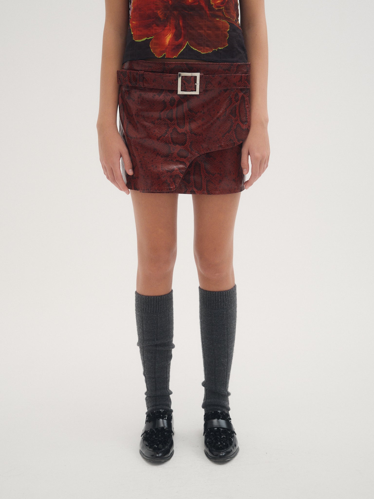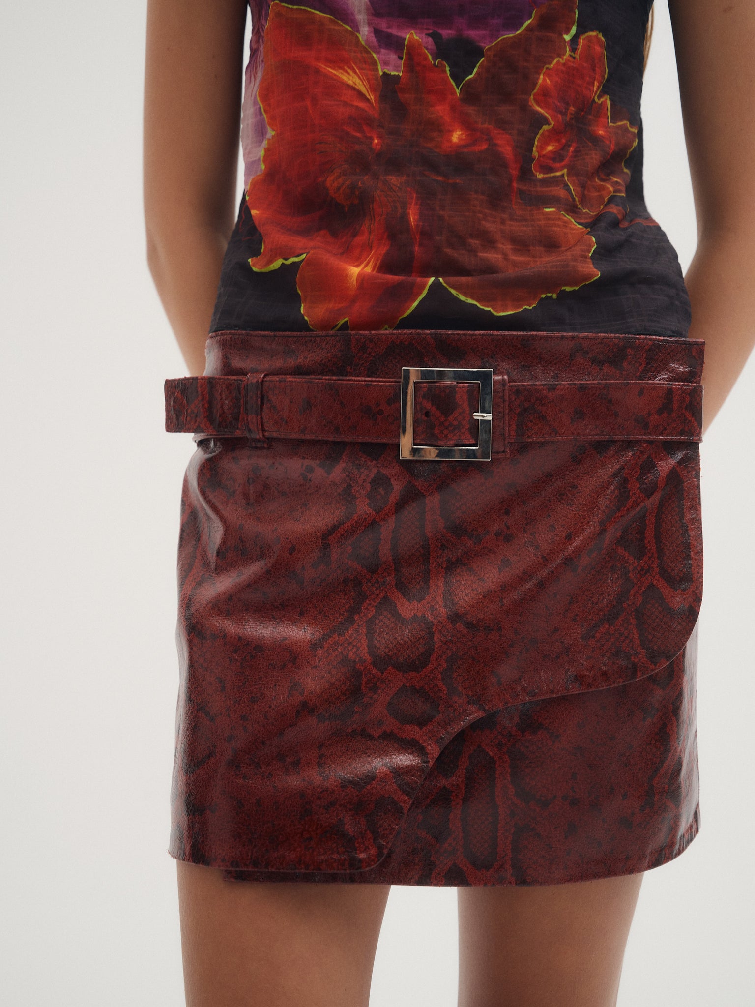 Falda tipo mini con calce tiro medio. Posee un cinturon fijo con hebilla protagonista. Confeccionado en cuero de oveja. Una prenda de estilo que levanta cualquier look.