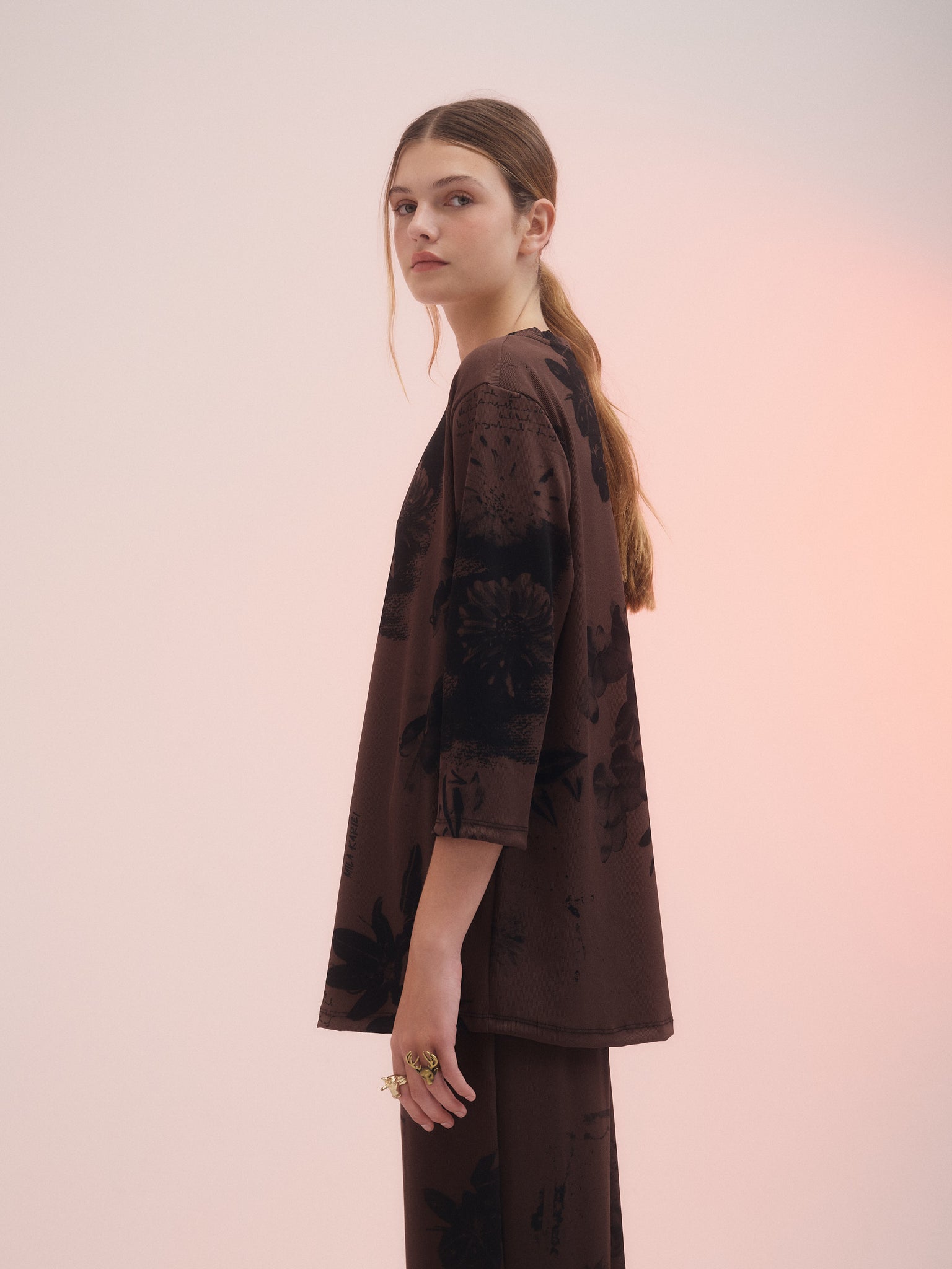 Confeccionado en micro morley estampado. Fit holgado y mangas 3/4. Complemento ideal para el Pantalon Alley.