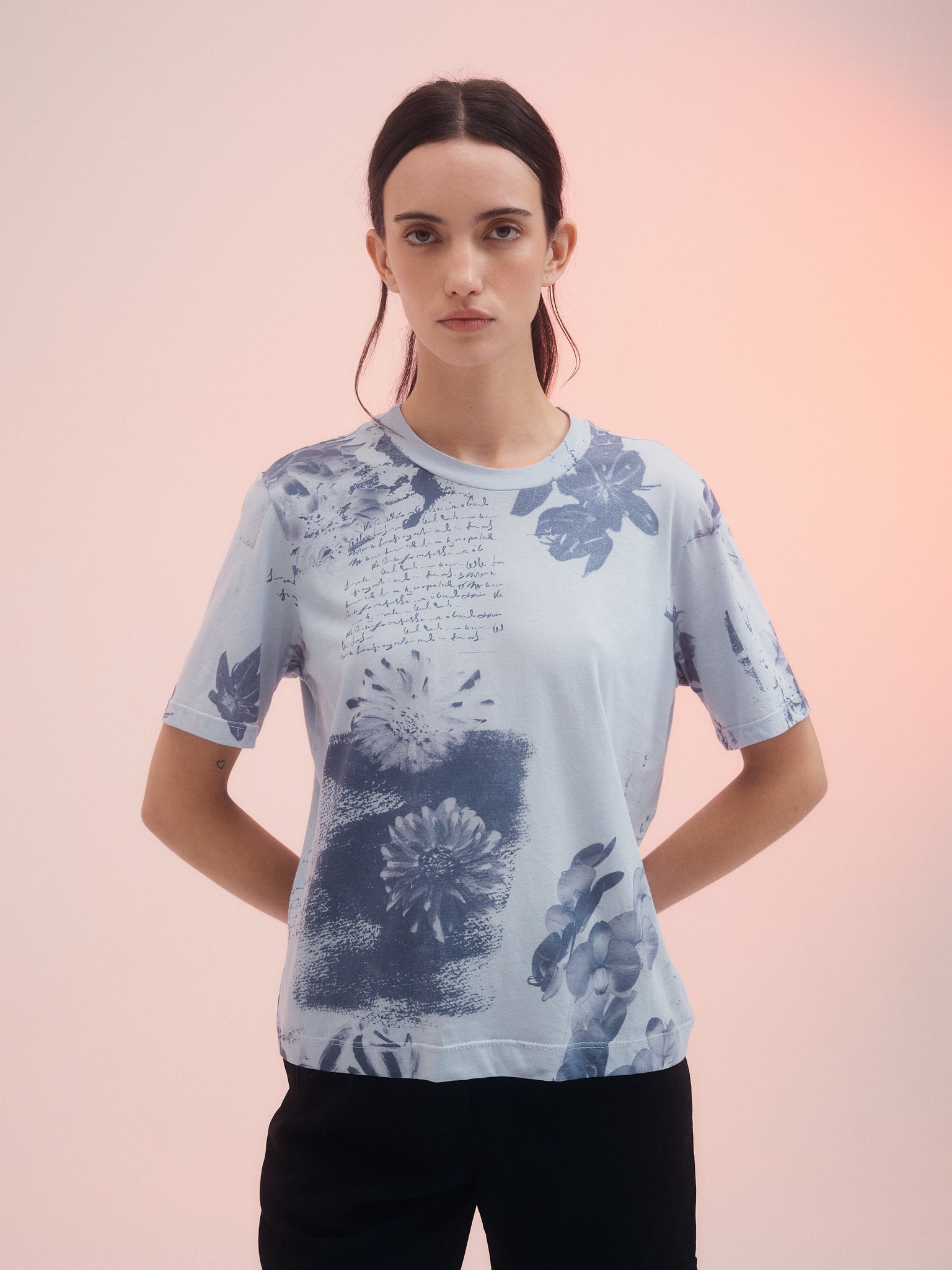 Remera Fleur, confeccionada en jersey de algodón suave y ligero. Fit regular con detalle de bordador a contratono en lateral. Estampada digitalmente.