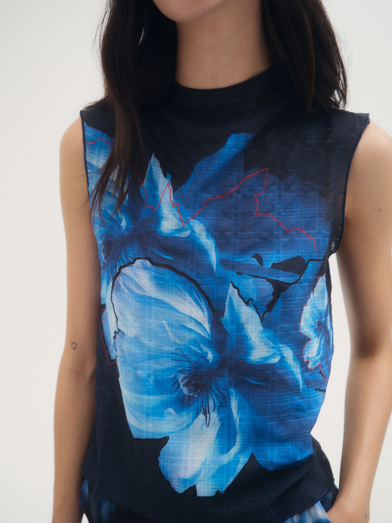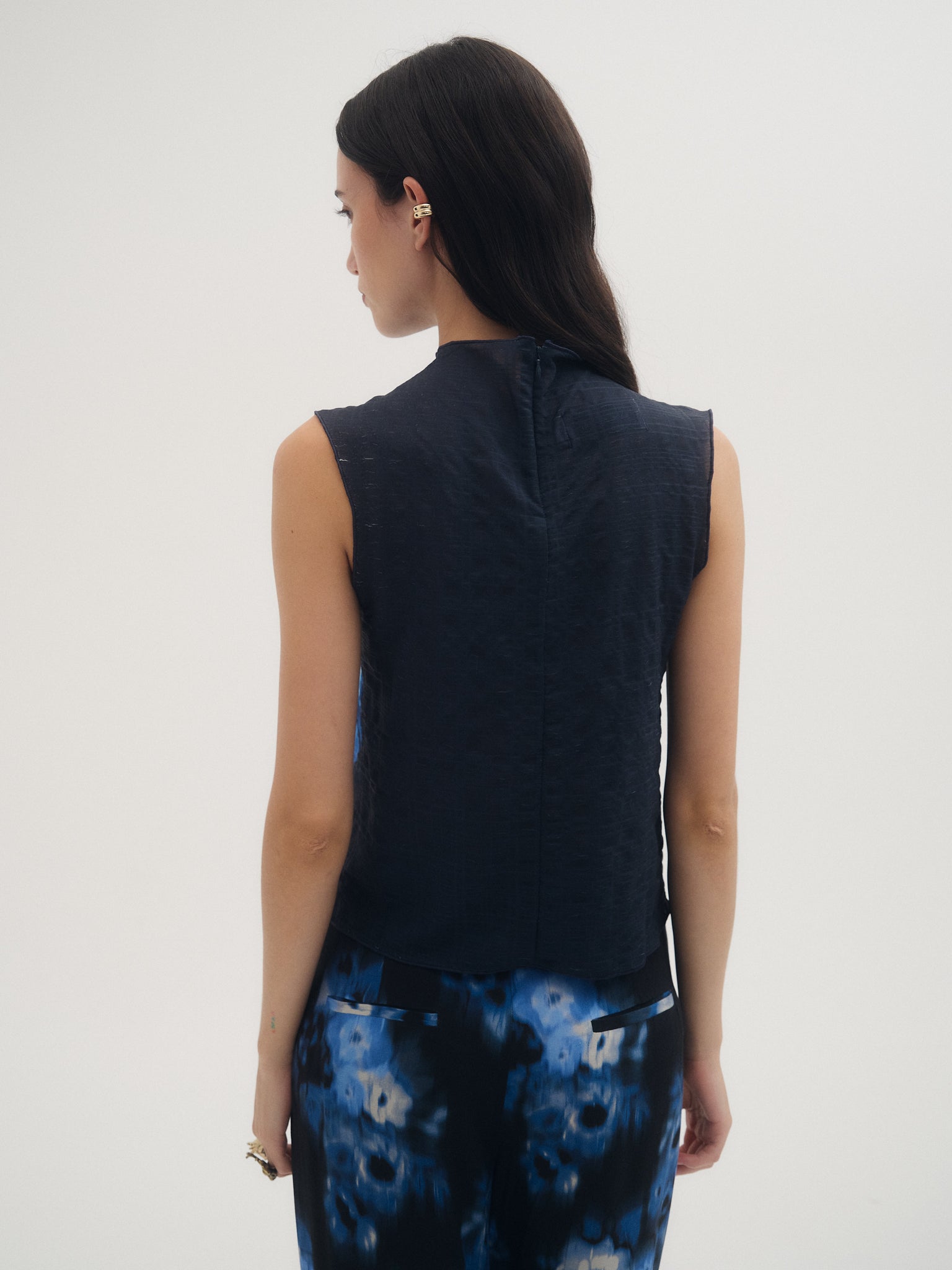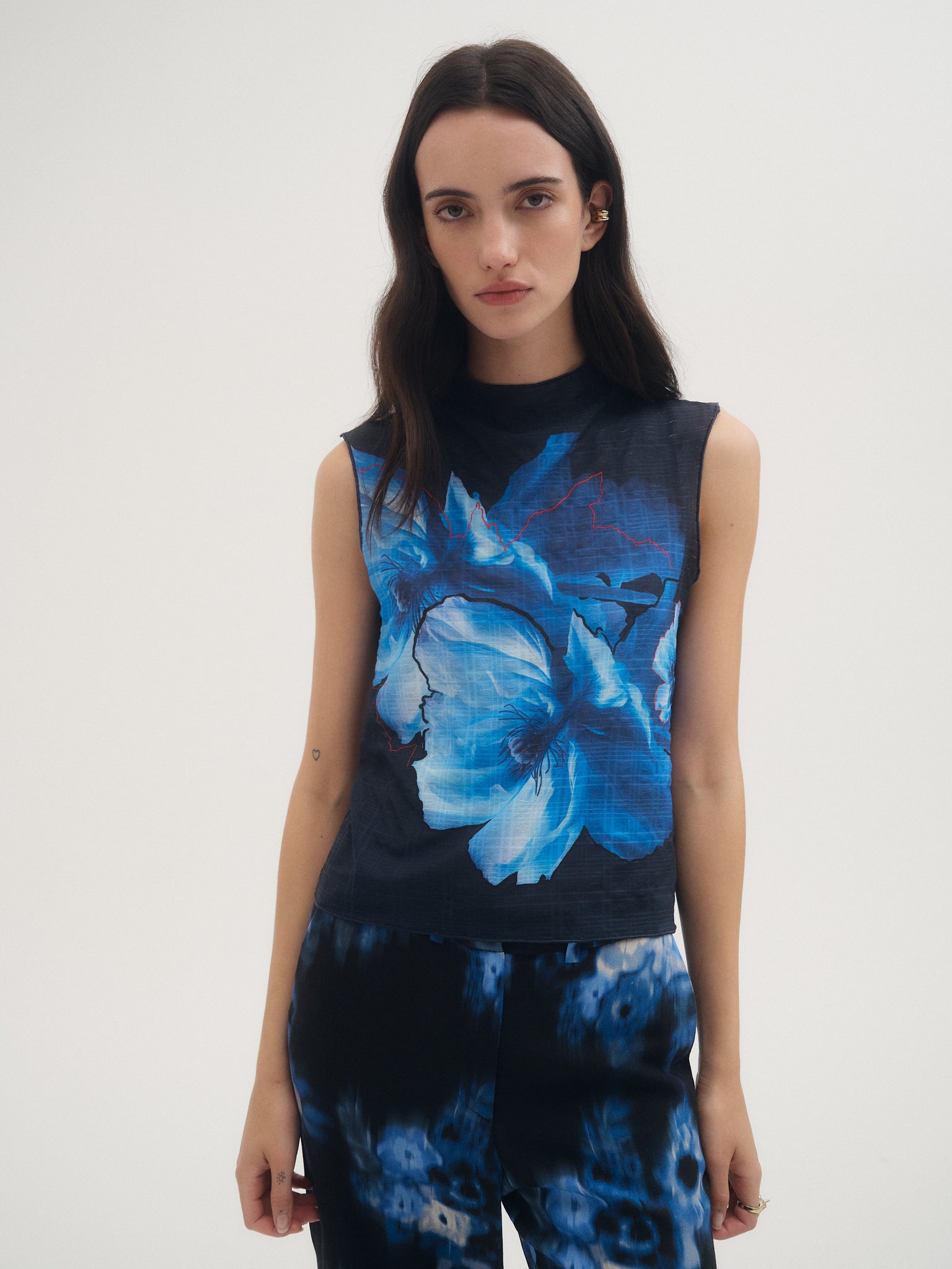 Top Kate, Confeccionado en crepé texturado con una estampa exclusiva de la colección DIFFUSE. Detalle de rulotte en escote y sisas, una prenda versátil y elegante. Acceso mediante cierre invisible en espalda.