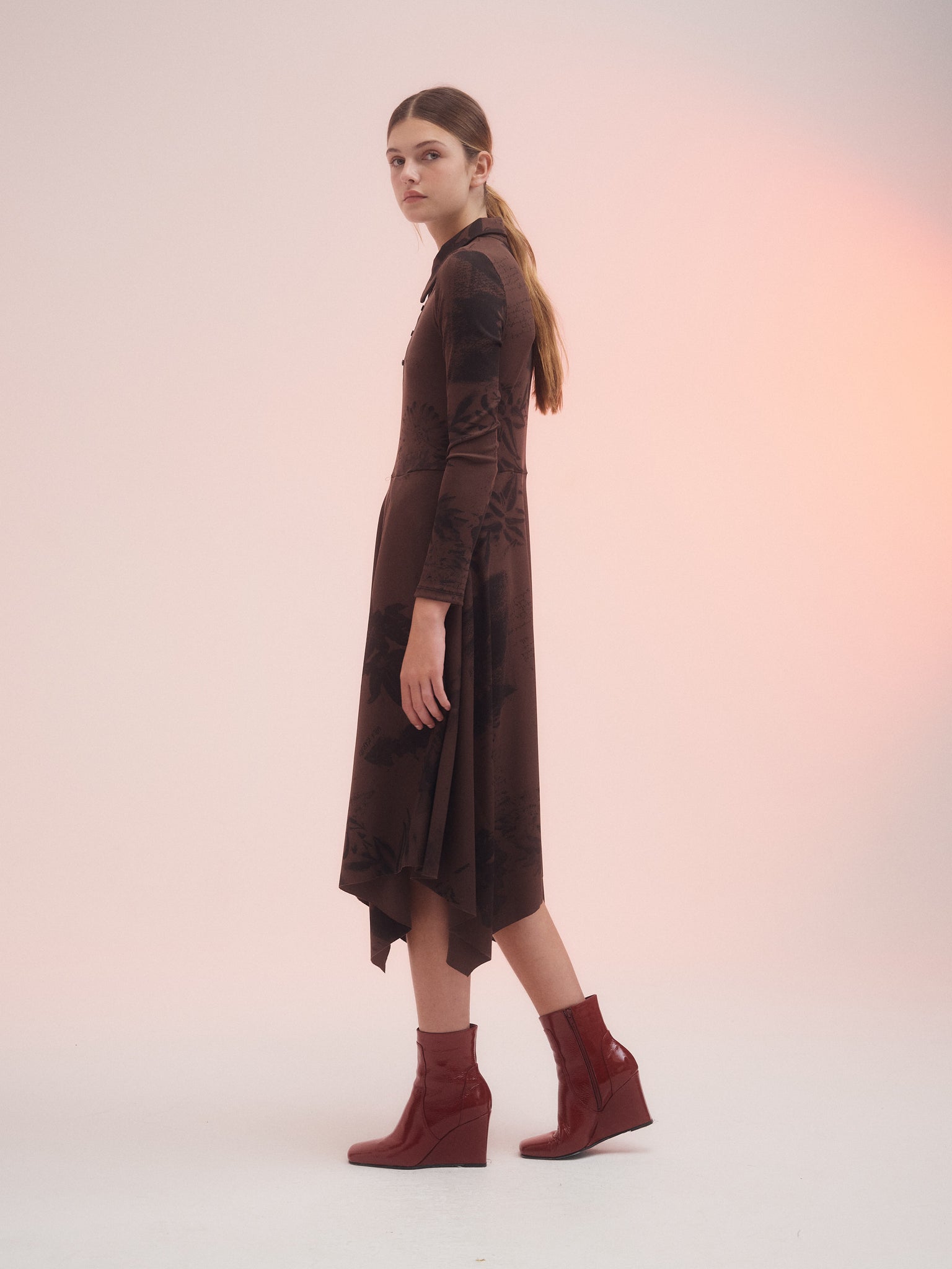 Vestido Alley confeccionado en mini morley estampado con ilustracion exclusiva de esta temporada. Posee corte a la cintura con falda en picos y tablas. Diseño con cuello camisero y manga larga. Largo midi para un look versátil.