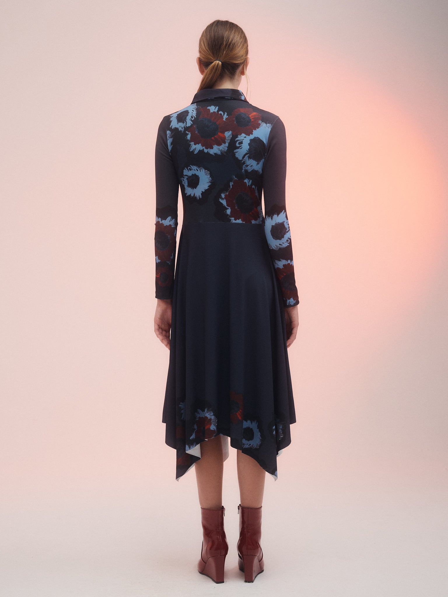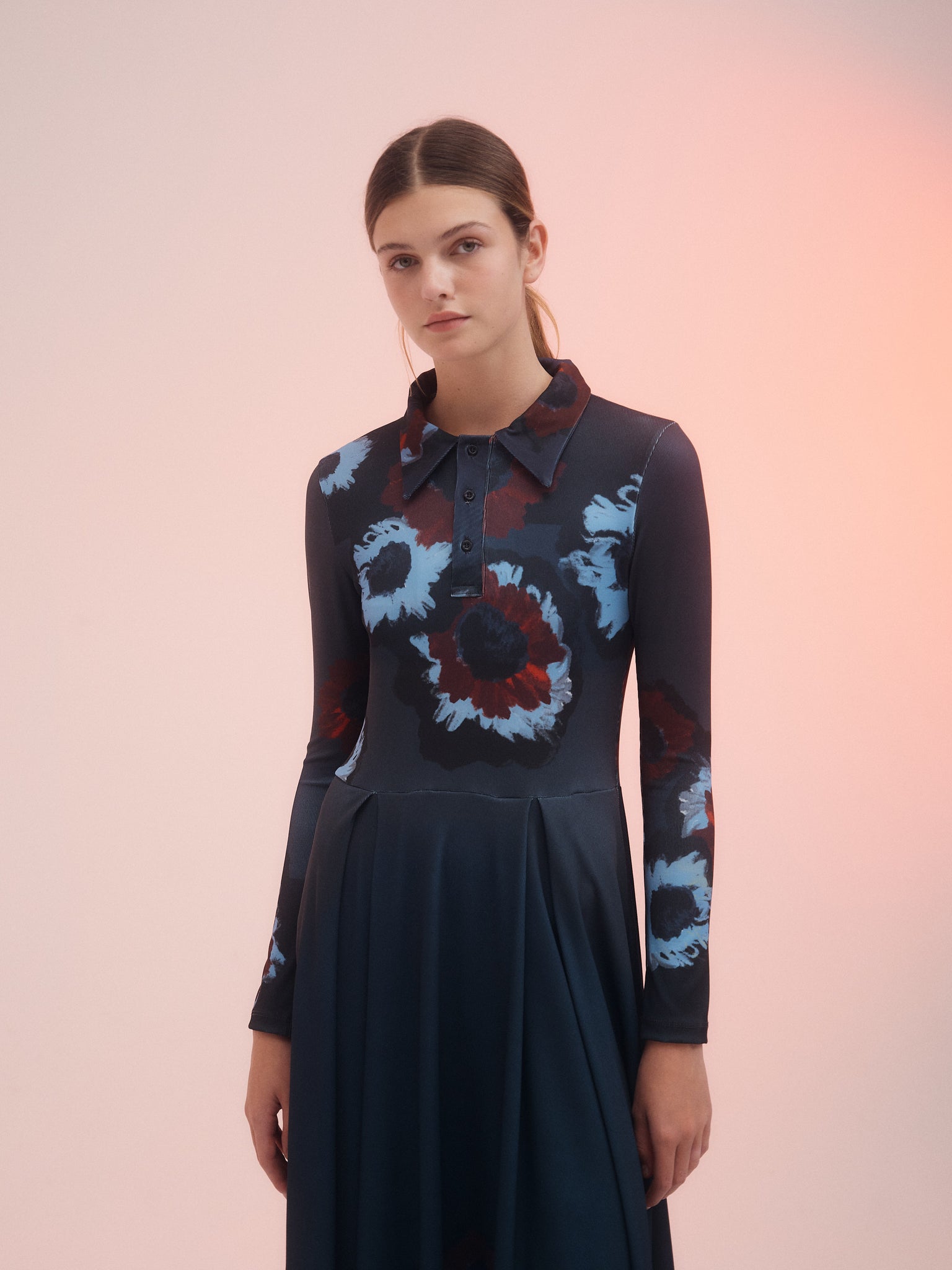 Vestido Alley confeccionado en mini morley estampado con ilustracion exclusiva de esta temporada. Posee corte a la cintura con falda en picos y tablas. Diseño con cuello camisero y manga larga. Largo midi para un look versátil.