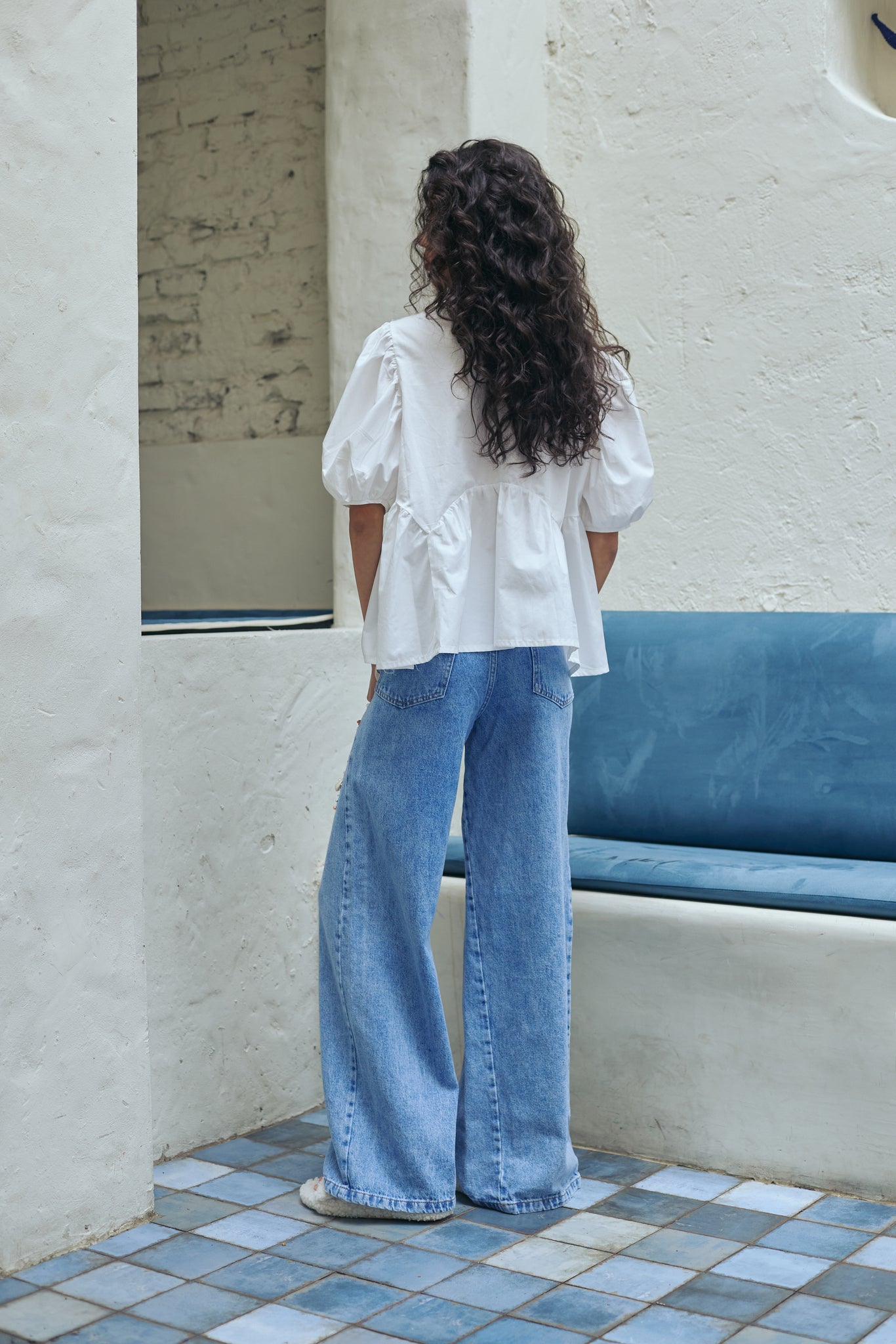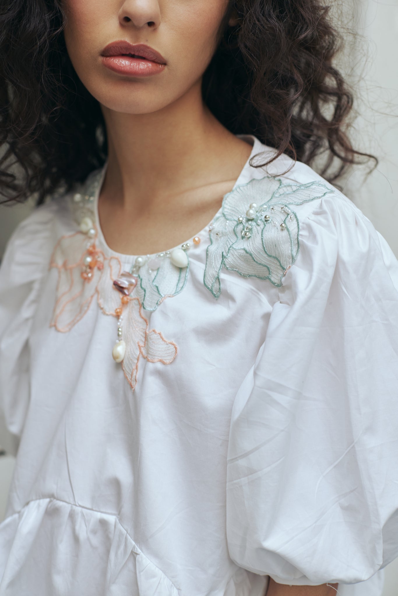 Blusa confeccionada en poplin paper touch. Con recortes que dan volumen en la silueta y mangas ballon. Escote redondo y detalle de apliques en encaje y bordado a mano artesanalmente. Un básico con un toque femenino para levantar cualquier look. Composición 100 % algodón.