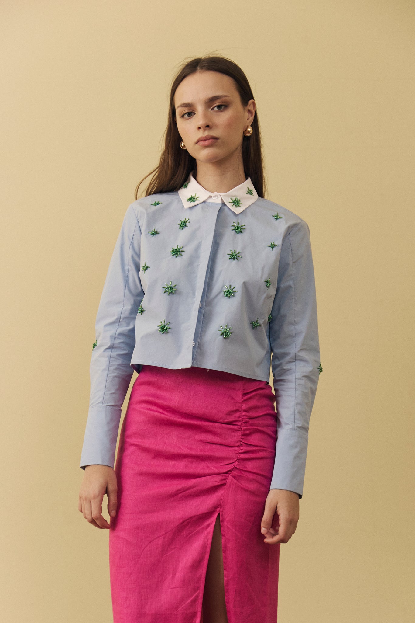 Camisa confeccionada en poplin paper touch. De fit amplio y cropped. Integramente bordada a mano con piedras, apliques de tela y canutillos.