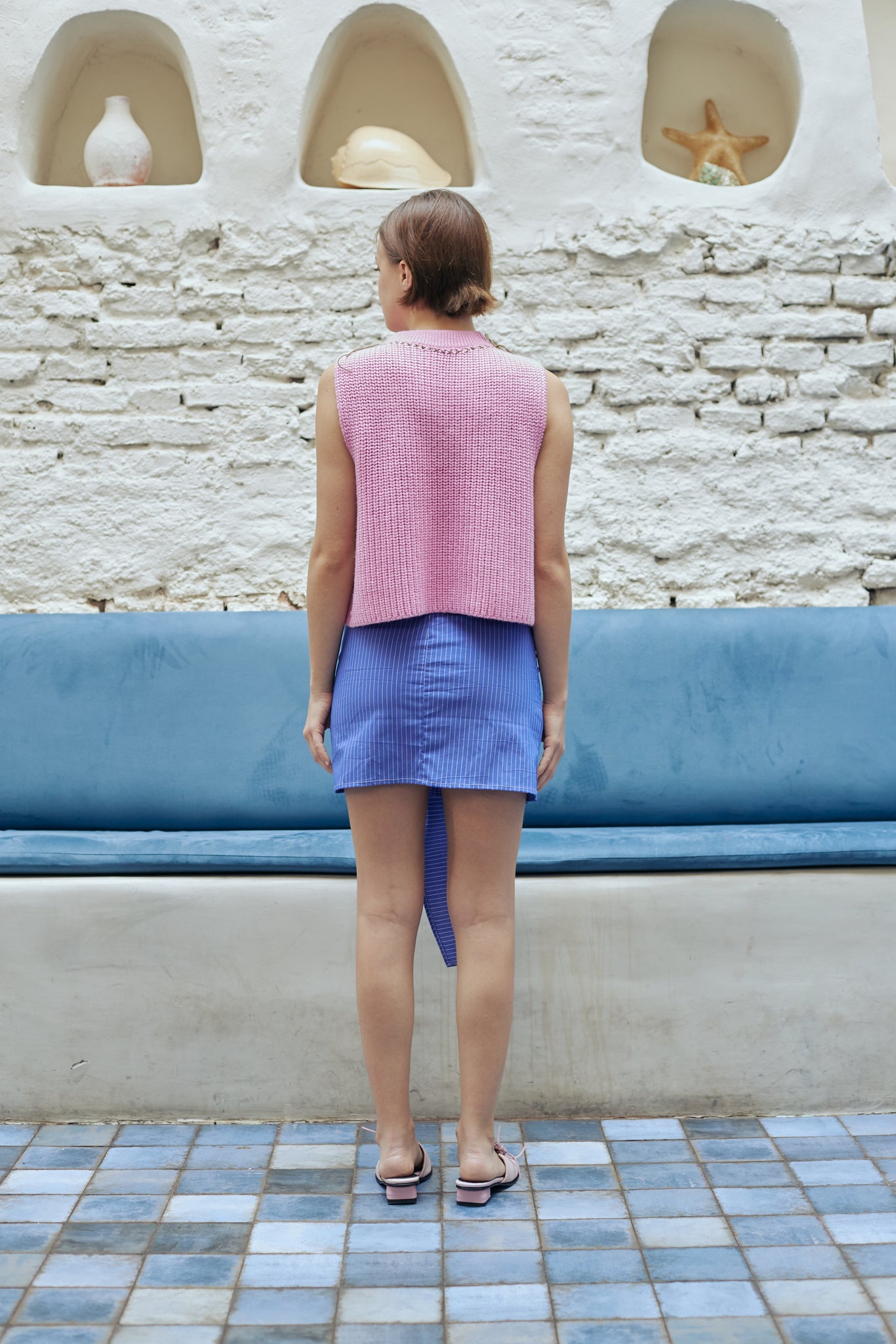 Falda confeccionada en poplin de algodón rayado. Posee una sobre falda para anudar con lazo o moño. Acceso en espalda mediante cierre invisible. Composición 100% algodón