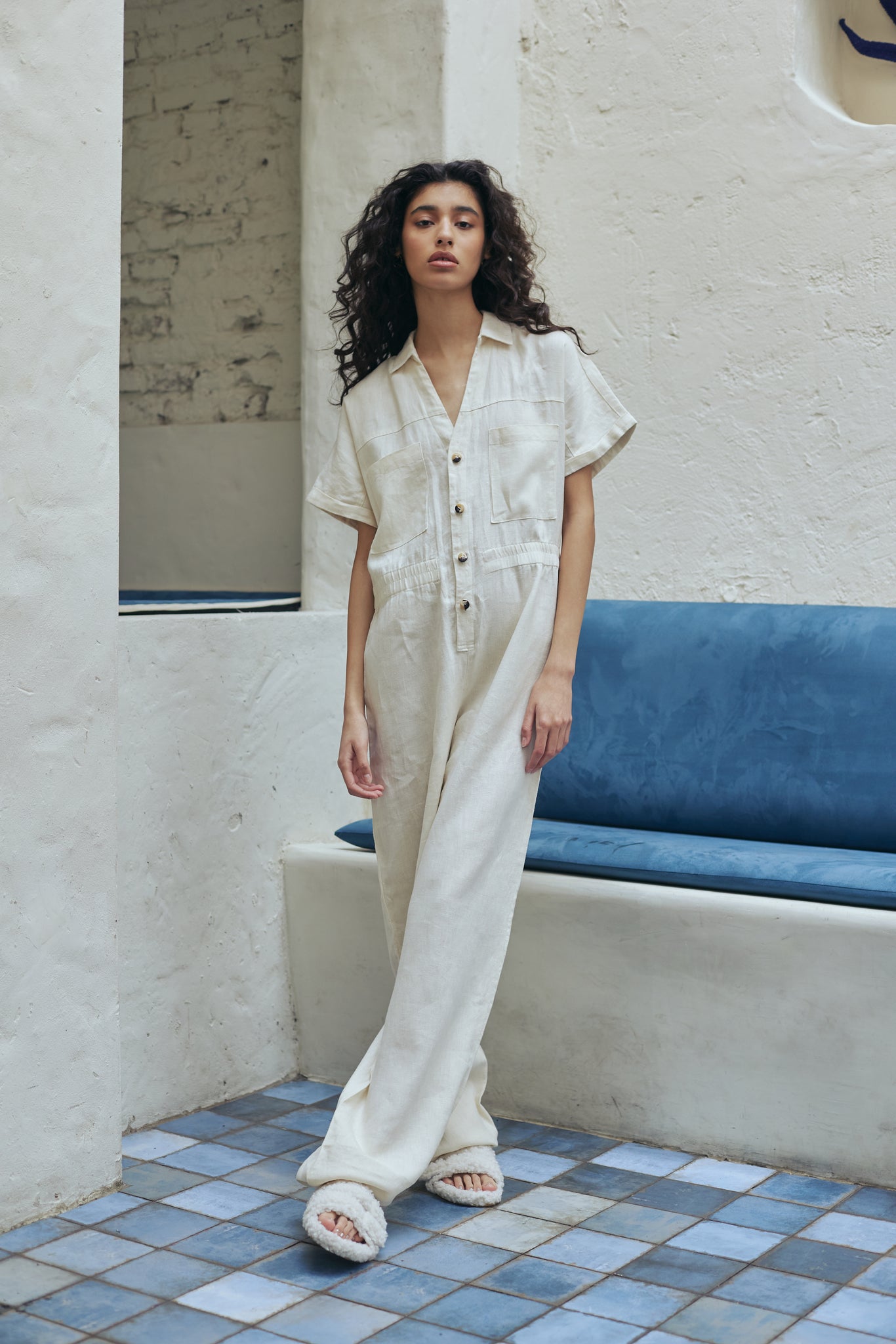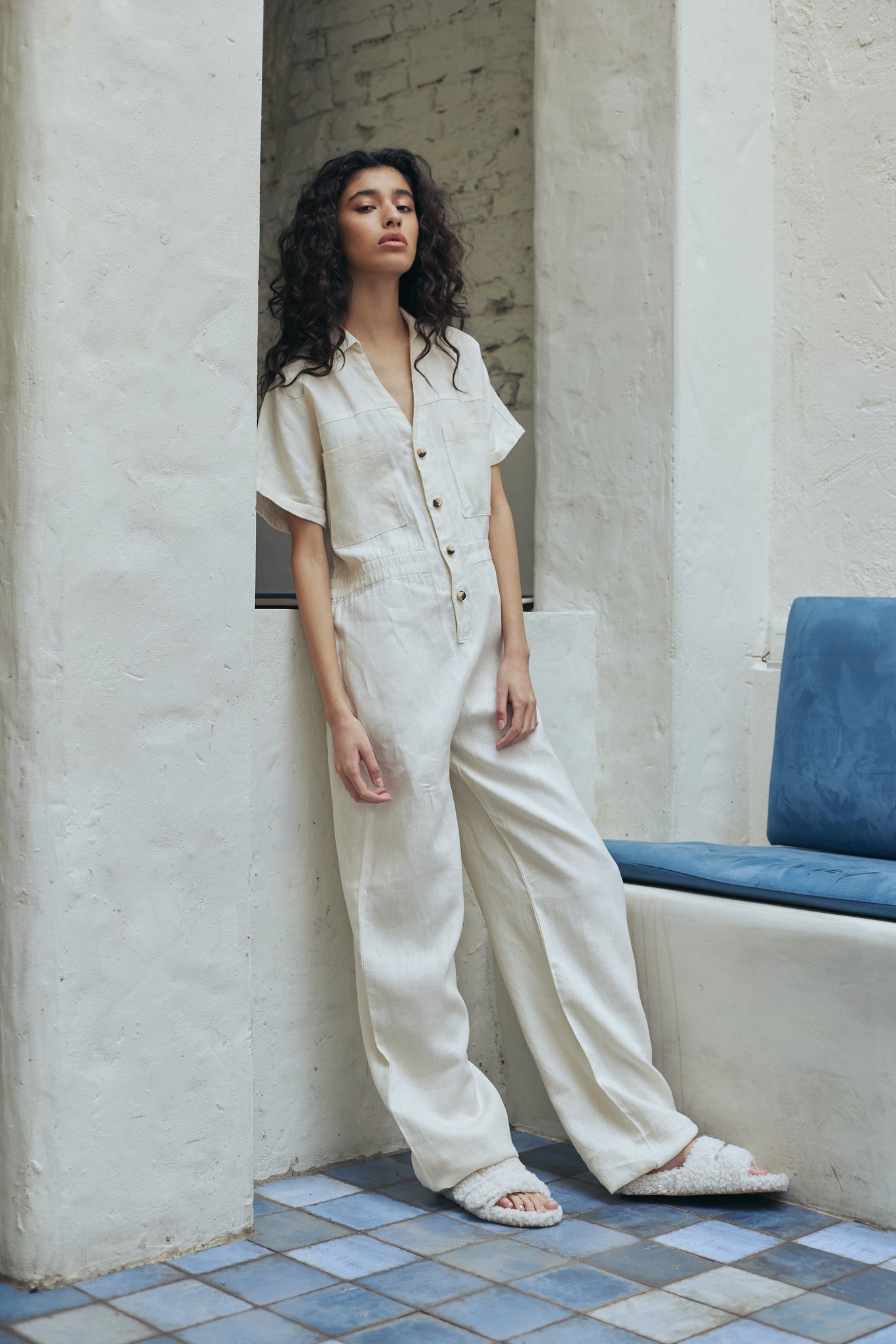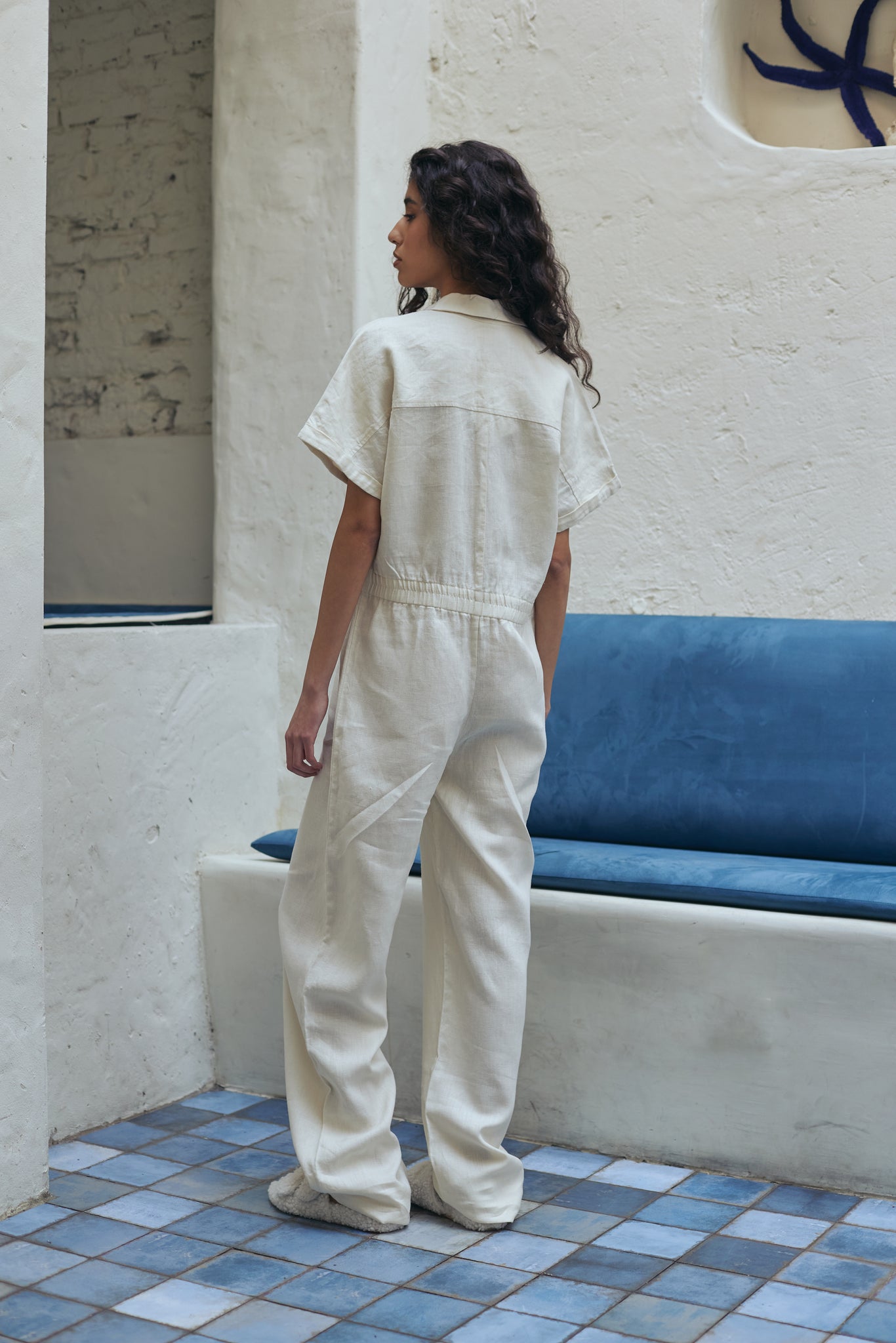 Mono largo confeccionado en lino con bolsillos laterales y una cintura con elástico interno que sujeta la cintura. Fit suelto. Sin dudas un básico de calidad para usar todo el verano. Composición 100% lino