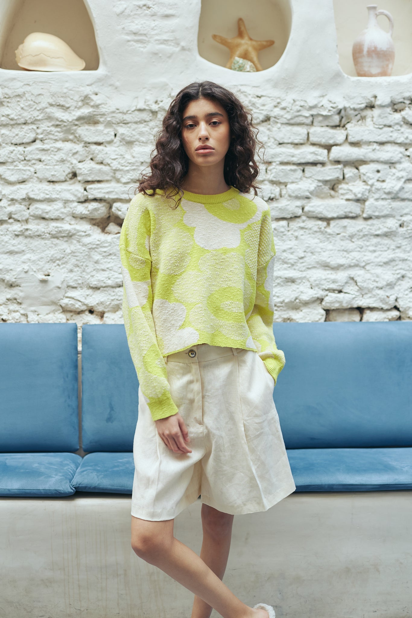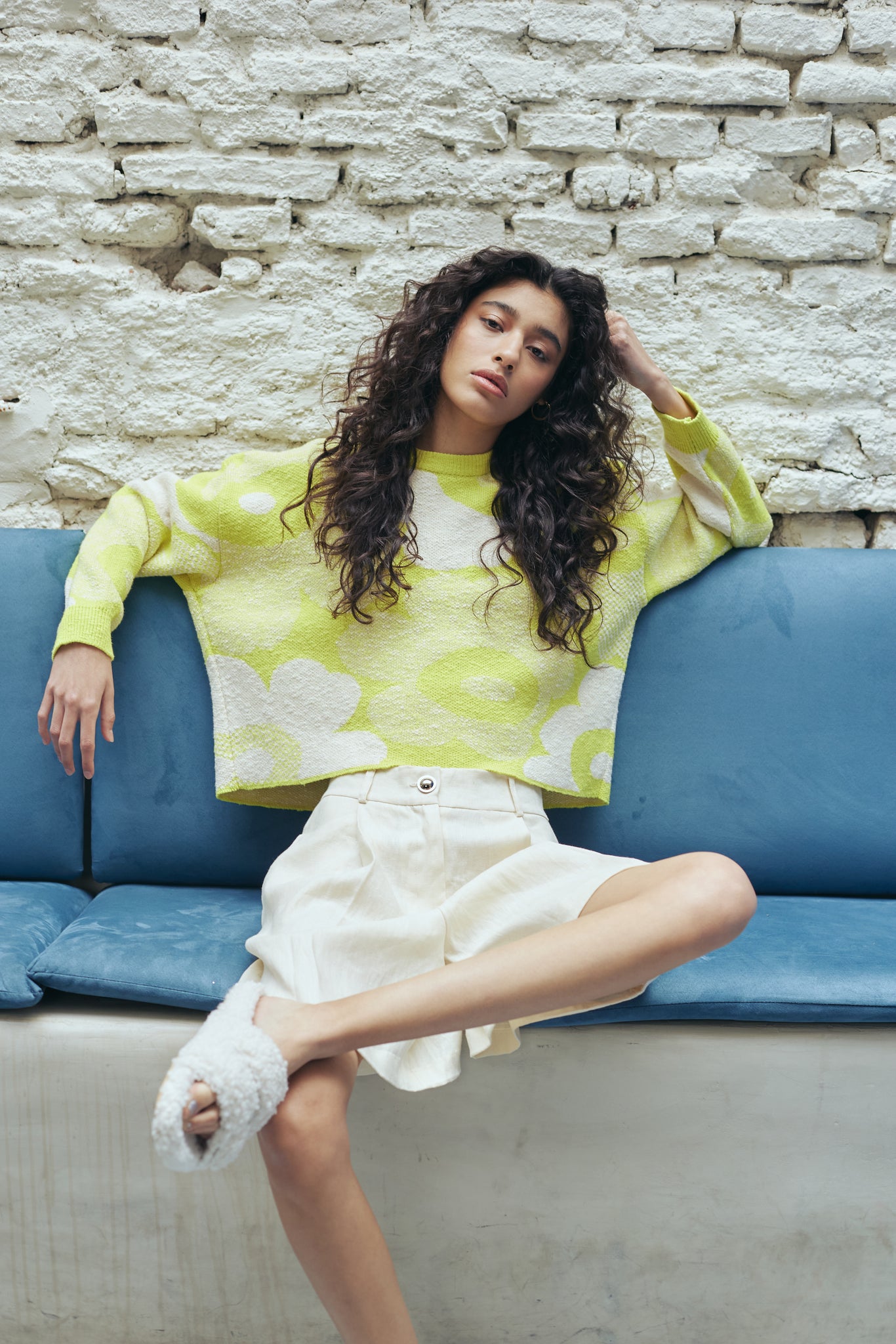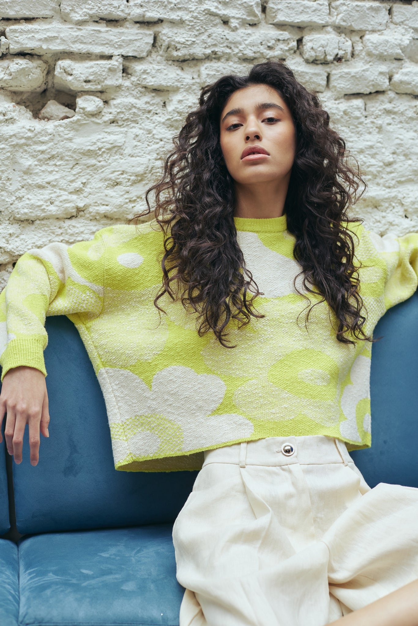 Sweater tejido en hilado tipo flame, con dibujo en jacard. Fit cuadrado y cropped. Composición 100% algodón