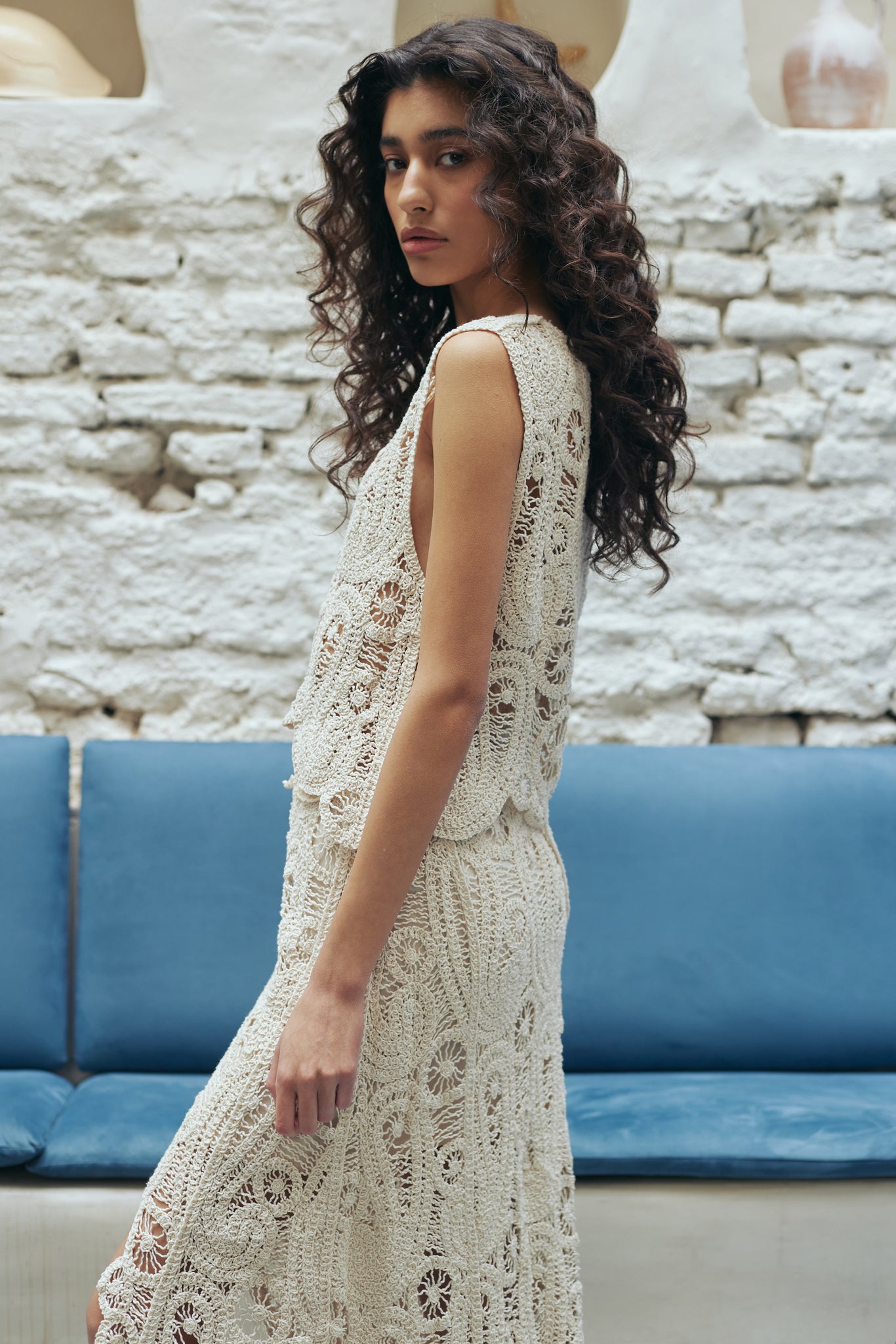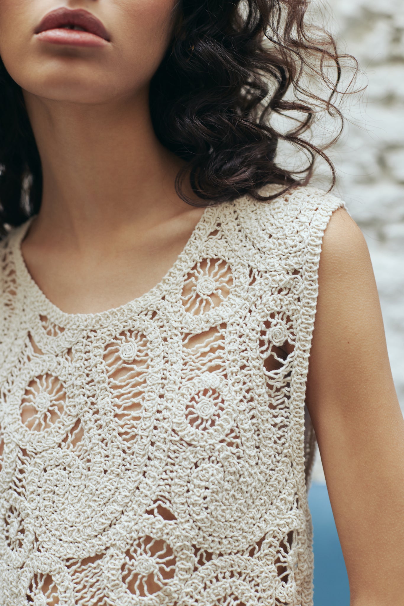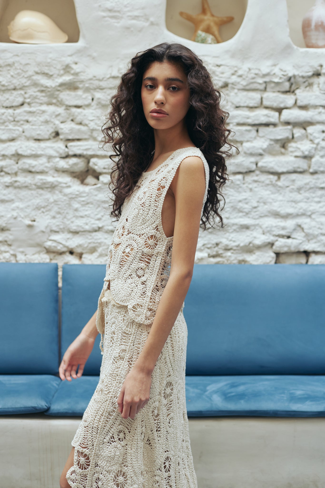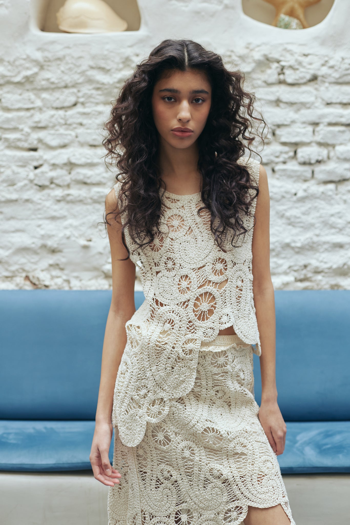 Top de crochet con escote redondo y largo asimétrico. Un item ideal para combinar con falda Maldivas Composición 100% algodón
