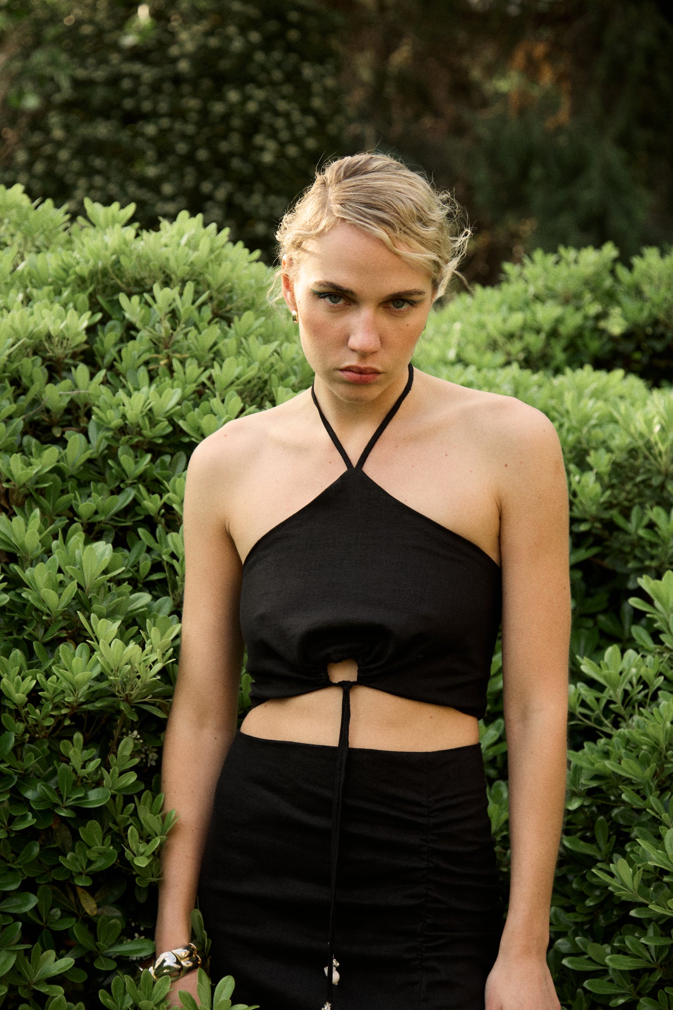 Top en lino 100%. Se sujeta al cuello y debajo se ajusta con unas tiritas que poseen un detalle de terminales bordadas a mano. Espalda elastizada. Composición 100% lino