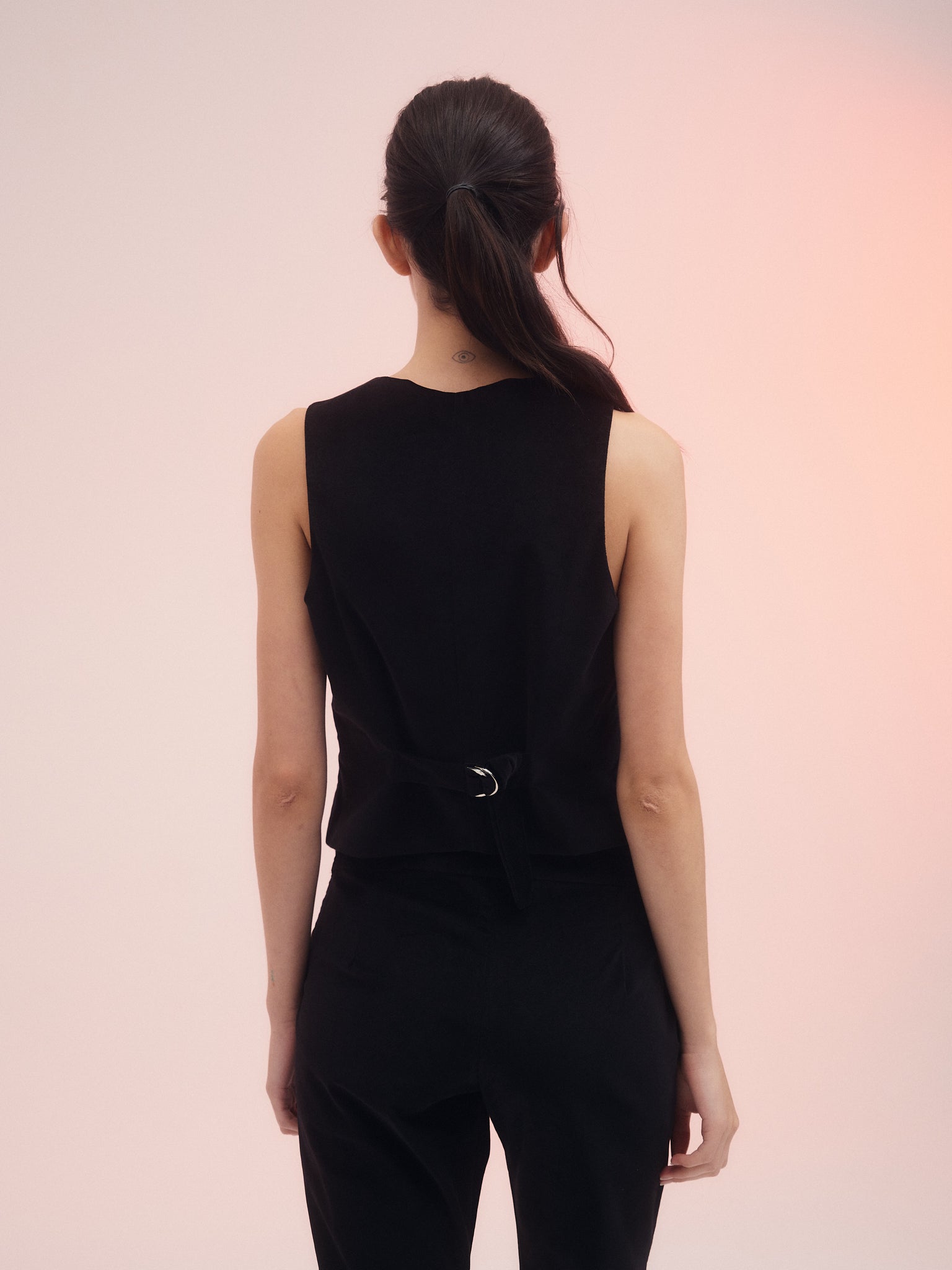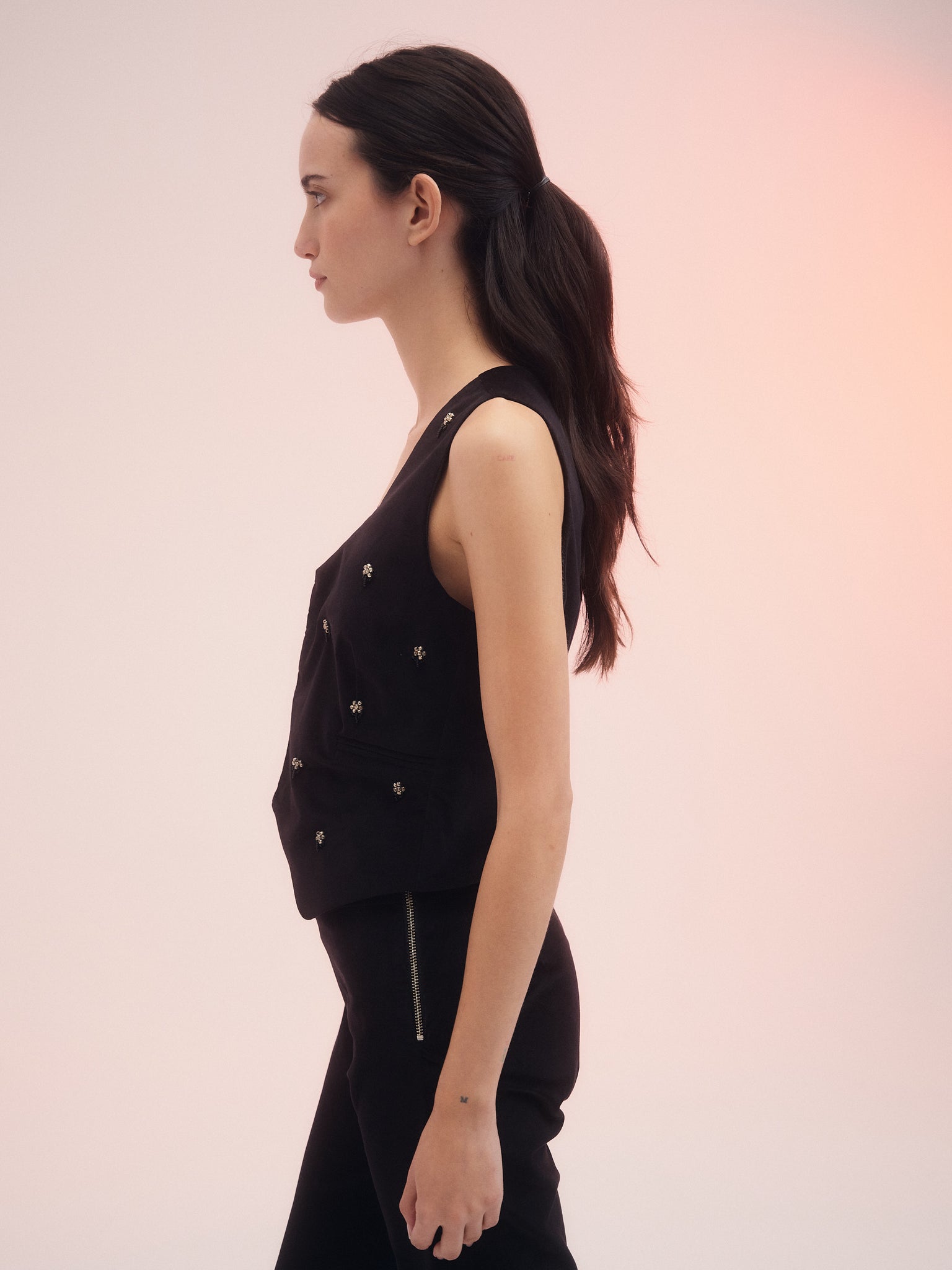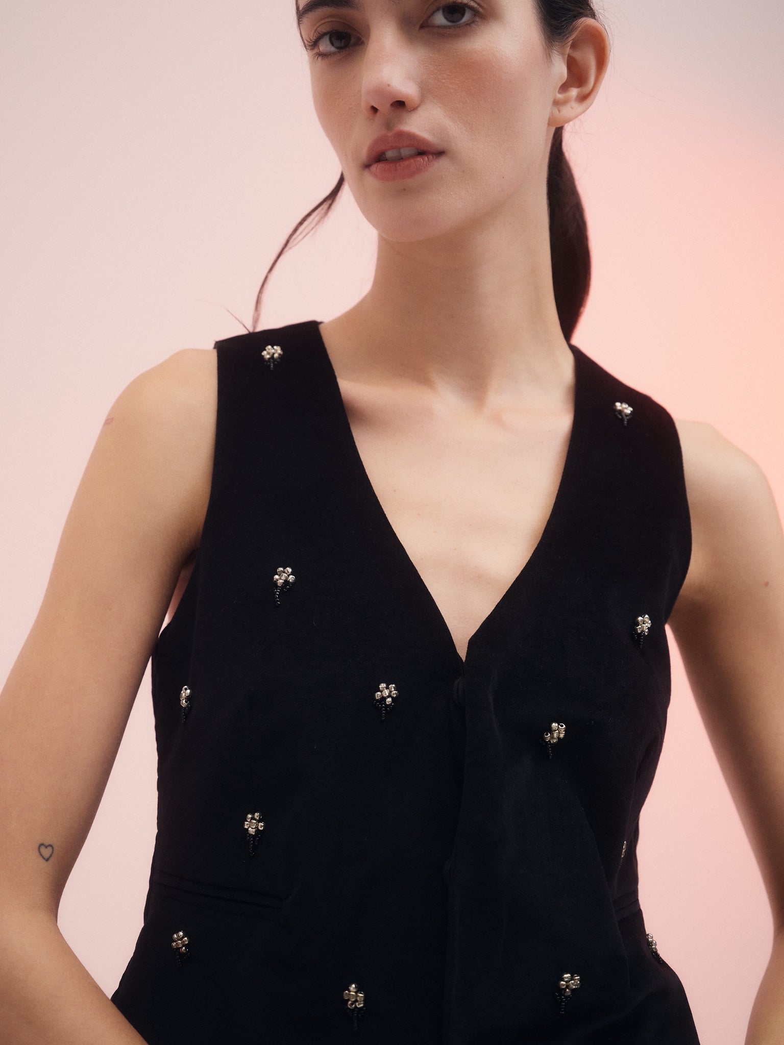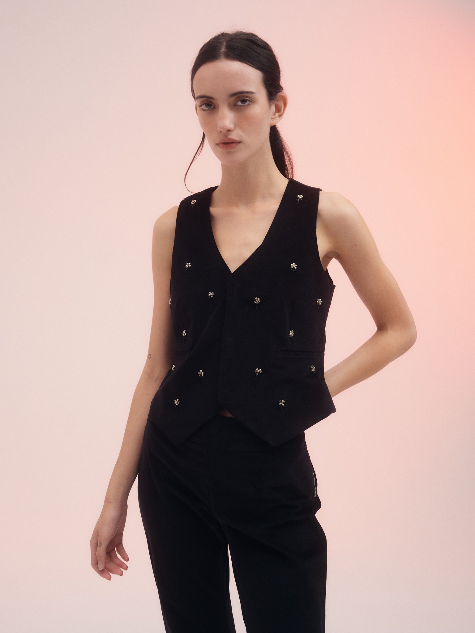 Chaleco de corte sastrero confeccionado en terciopelo de algodón de alta calidad. Acceso fácil y práctico mediante snaps. Disponible en dos versiones: lisa para un look minimalista o bordada a mano.