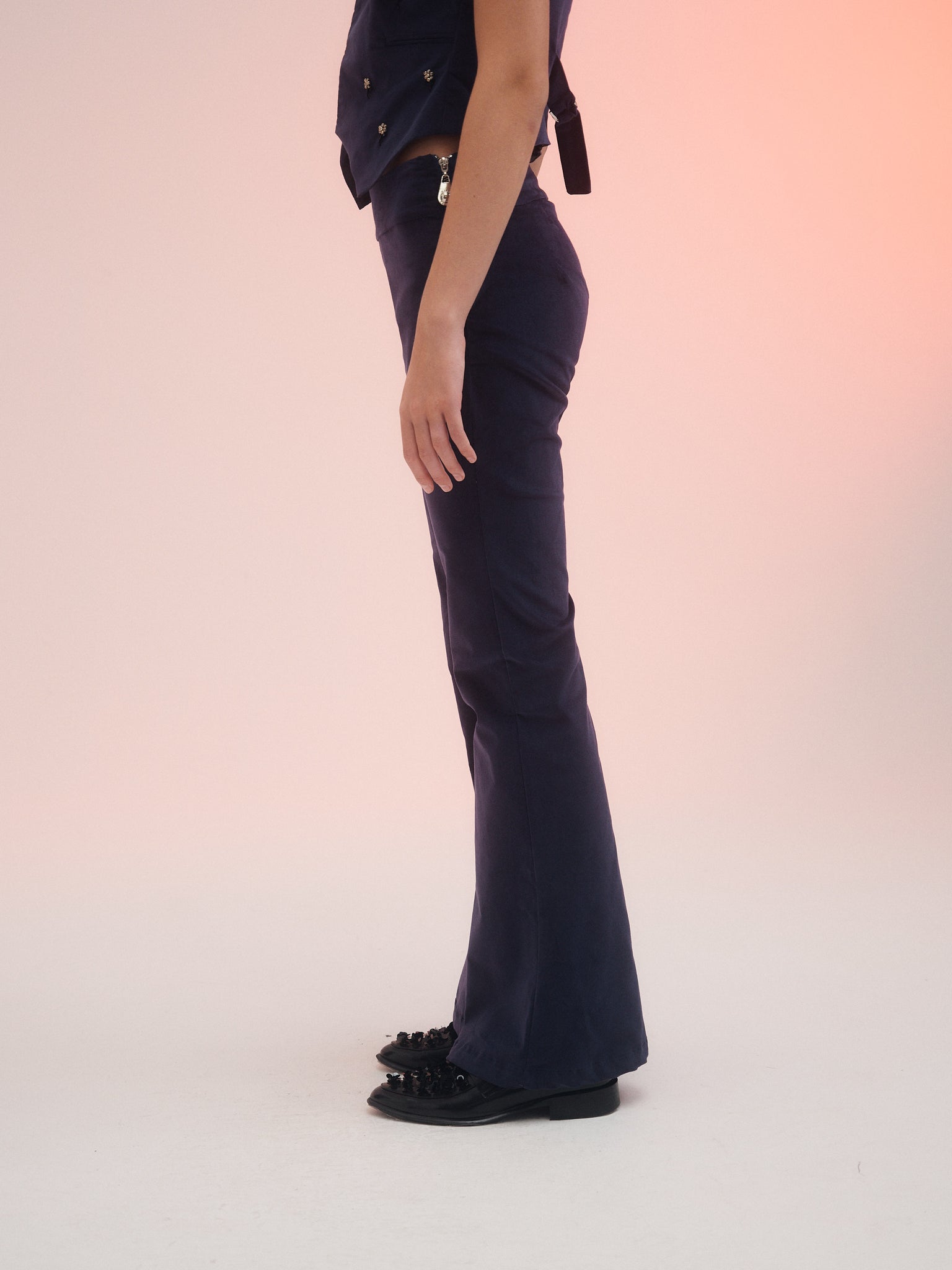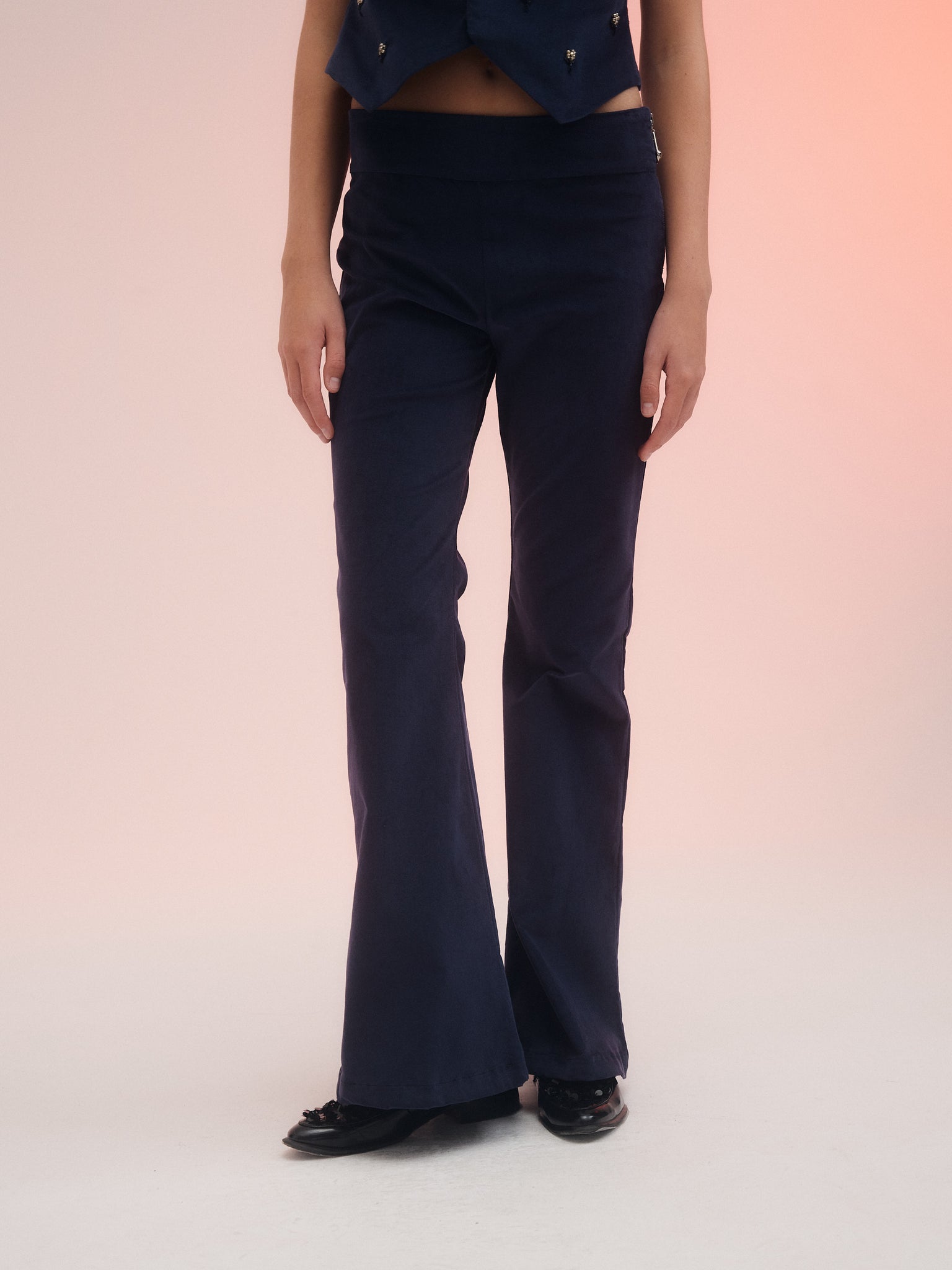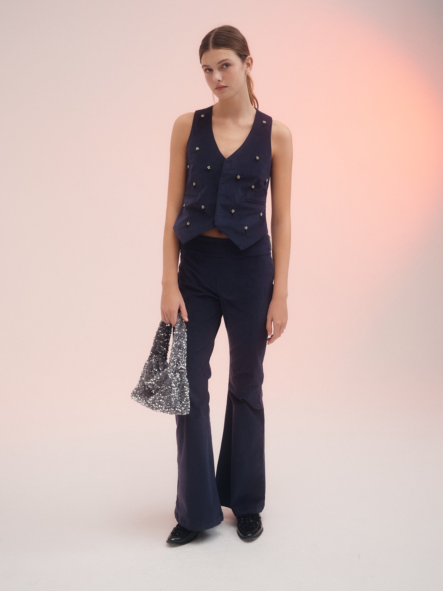 Confeccionado en terciopelo de algodón de alta calidad. Acceso lateral mediante cierre metálico con avíos marcarios. Calce tipo Oxford. Ideal para combinar con el chaleco Daisy.