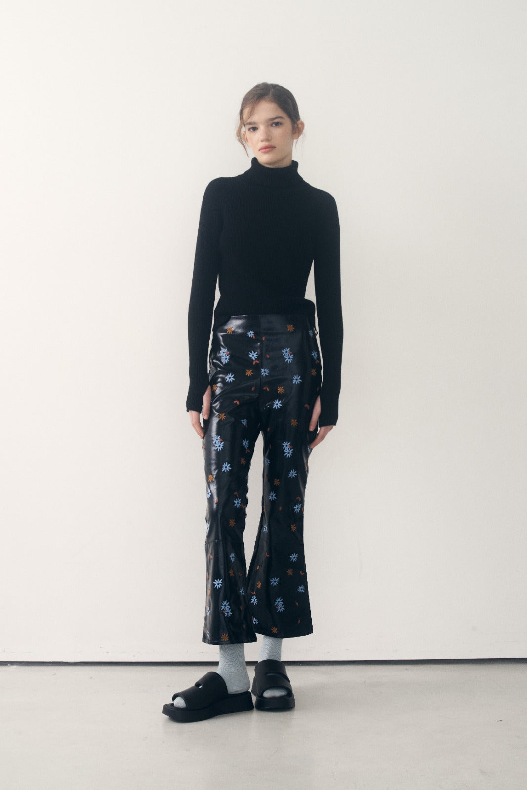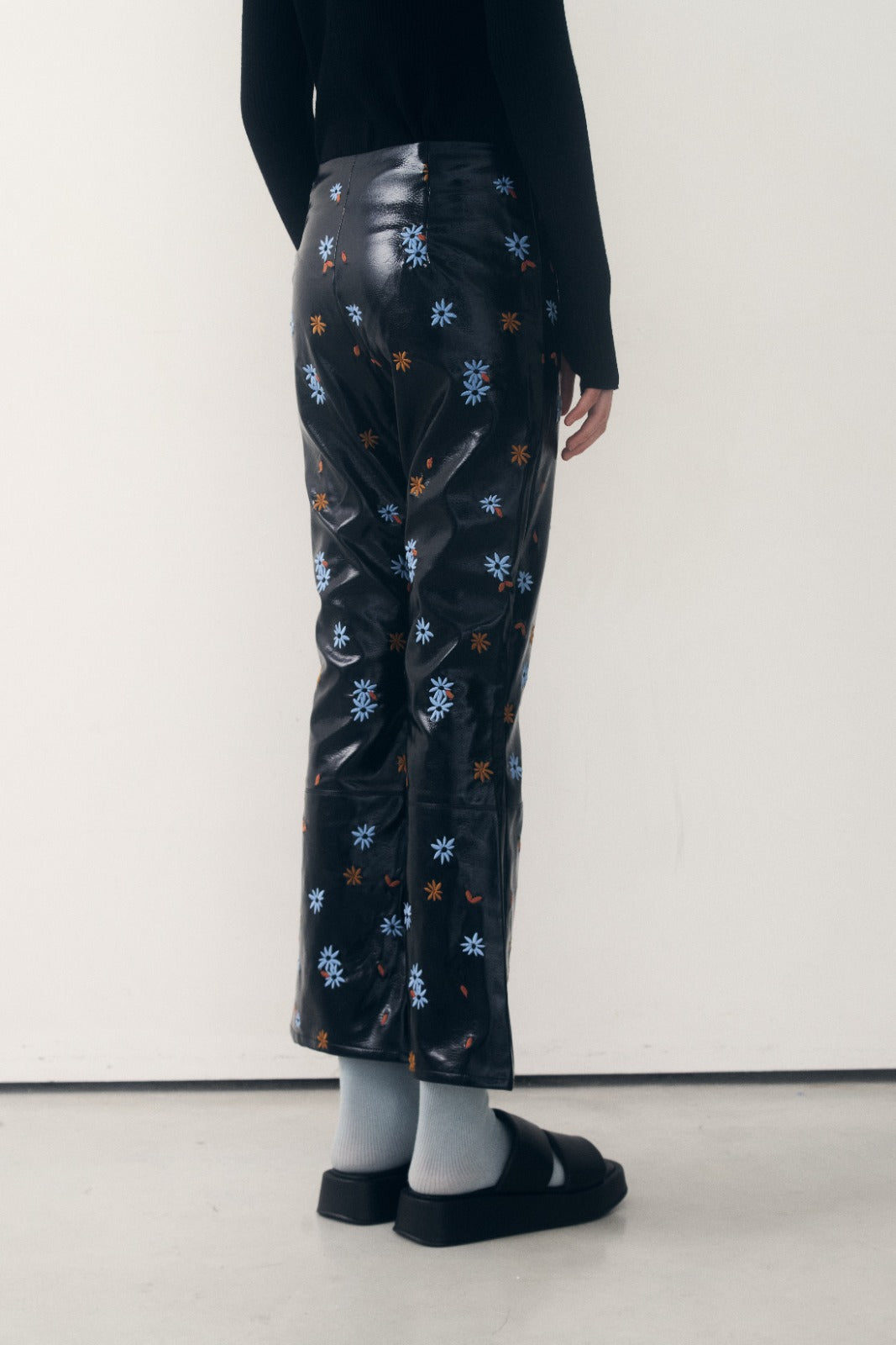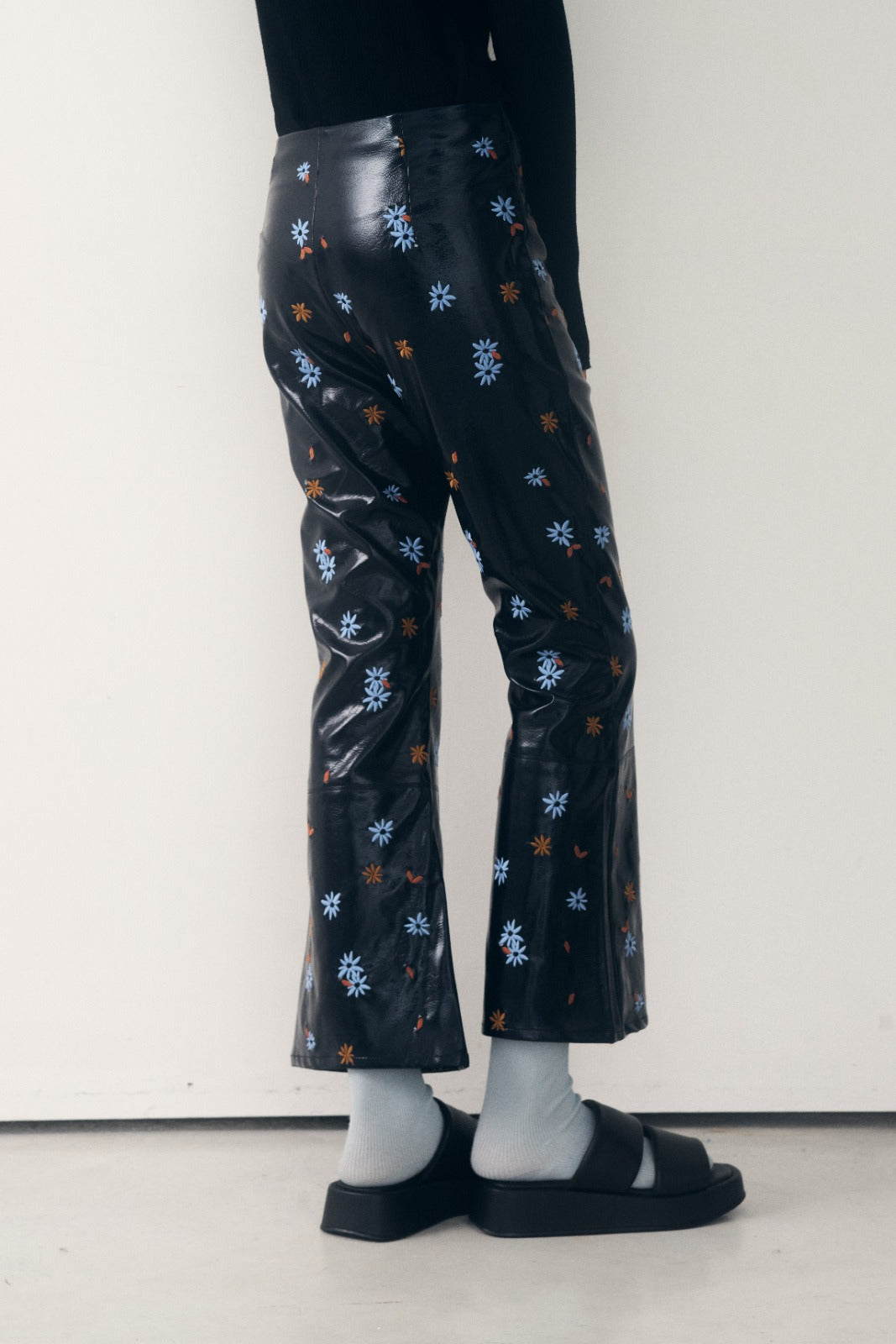 Pantalón confeccionado en cuerina acharolada, íntegramente bordado. Fit ajustado, con recorte en botamanga y largo al tobillo. Posee cierre personalizado en el lateral.