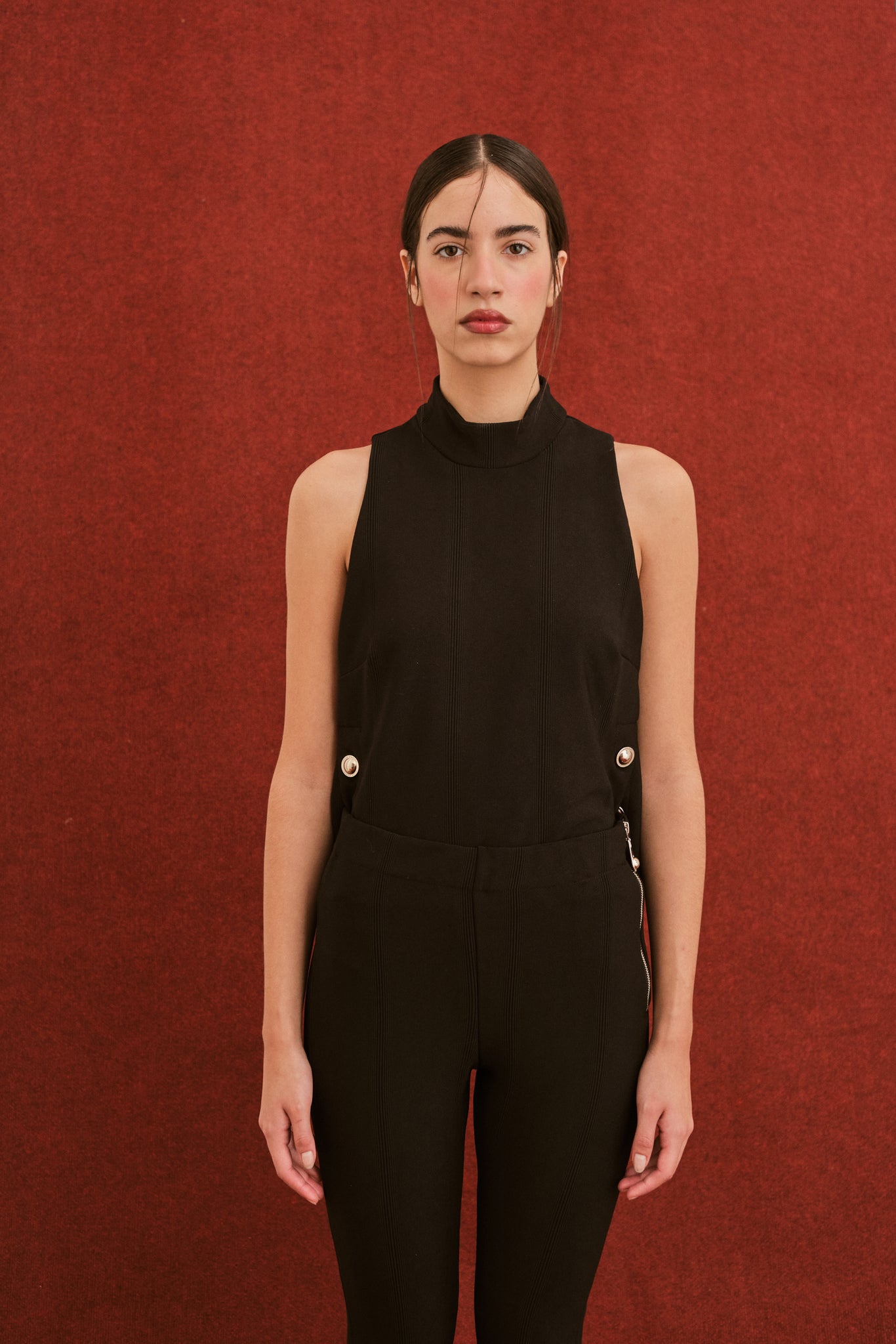Top Etoile con corte tipo media polera, confeccionado en tela de punto con acanalado irregular. Posee recorte con aberturas en laterales y botones personalizados metálicos que aportan carácter a la prenda. Íntegramente forrada y con cierre invisible en espalda lo que facilita el acceso. Úsala por encima de camisas para convertirla en chaleco o bien con el Pantalón ETOILE para un total look. Composición: elastano, poliéster