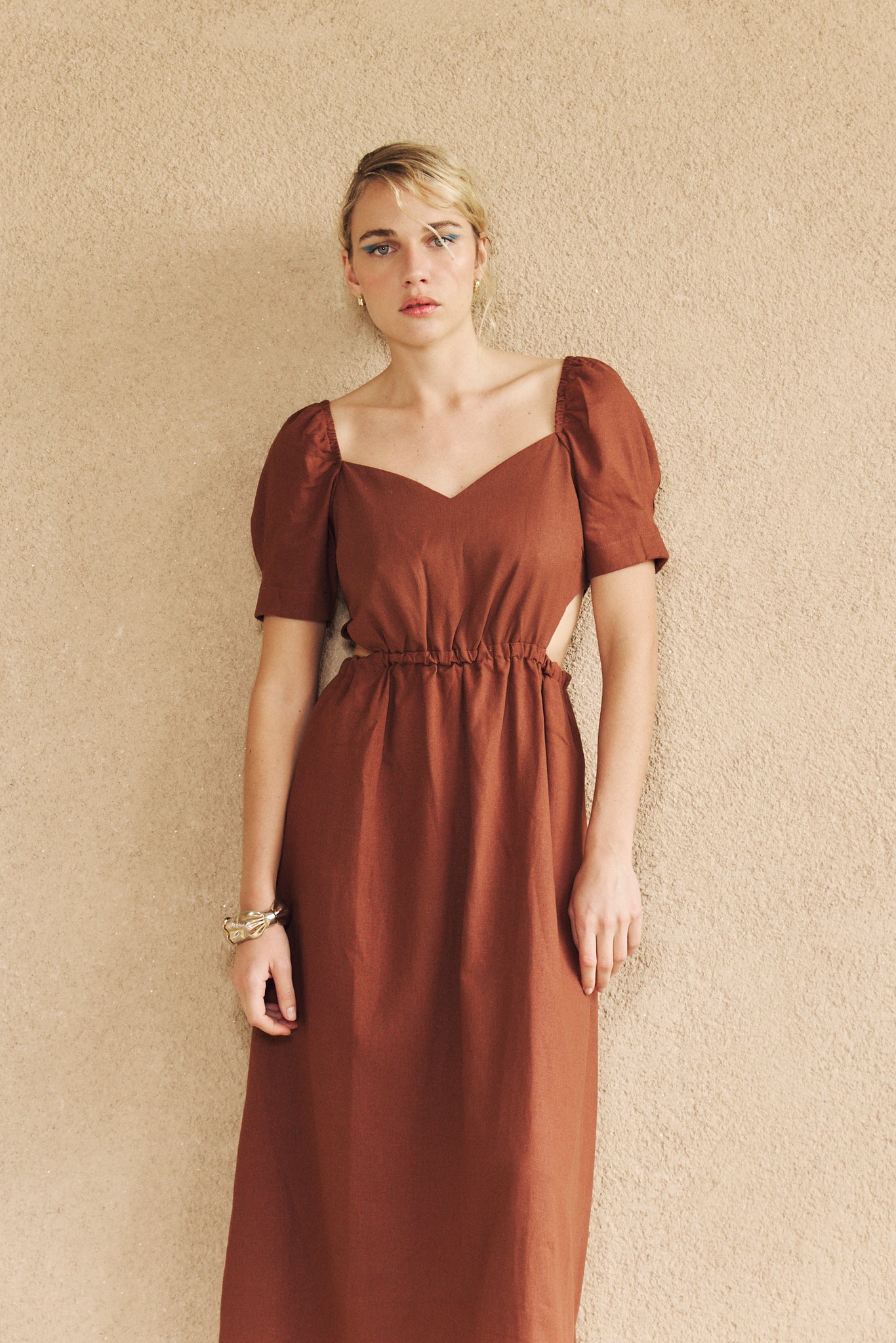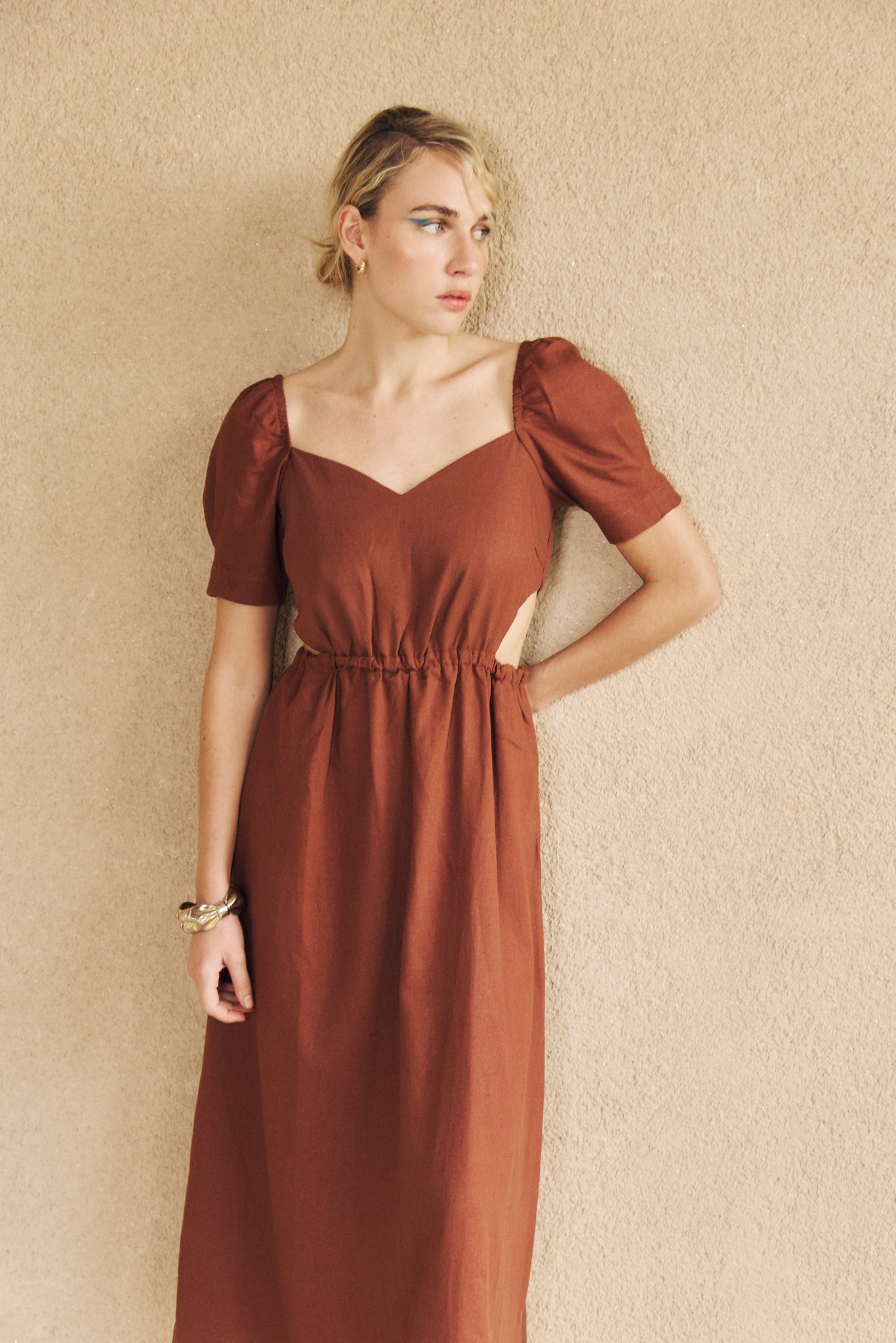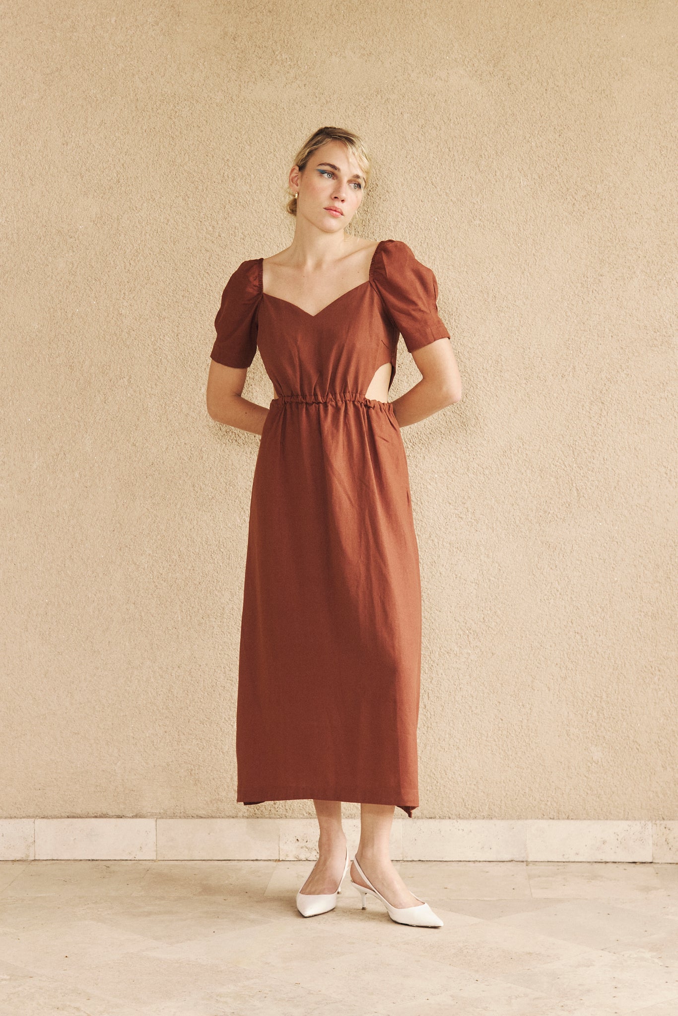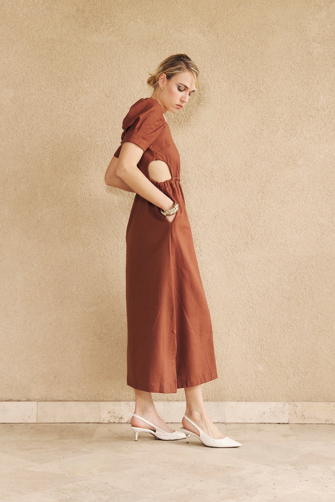 Vestido de lino super romántico. De largo midi, con tajo en laterales y escote cuadrado. Posee mangas con efecto ballon y bolsillos en laterales. También tiene elástico en la cintura-