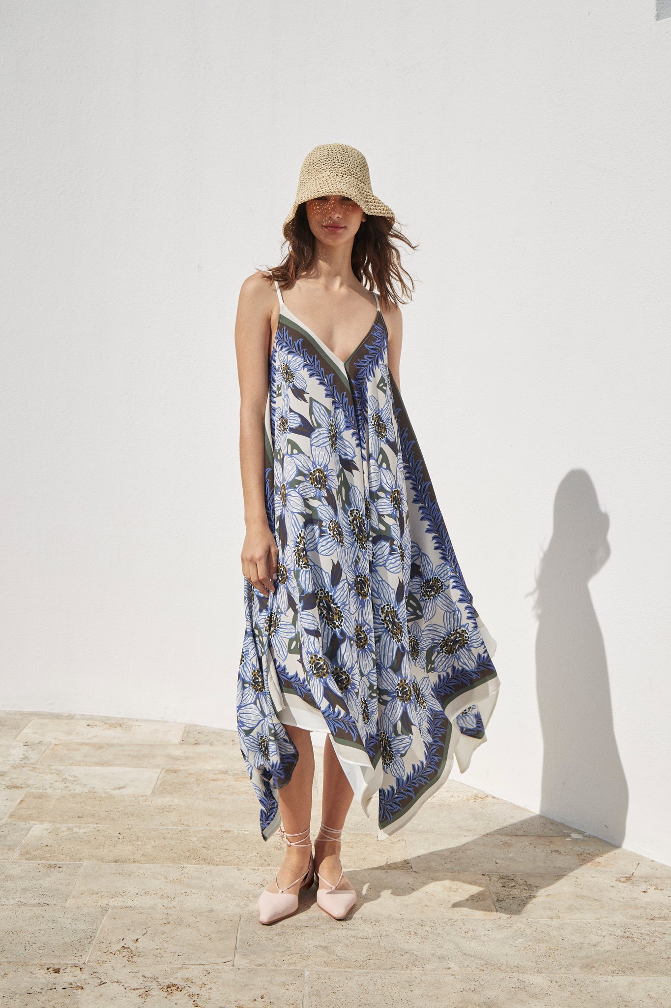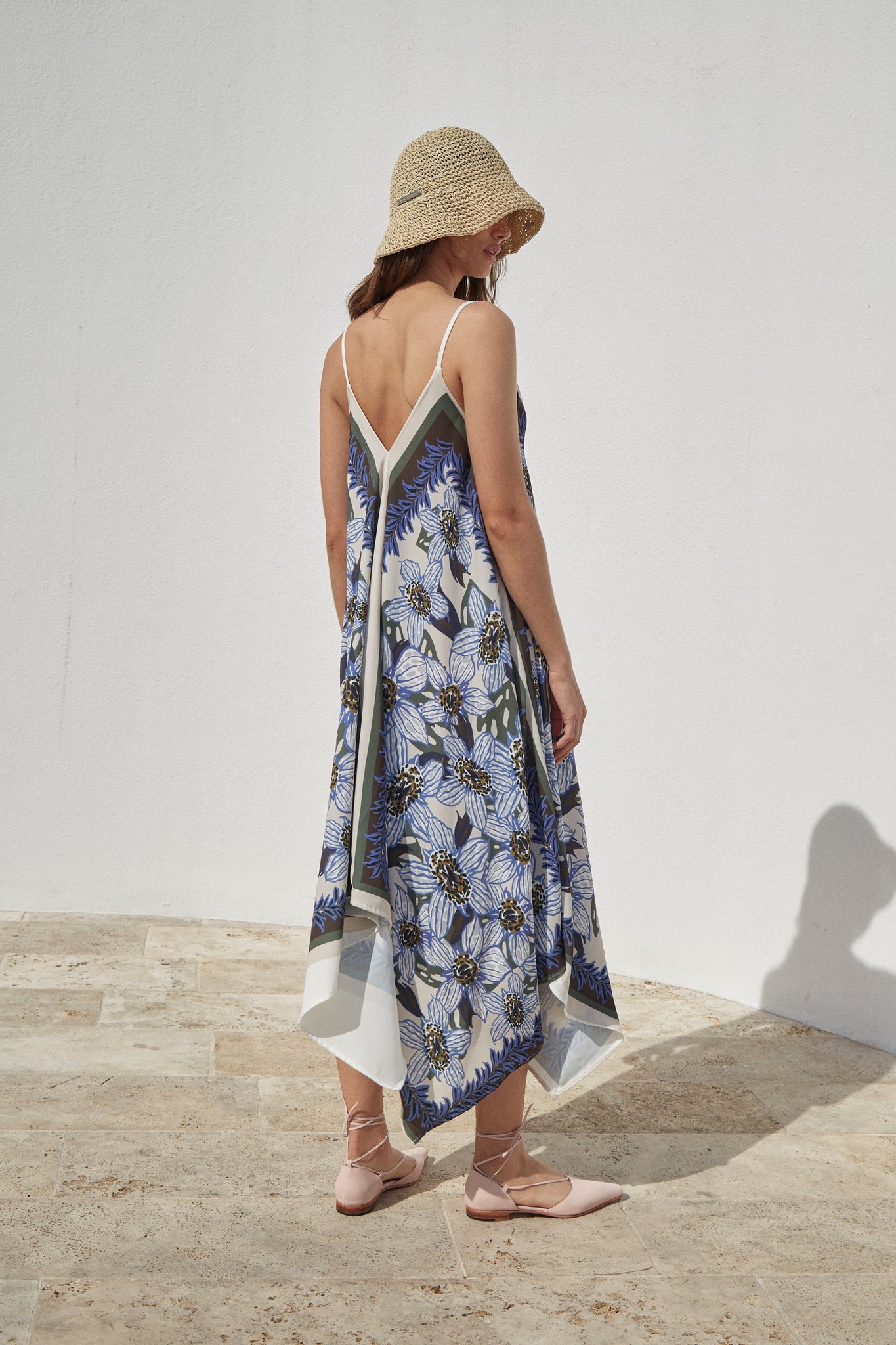 Vestido en creppe con estampa exclusiva de BEYOND THE SEA SS24. Super amplio, en formato pañuelo, con escote delantero y trasero en V y breteles finitos regulables. Largo midi.