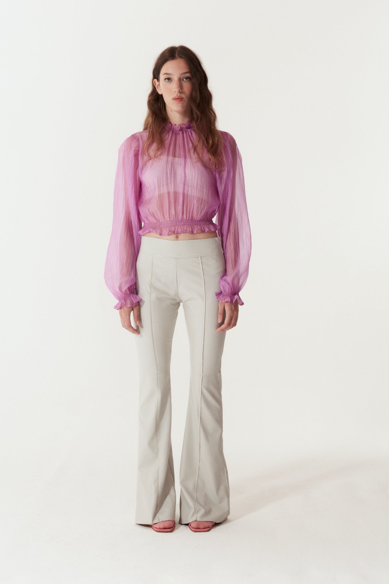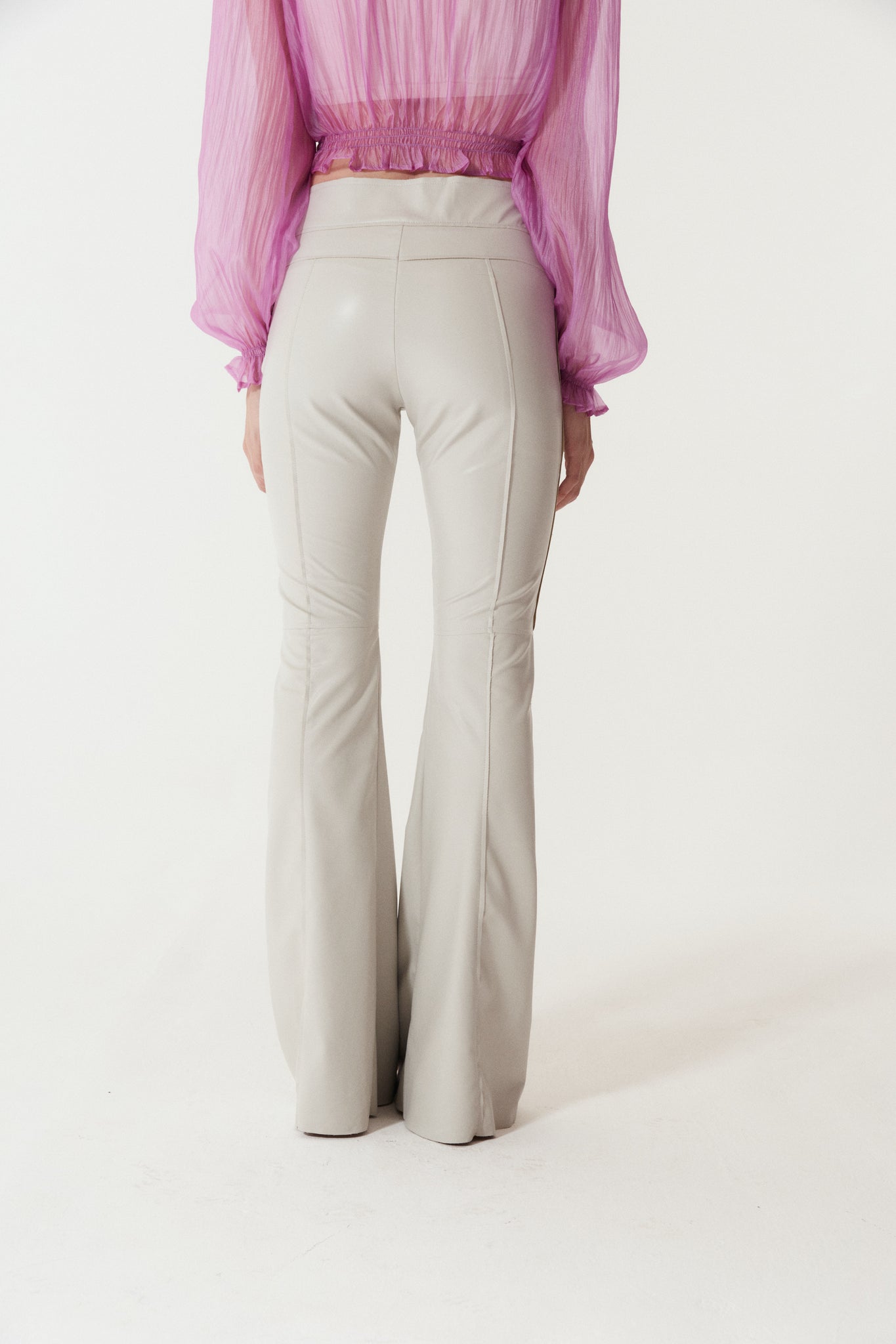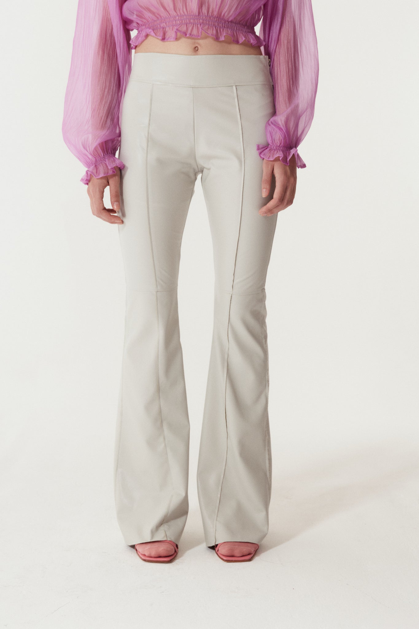Pantalón de cuero ecológico corte tipo oxford, tiro medio, con recortes y cierre metálico.