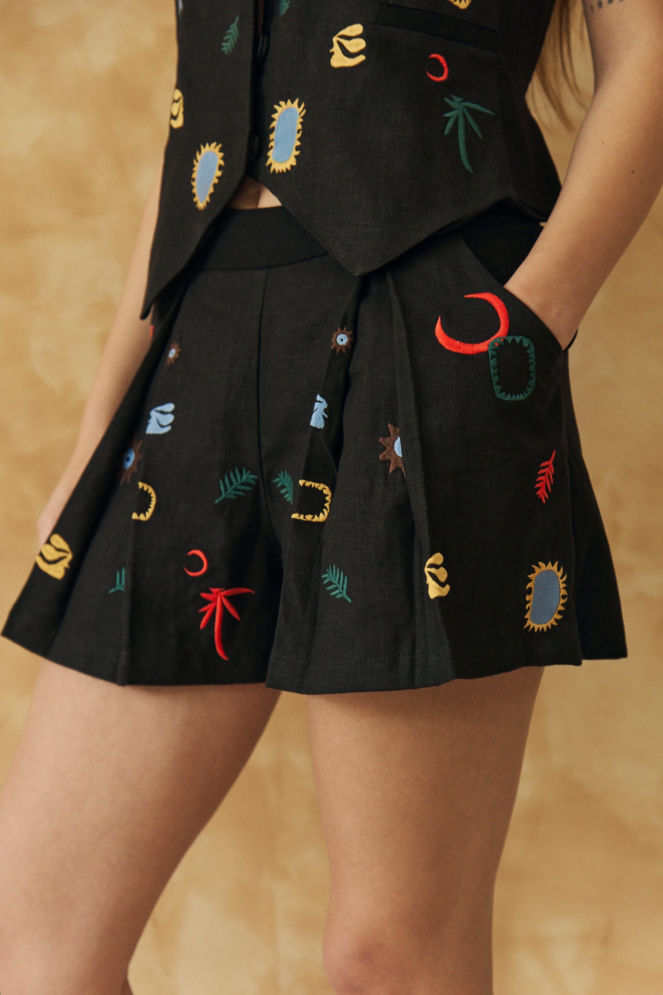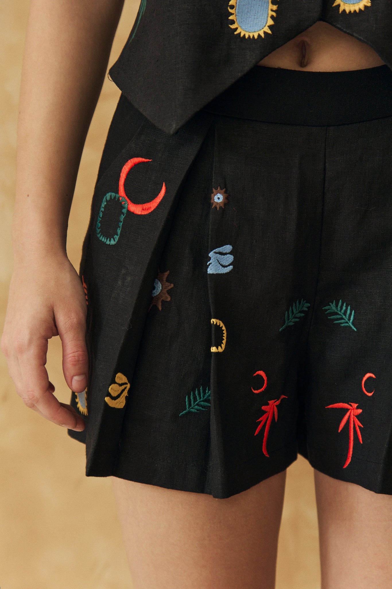 Short de lino íntegramente bordado con ilustraciones referentes a la colección TURISTA SS25. Posee tablas que dan amplitud y bolsillos laterales Ideal para combinar con short ARRECIFE Composición: lino, viscosa.