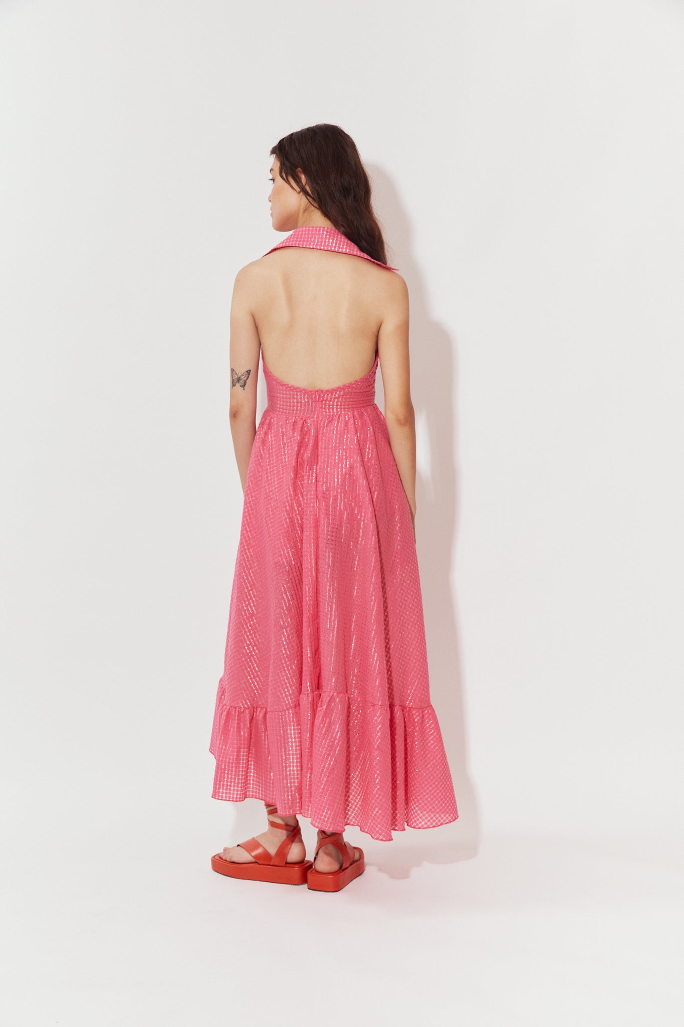 Vestido con corte en la cintura y escote halter tipo camisero. Posee faldón con vuelo y volados. Todo confeccionado en genero mix poplin y organza a cuadros. El tipo de genero aporta un toque diferencial a un vestido de lineas románticas. Ideal para las fiestas.