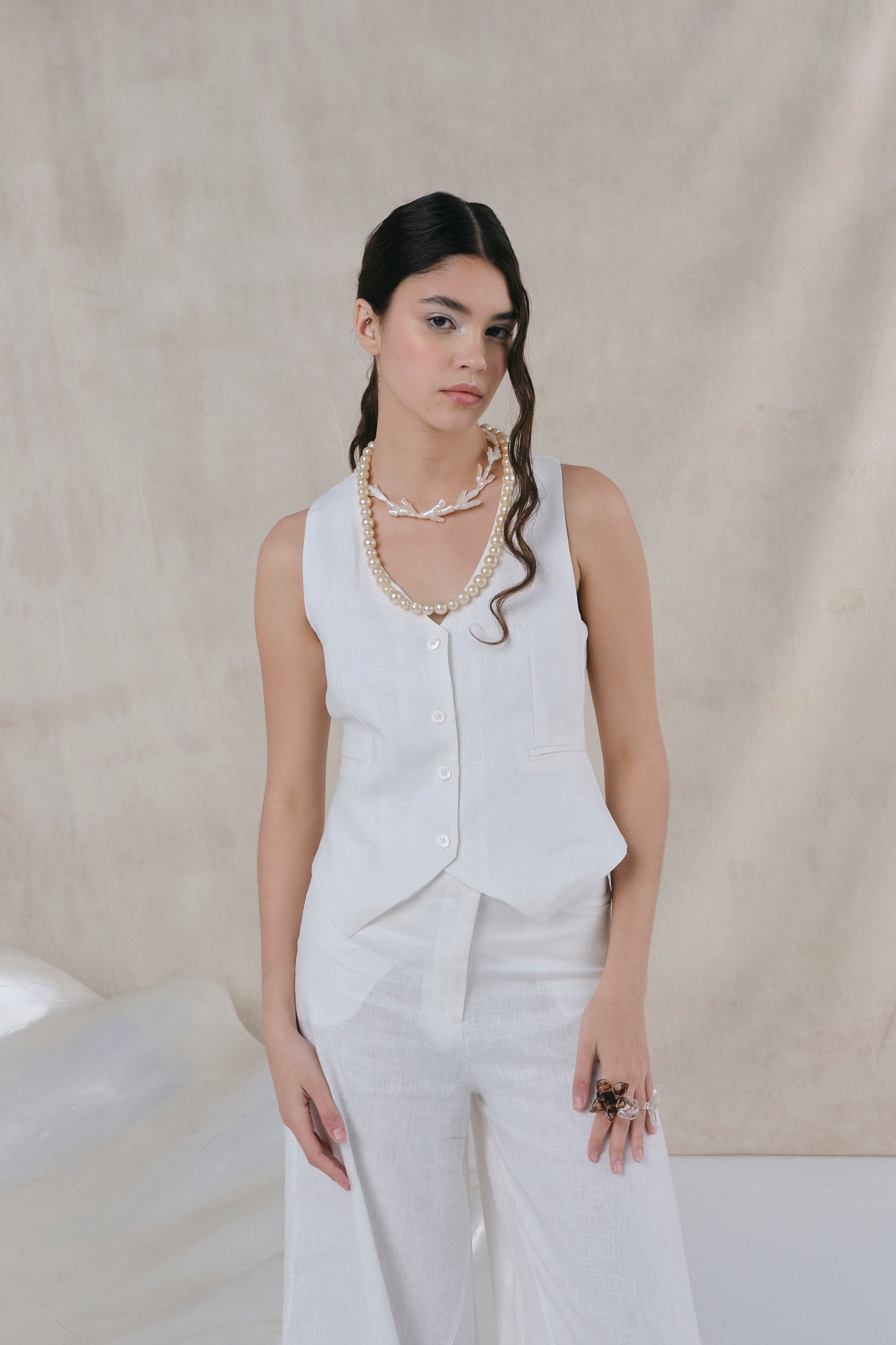 Chaleco sastrero confeccionado en lino 100%. Posee detalle de aplique cortado láser y bordado que aporta un detalle exclusivo a la prenda. Acceso frontal mediante botones de nacarados. Ideal para combinar con pantalón Nácar y lograr un look elegante y sofisticado pero con la ligereza del lino.