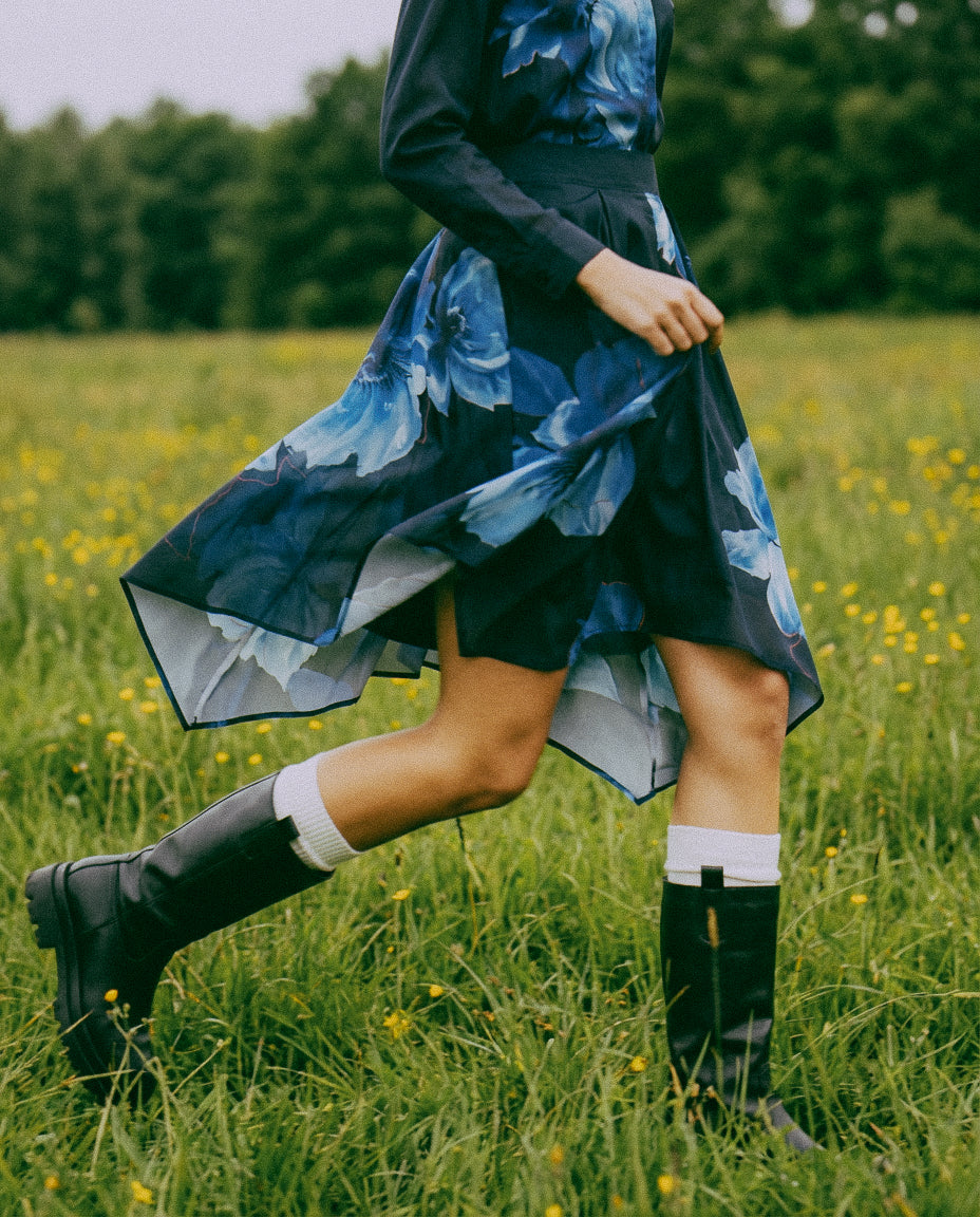 Falda Cosmos, falda midi confeccionada en crepé estampado con ilustracion exclusiva de la temporada aw25. Diseño con picos y tablas en cintura. Ideal para combinar con camisa Cosmos para un total look.