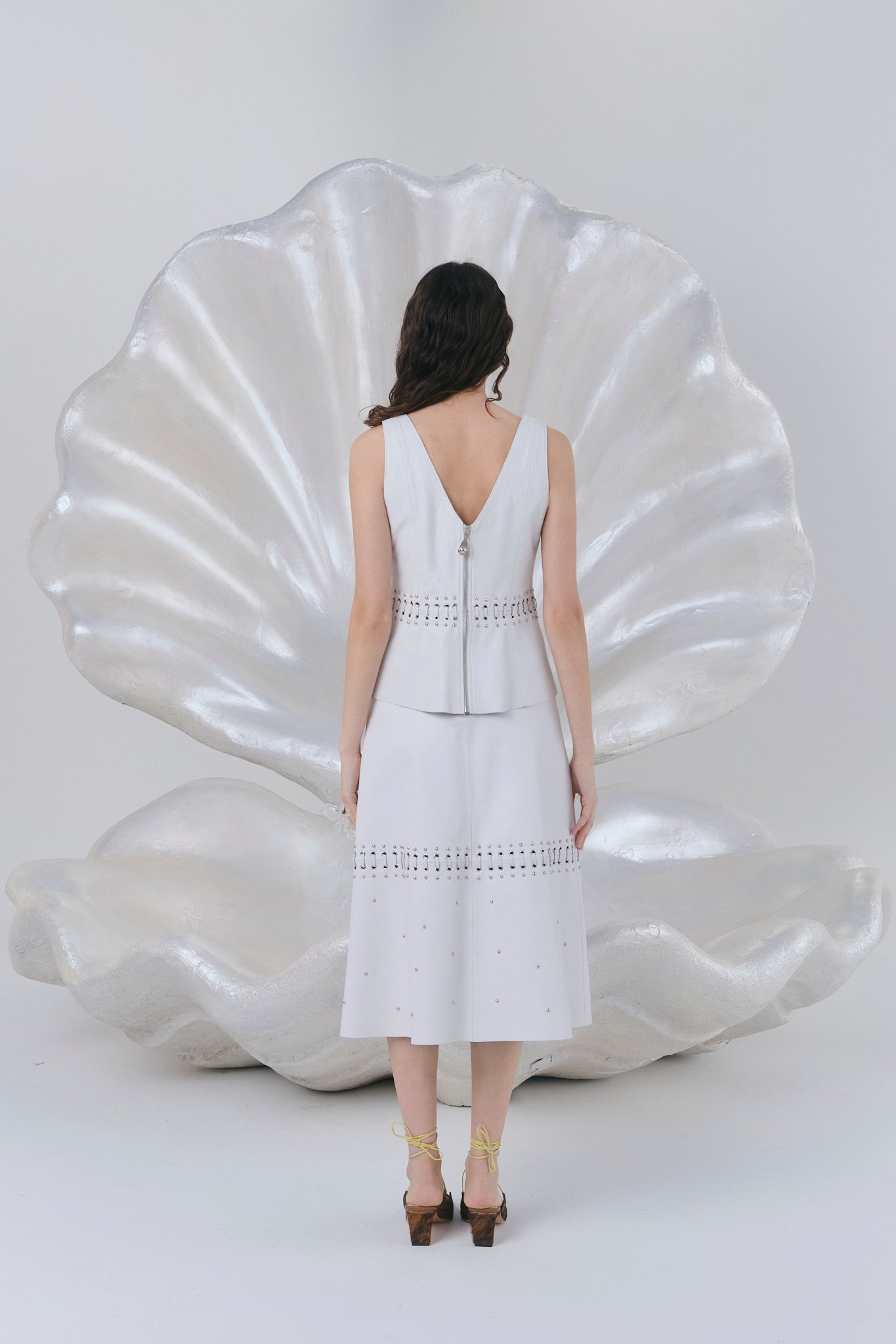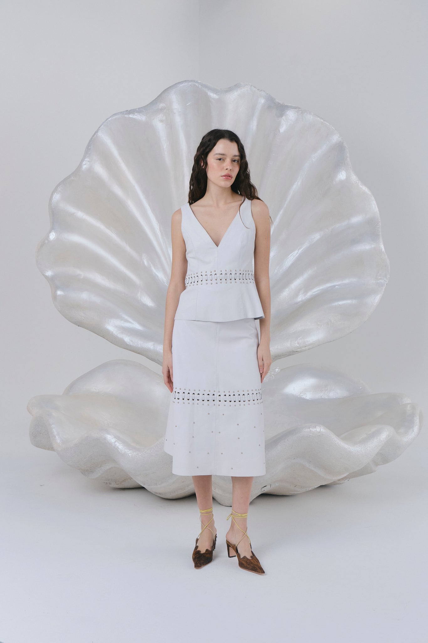 Falda de cuero con recortes, posee detalle de tachas y tiento entrecruzado que aporta a la prenda un look artesanal. Tiro medio y largo midi. Una clásica silueta elevada a una prenda de súper calidad premium.