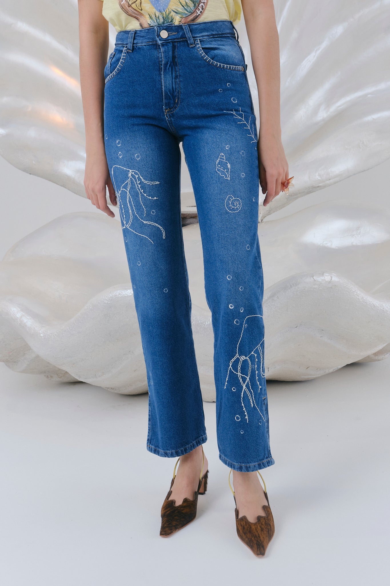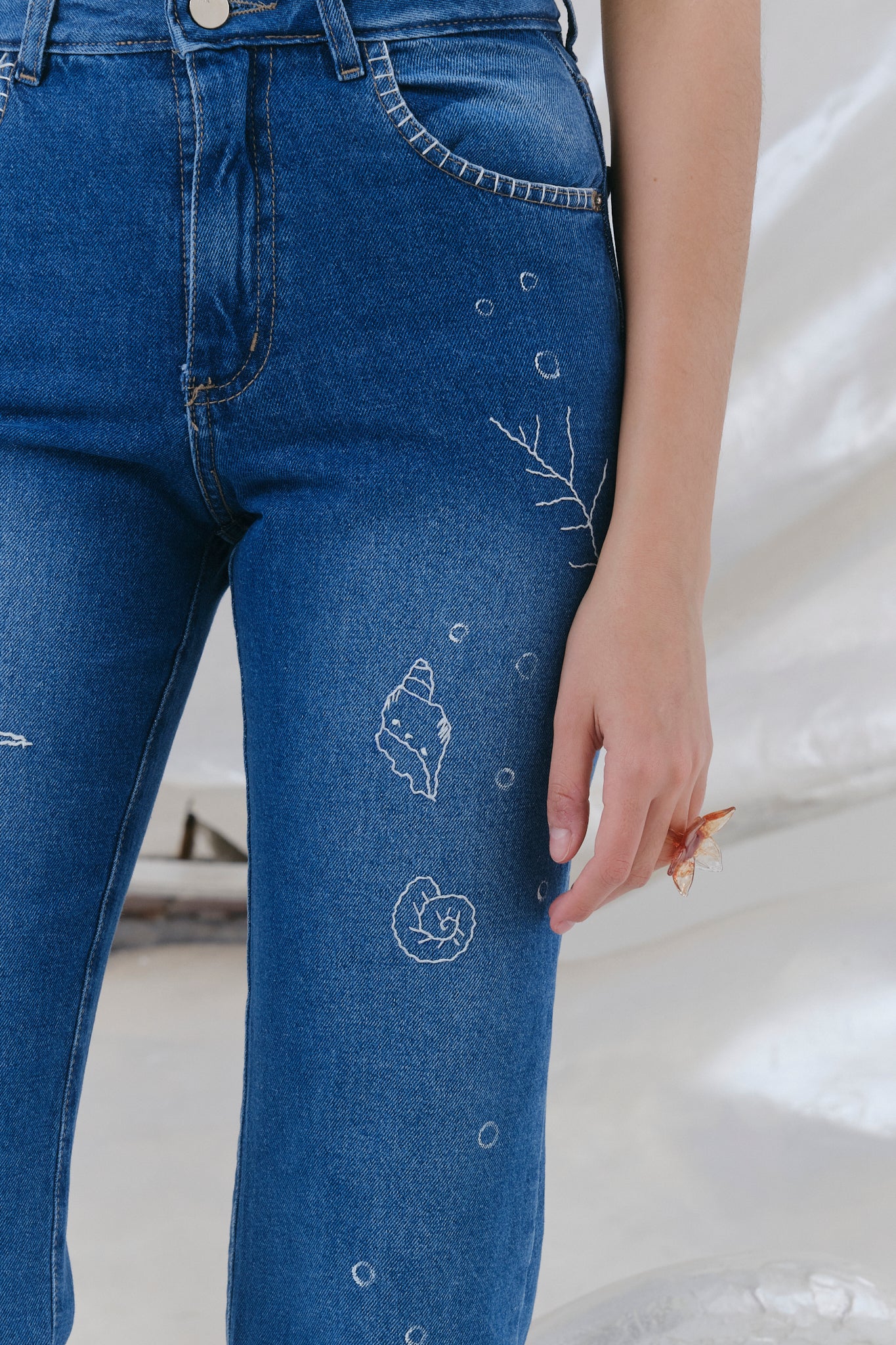 Pantalon tipo 5 bolsillos . Fit recto, tiro medio y largo hasta el tobillo . Detalles jeaneros y bordado a mano en toda la superficie delantera.