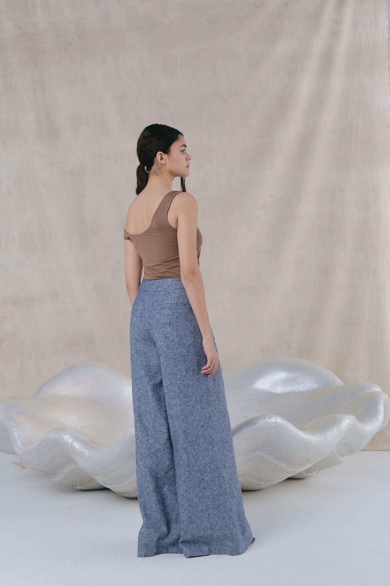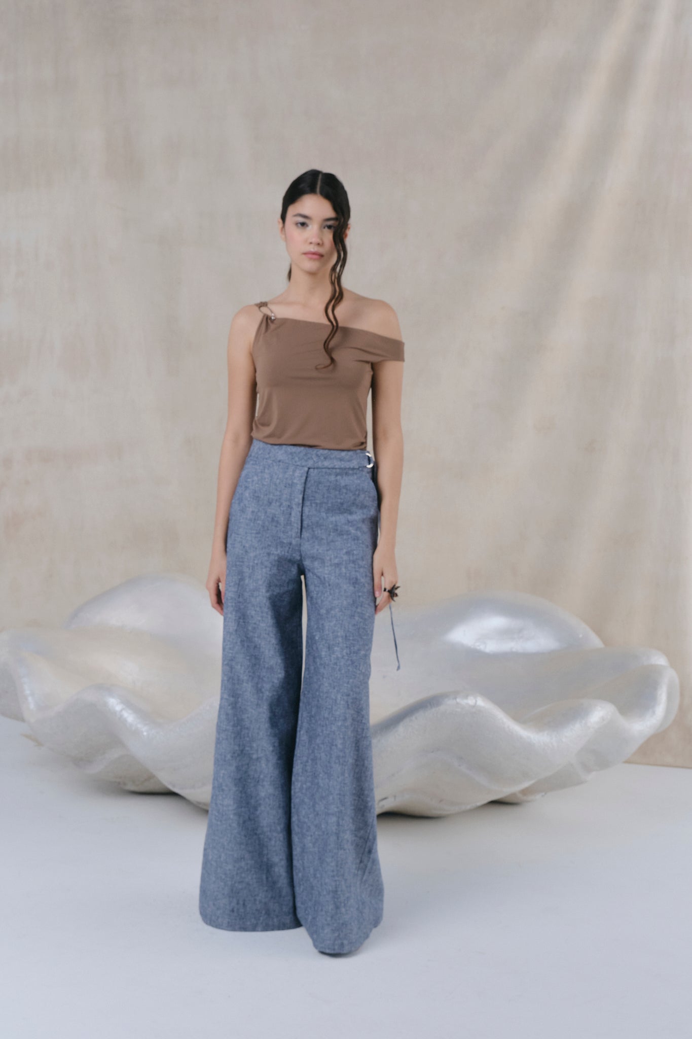 Pantalón de lino con detalle de cintura con lazo y pasaderas metálicas. Fit súper wide y tiro medio. Un ítem atemporal que se ajusta a todos tus looks.