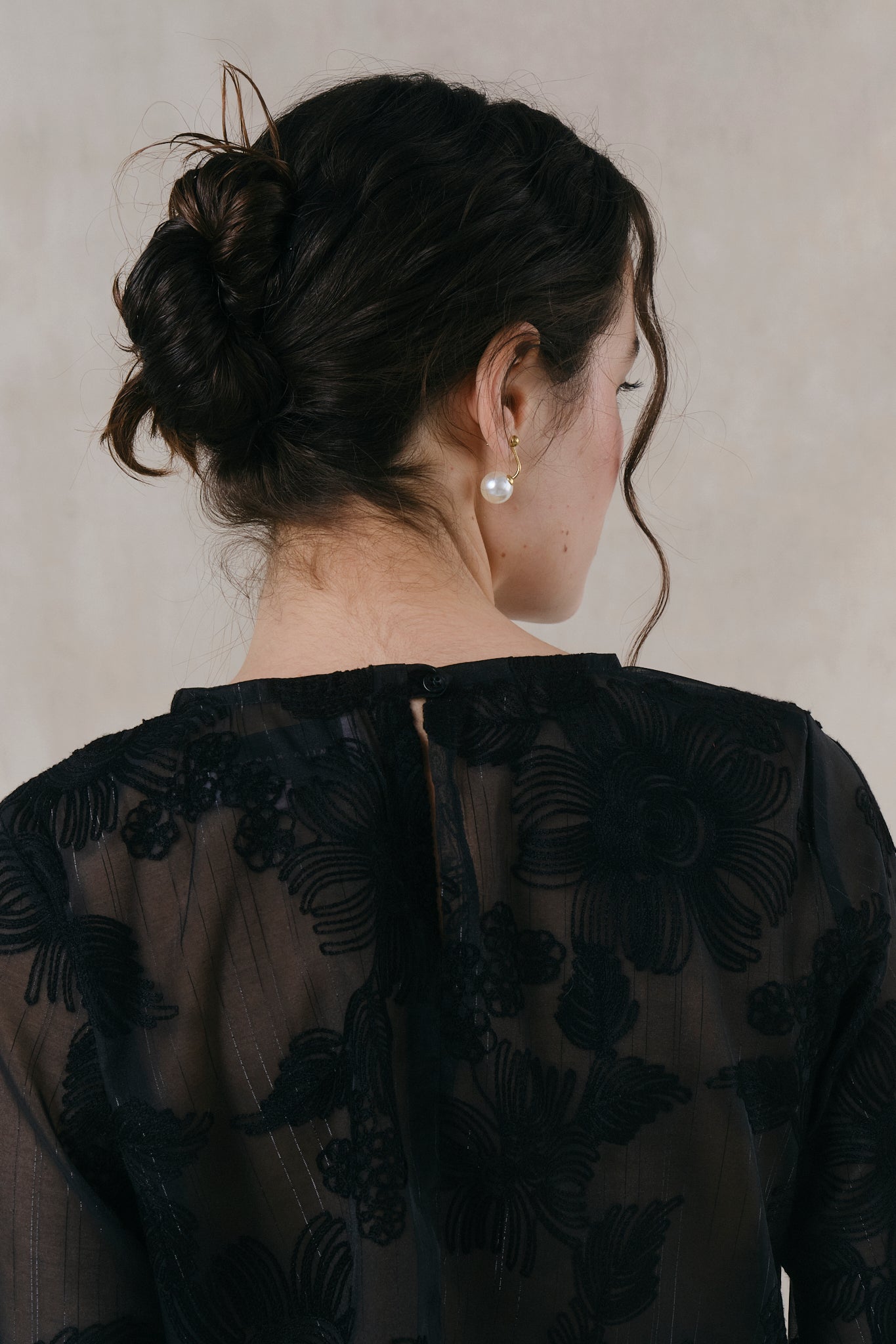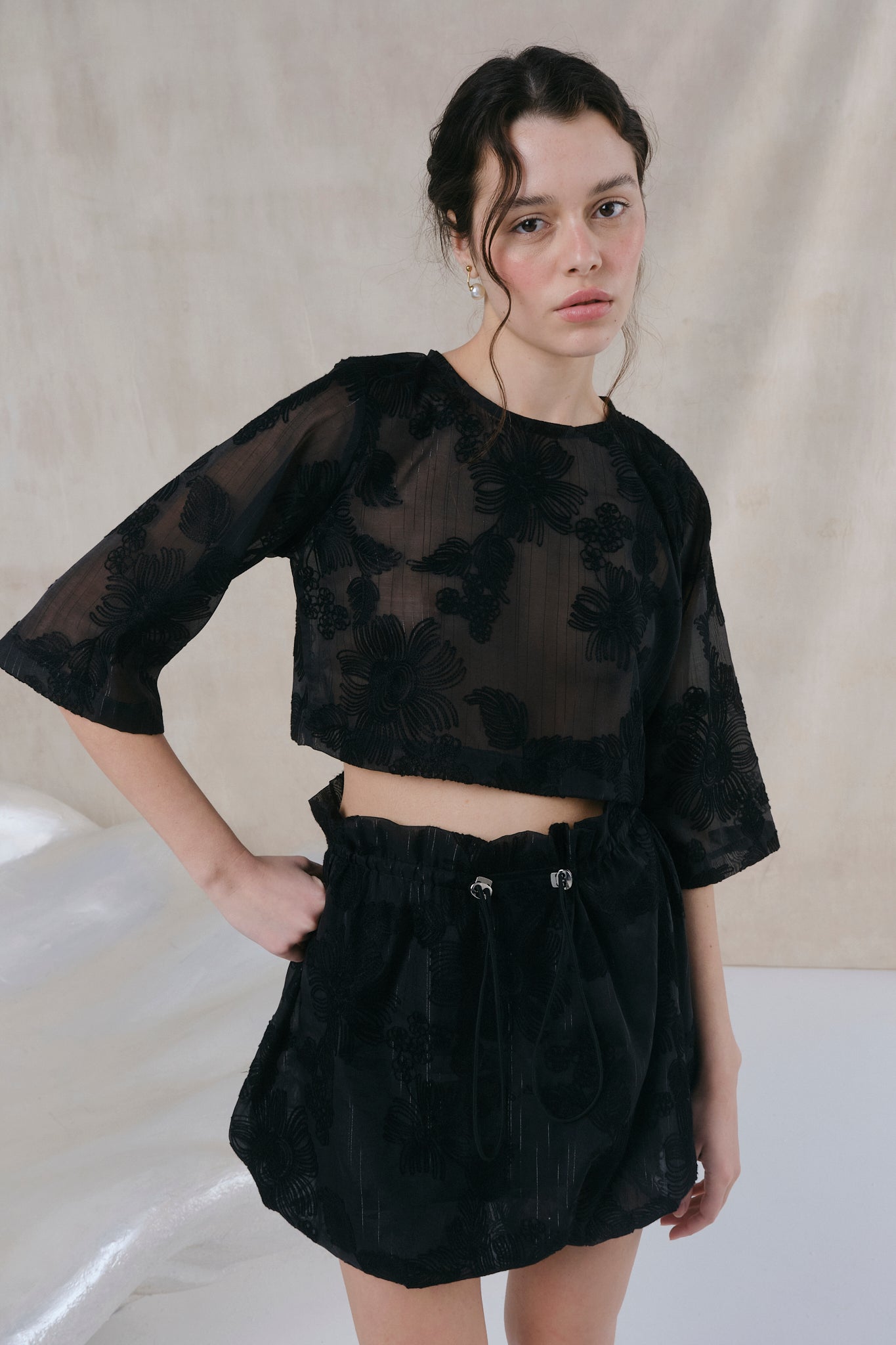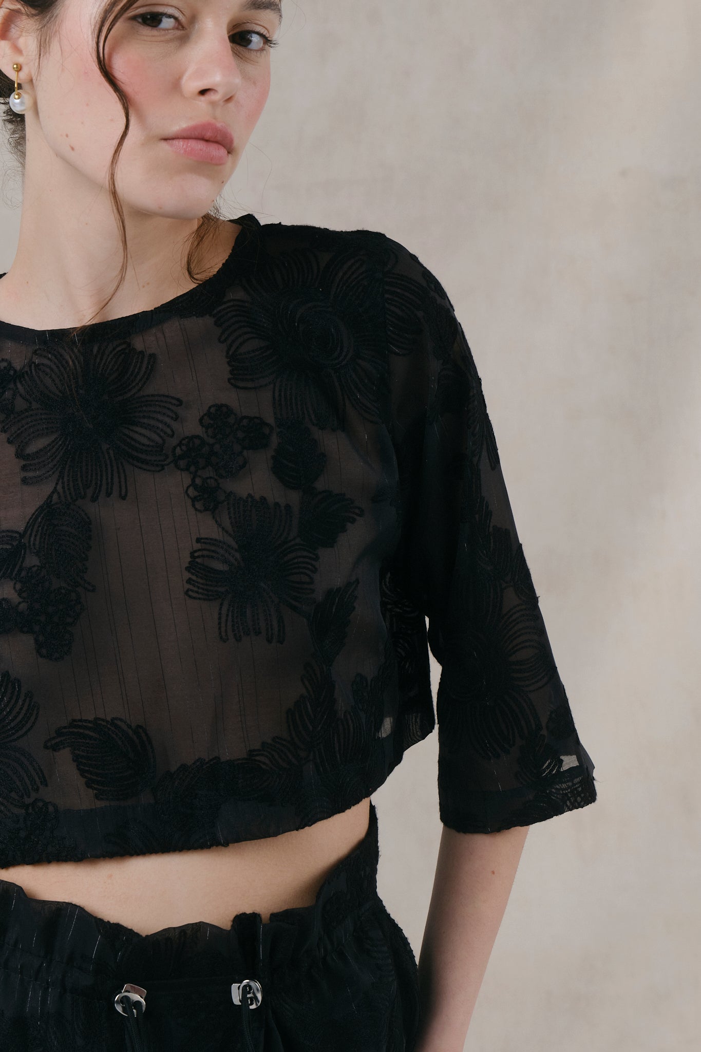 Blusa con manga al codo y escote redondo, confeccionada en organza bordada en hilo. Acceso mediante gota en espalda y botón personalizado. Fit recto de largo cropped. Ideal para combinar con otras prendas de la familia Amara.