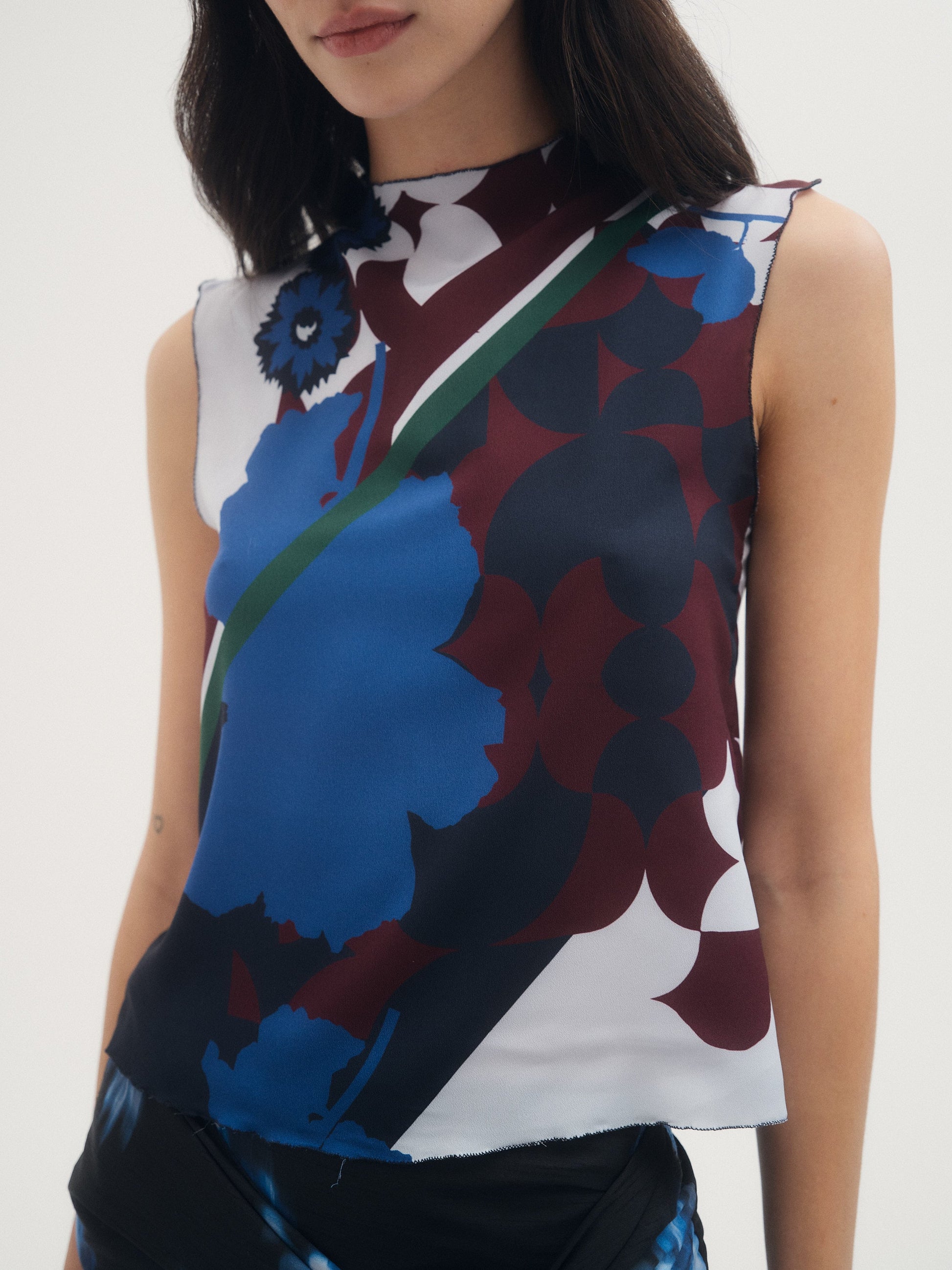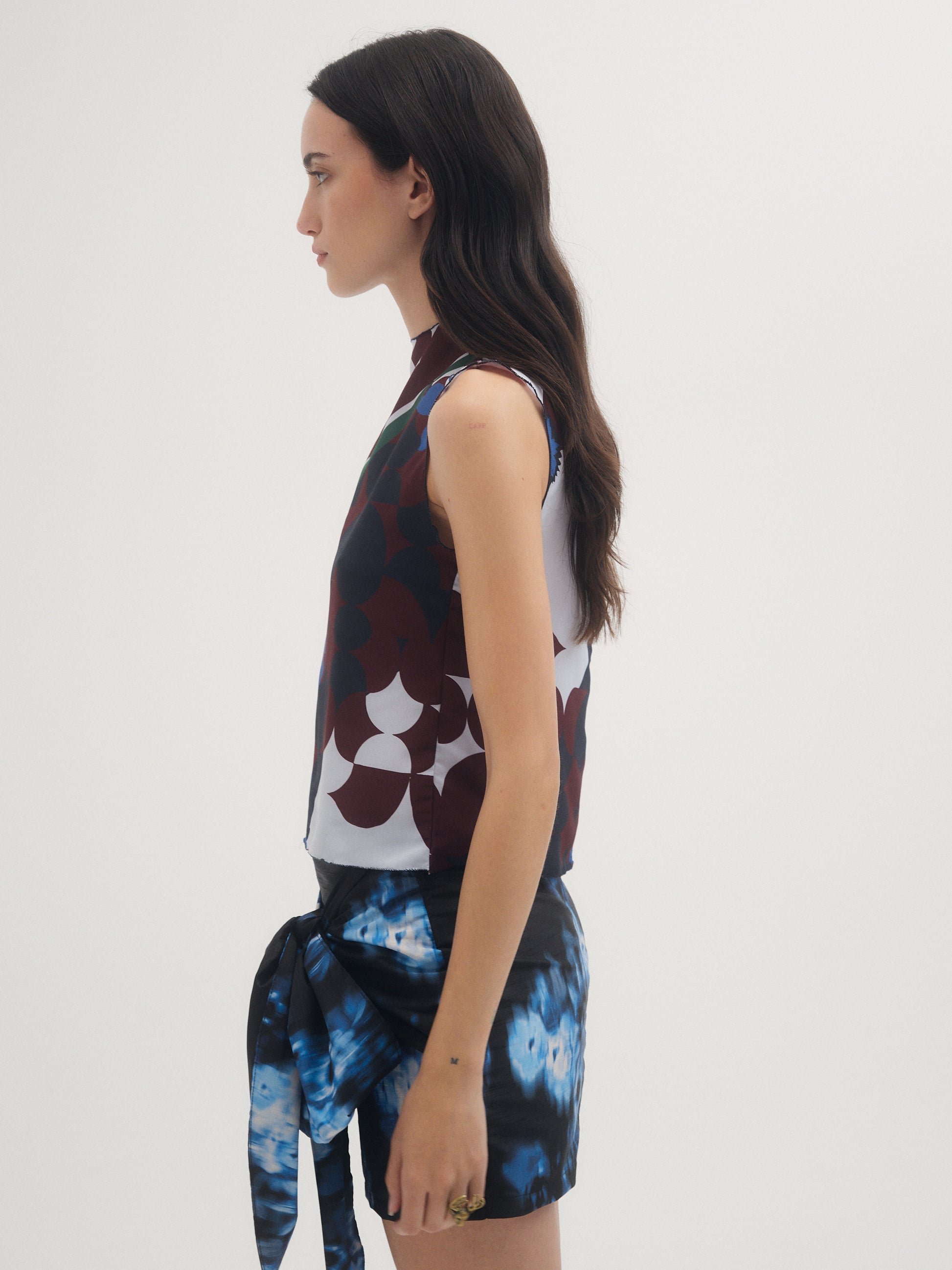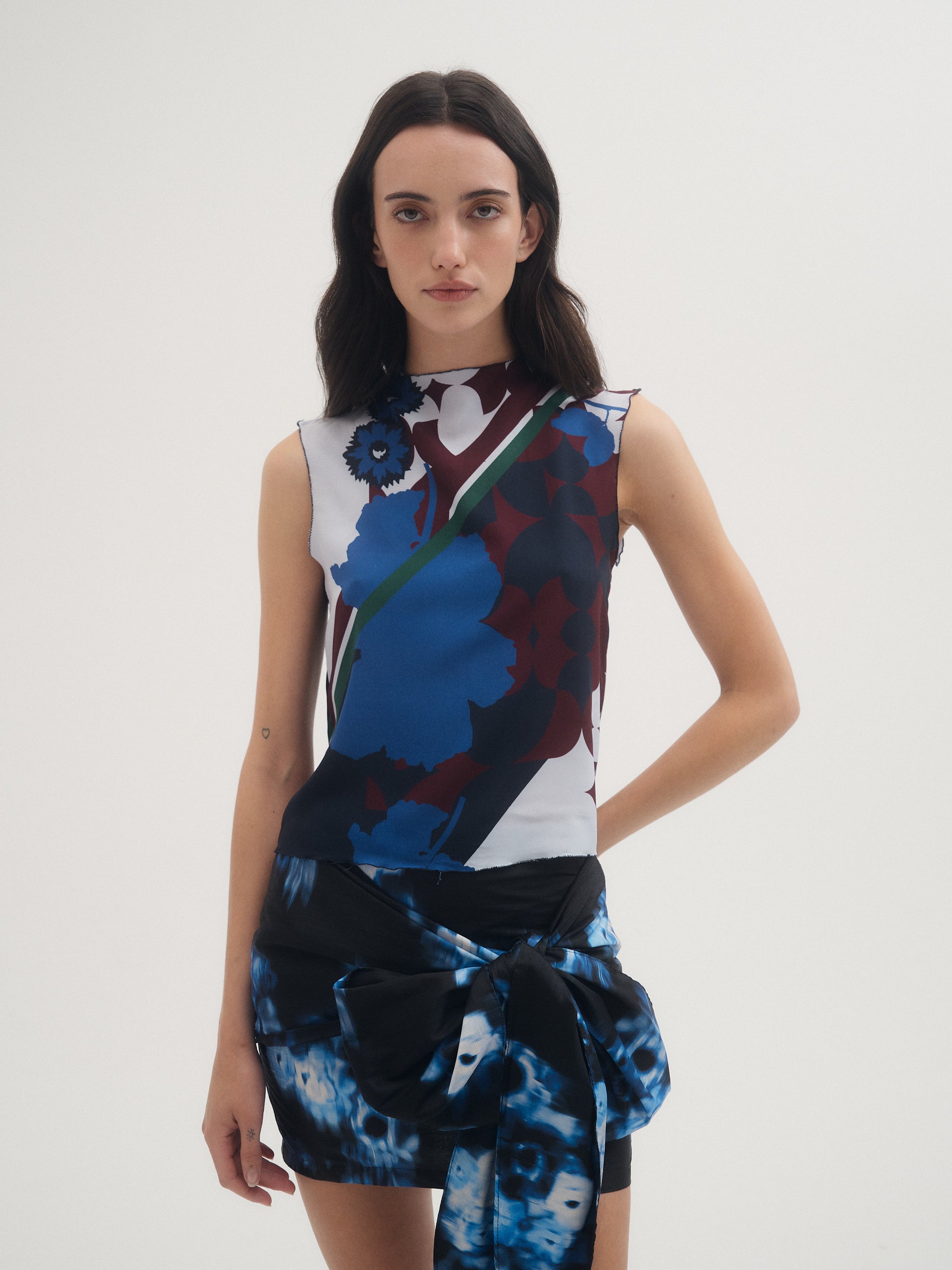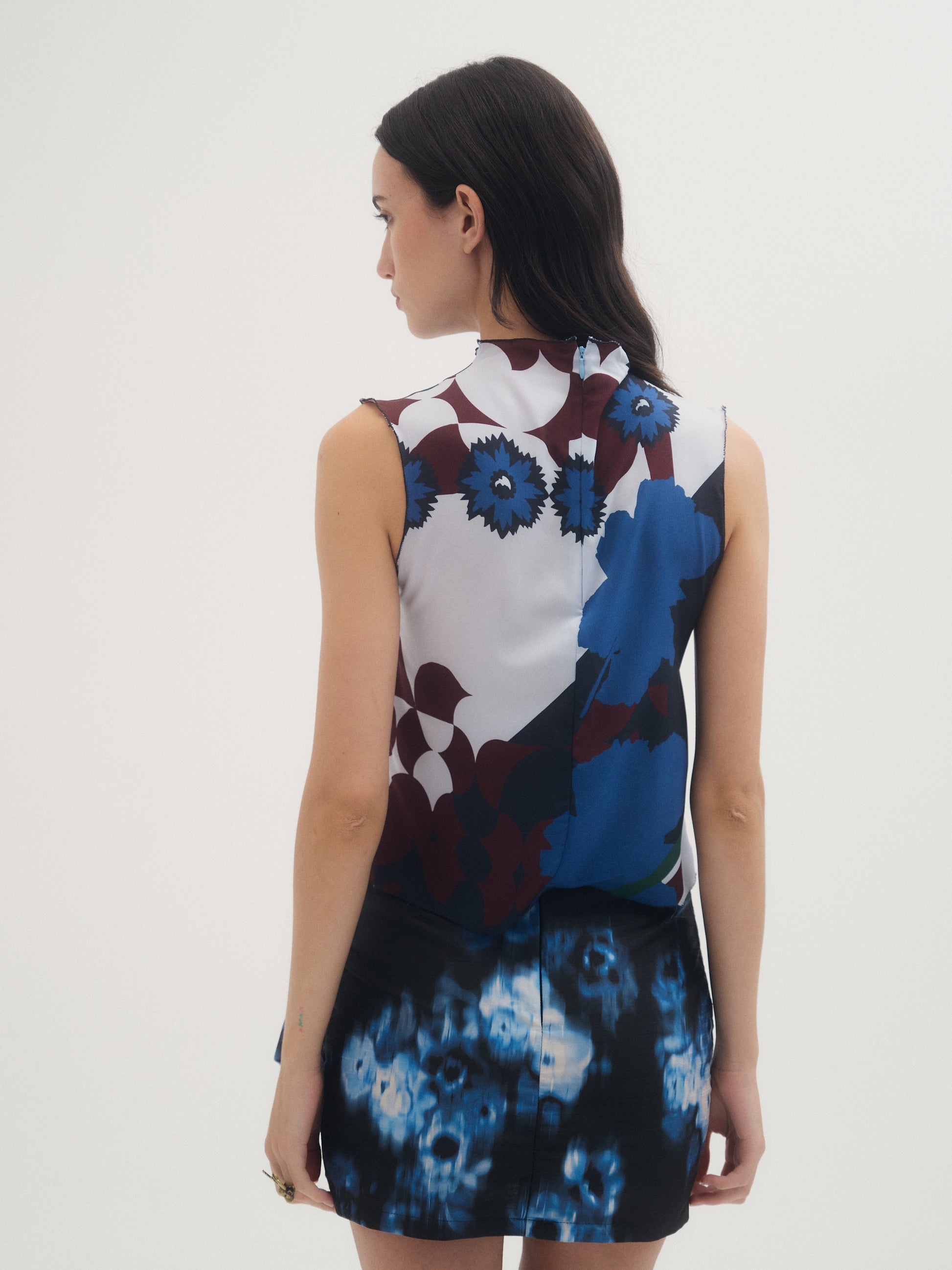 Top Mixxy, Confeccionado en crepe estampado con ilustración de la familia Mixxy exclusiva de la colección DIFFUSE. Detalle de rulotte en escote y sisas. Acceso mediante cierre invisible en espalda.
